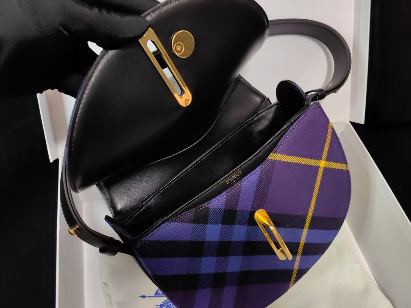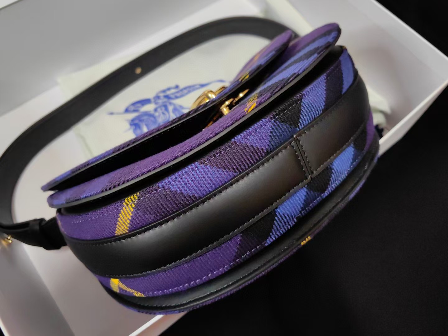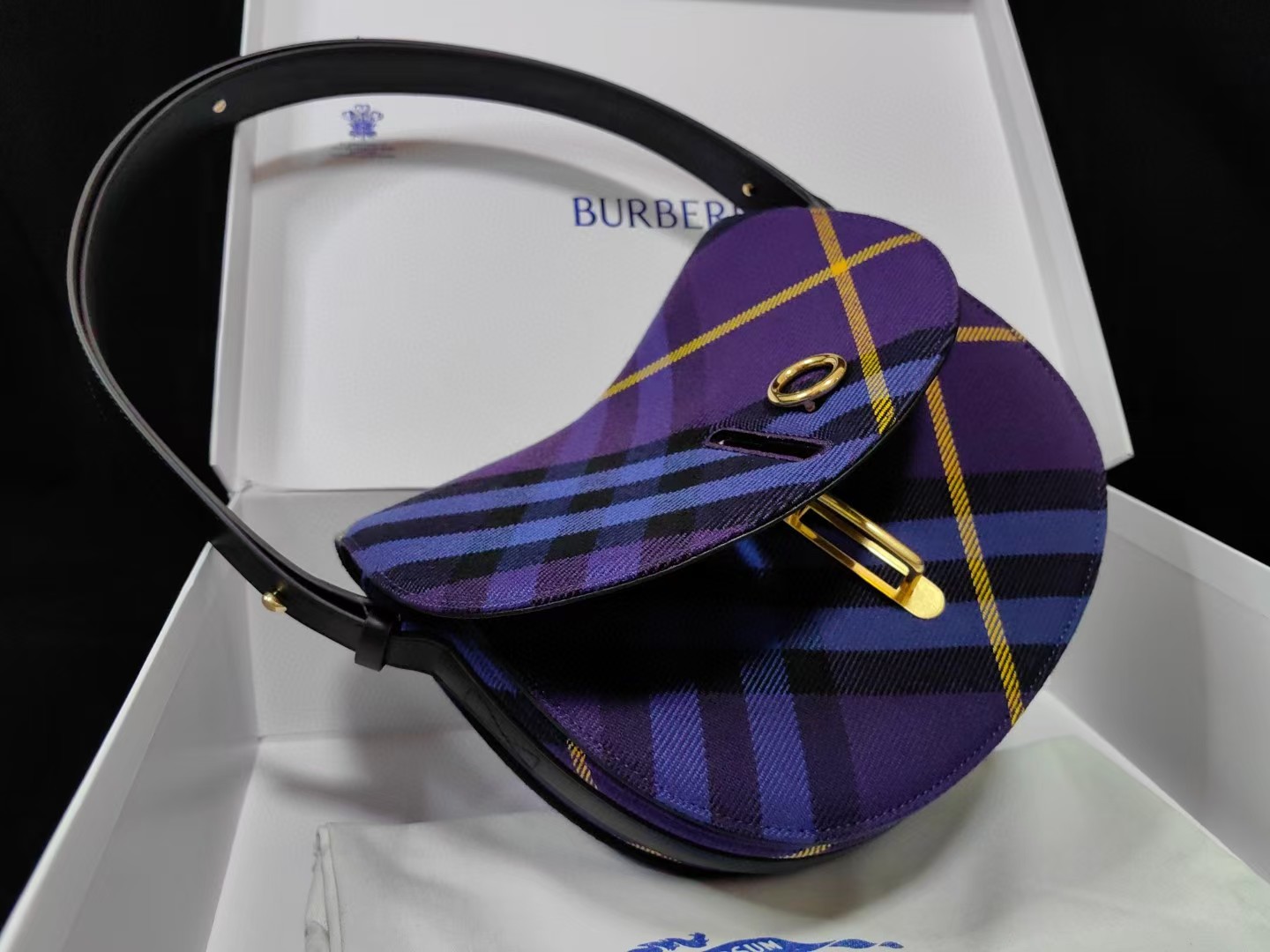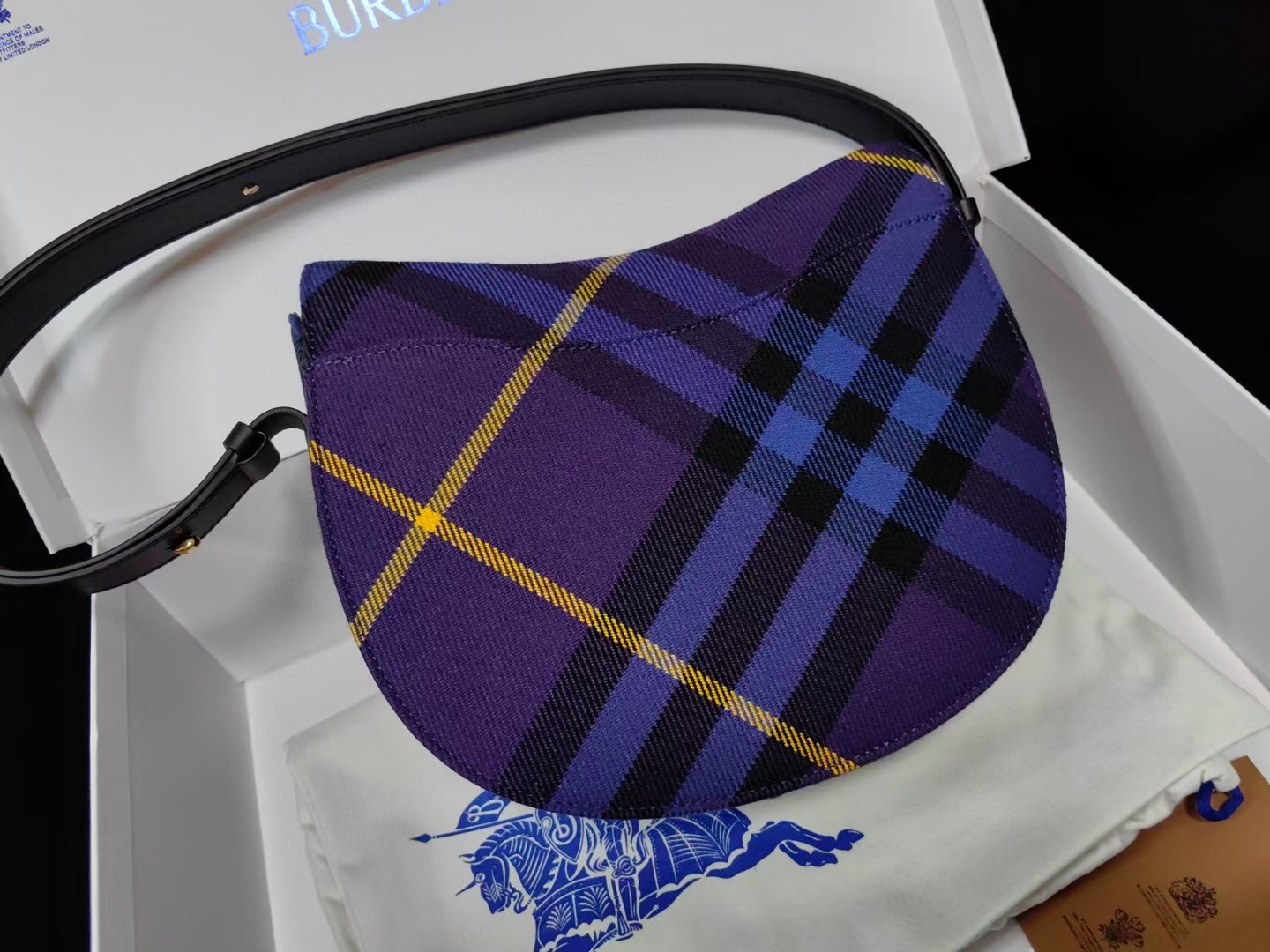 【介绍】 海外原单 新款上架!Bur精纺格纹毛立挺包款,于意大利工坊精制而成,弧形轮廓的设计灵感来自童年摇摆木马,翻盖开合设有 b 字型配件。设有皮革肩背带,可调节切换肩背包和斜背包造型。可调式皮革肩背带,顶部翻盖设有 b 字型开合,内插袋;外插袋