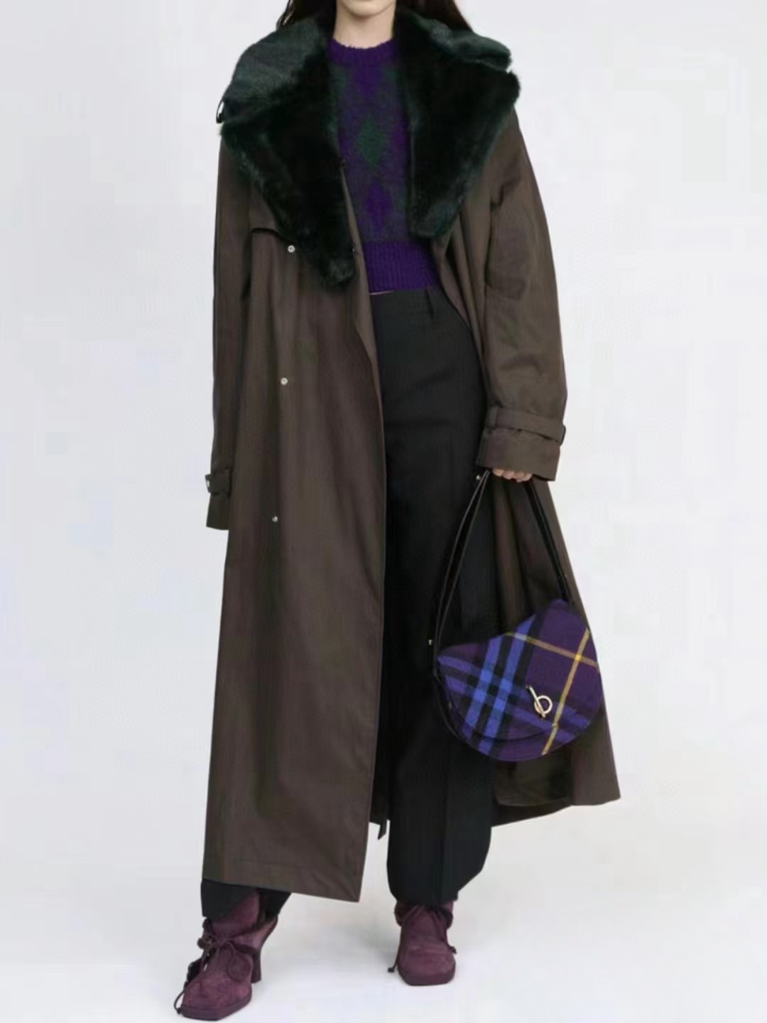 【面料】 外层格纹羊毛+内衬羔羊皮+肩带与装饰条牛皮