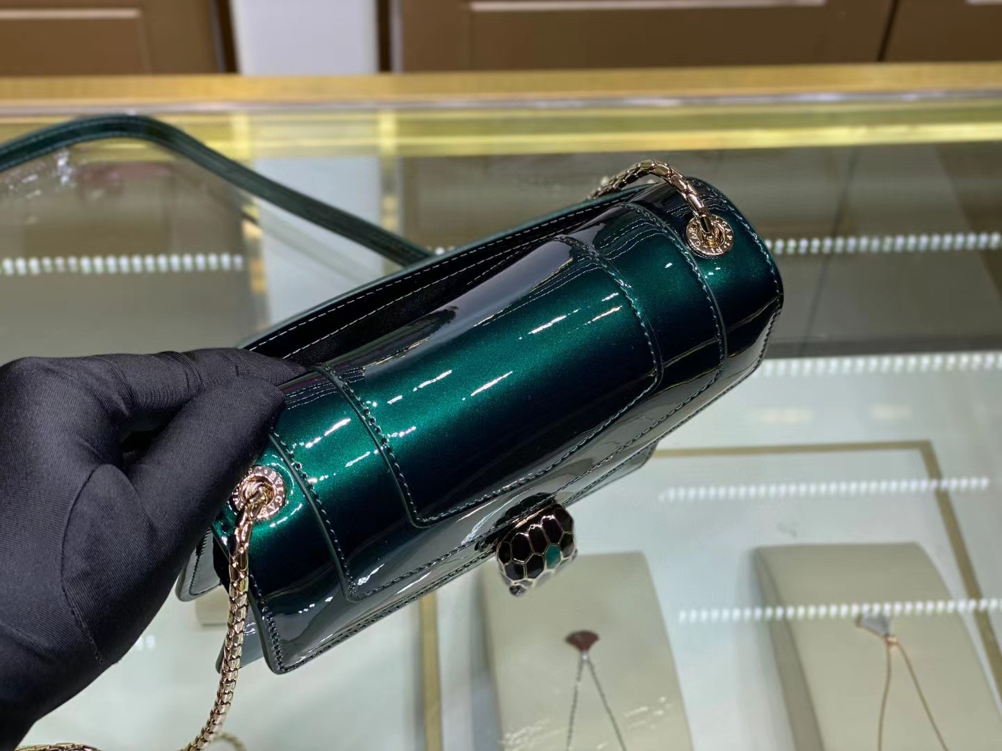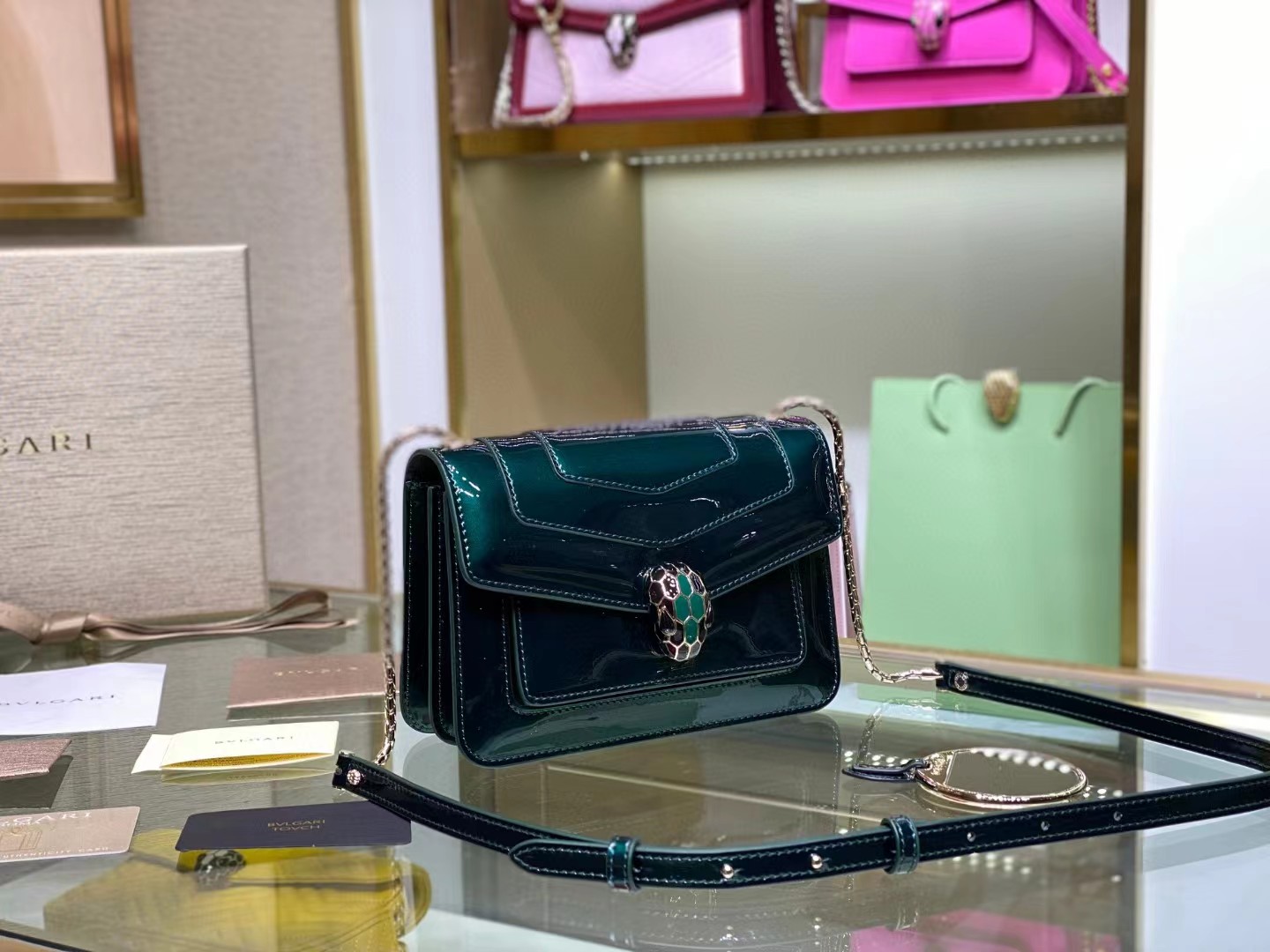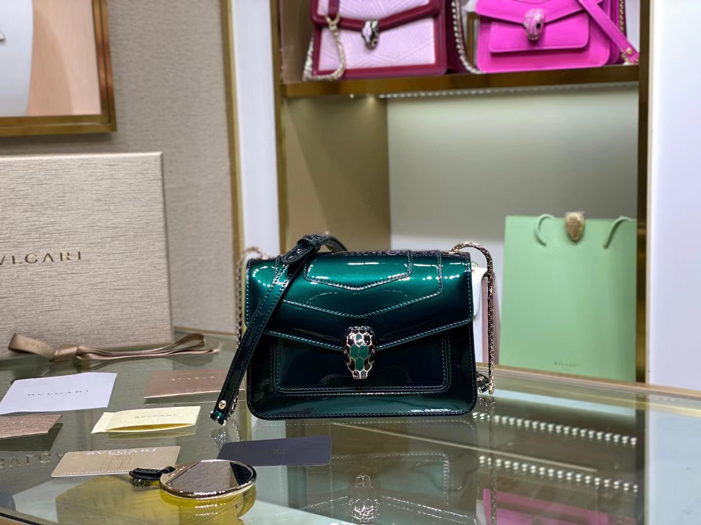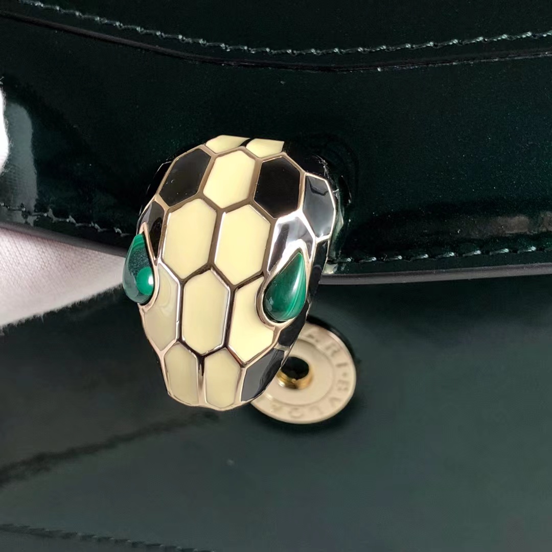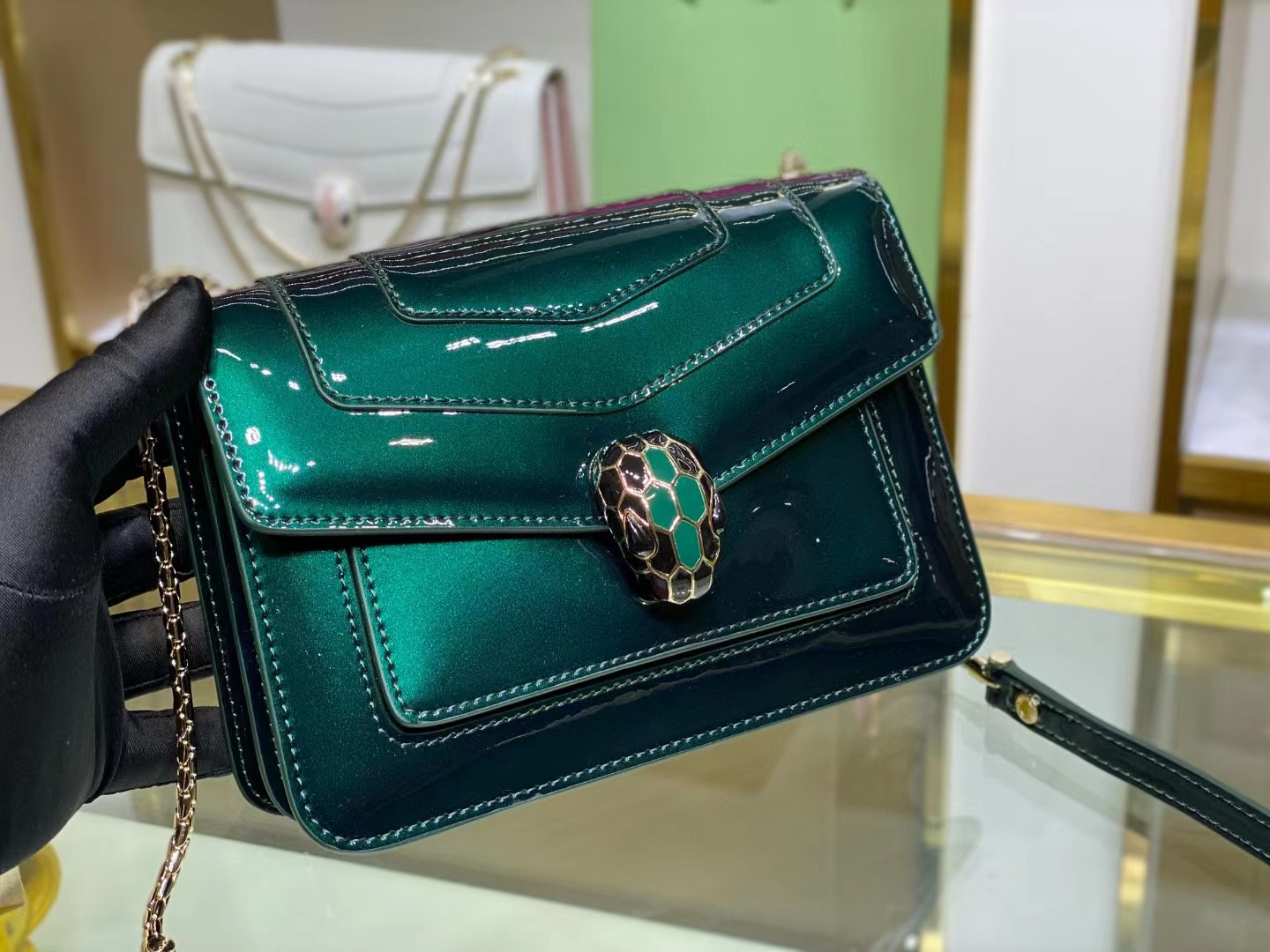 【Bvlgari宝格丽】全新“Serpenti Forever”系列漆皮蛇头斜挎包,彰显都市风格,时尚多变,为Serpenti世界增添别具一格的潮流时尚感这款包袋采用亮漆珠光效果的翡翠绿色小牛皮制成,搭配镀金黄铜配饰。全哑光绿色色珐琅搭配黑色缟玛瑙感性双眼,将蛇首搭扣点缀得魅惑迷人。可调节的蛇形链条和皮革肩带,轻松配搭时尚日装。小号,两个隔层,一面可个性化定制的精巧化妆镜。