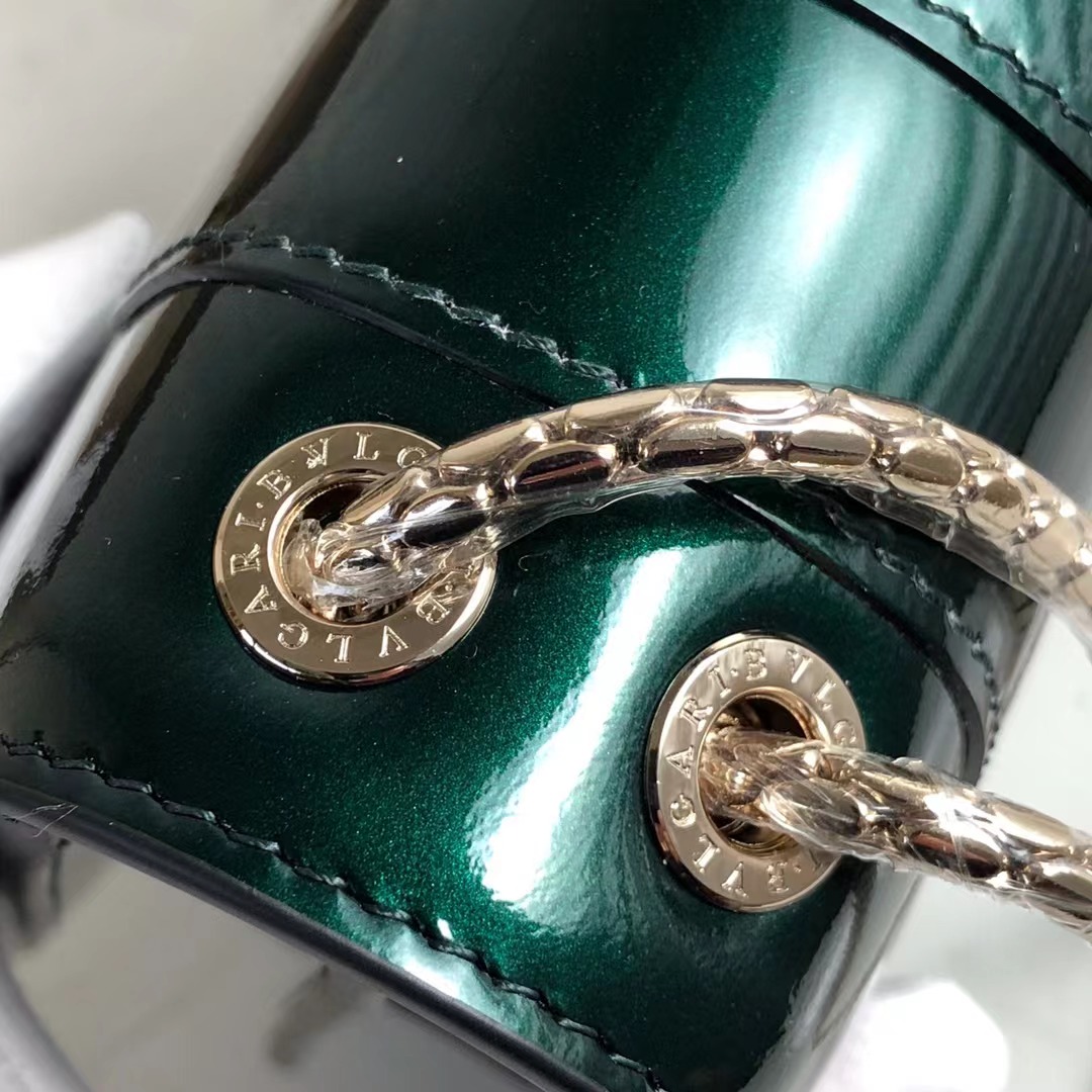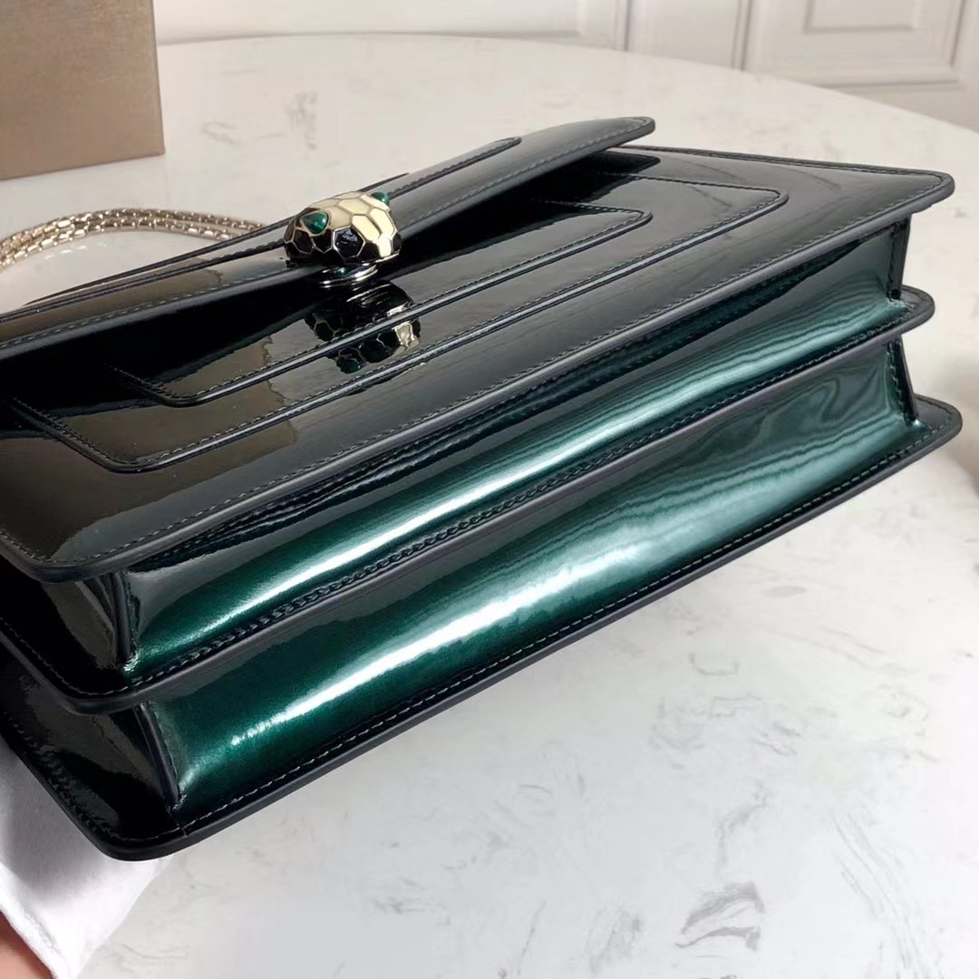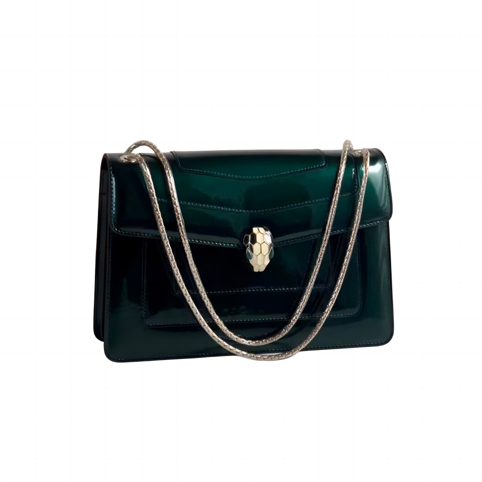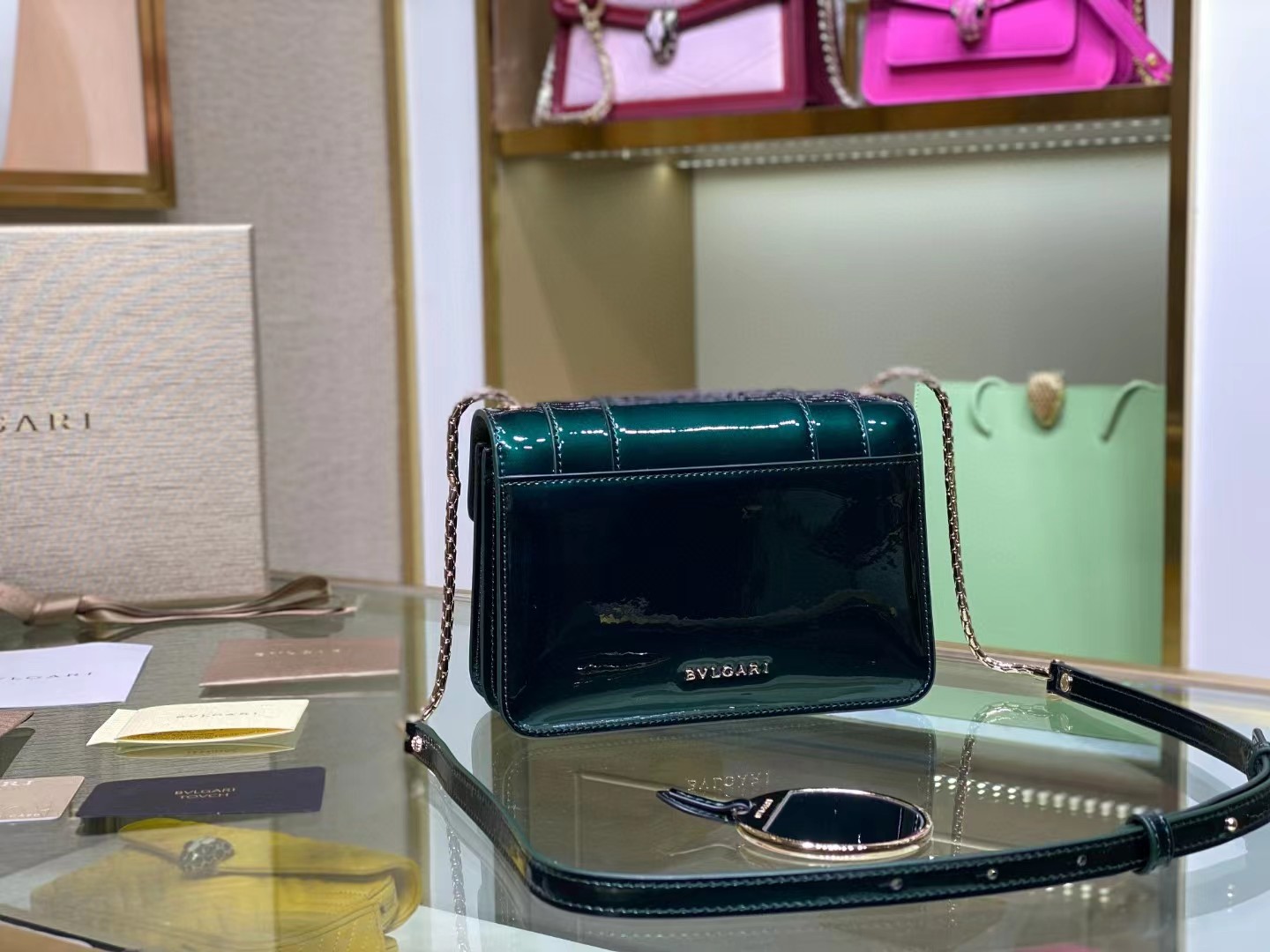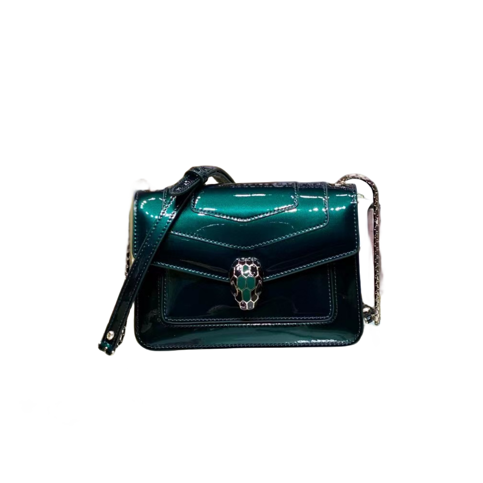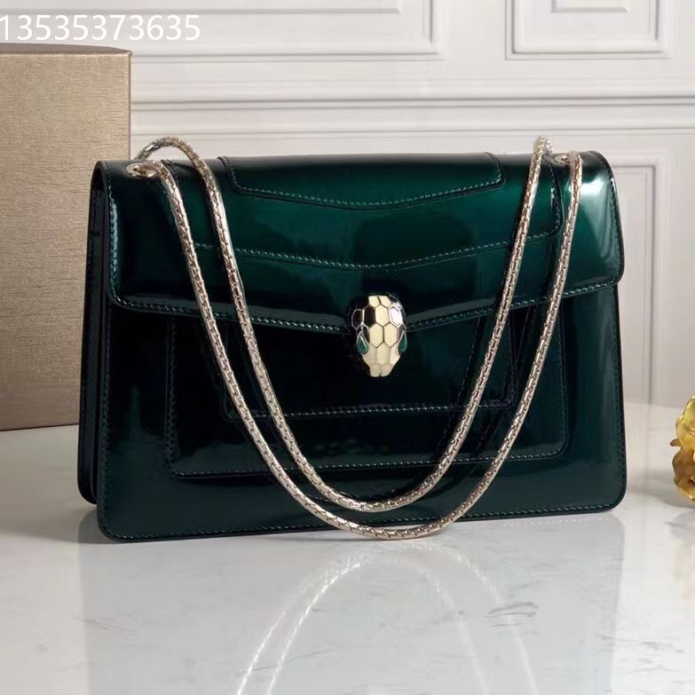 【Bvlgari宝格丽】全新“Serpenti Forever”系列漆皮蛇头斜挎包,彰显都市风格,时尚多变,为Serpenti世界增添别具一格的潮流时尚感这款包袋采用亮漆珠光效果的翡翠绿色小牛皮制成,搭配镀金黄铜配饰。全哑光绿色色珐琅搭配黑色缟玛瑙感性双眼,将蛇首搭扣点缀得魅惑迷人。可调节的蛇形链条和皮革肩带,轻松配搭时尚日装。小号,两个隔层,一面可个性化定制的精巧化妆镜。