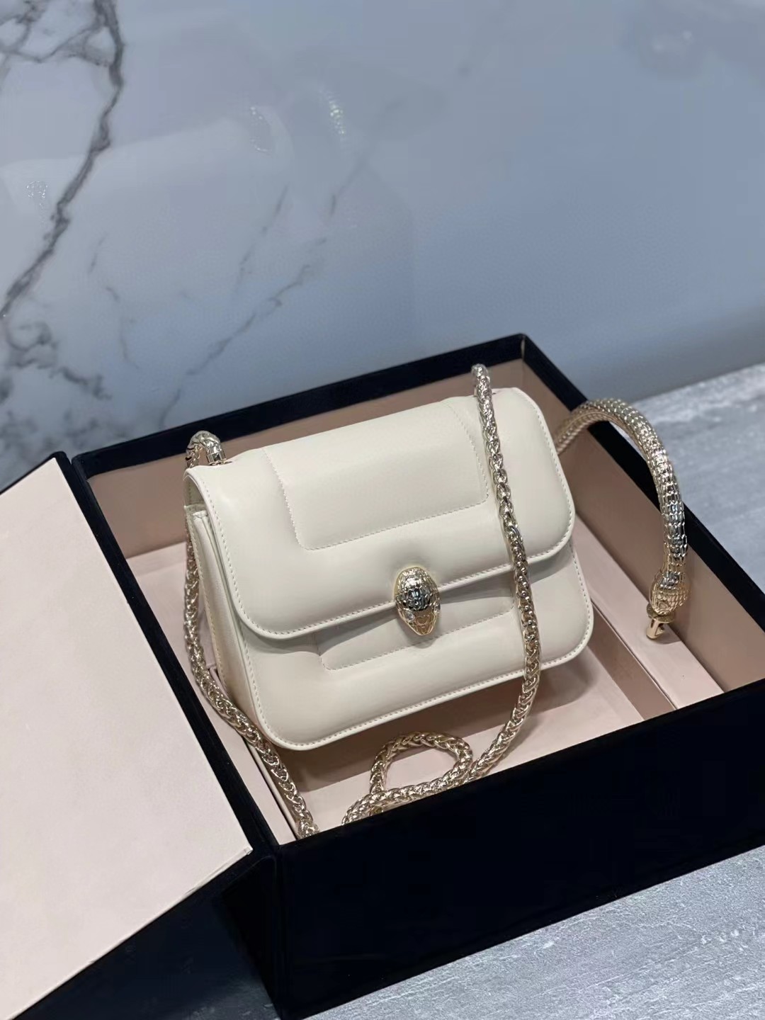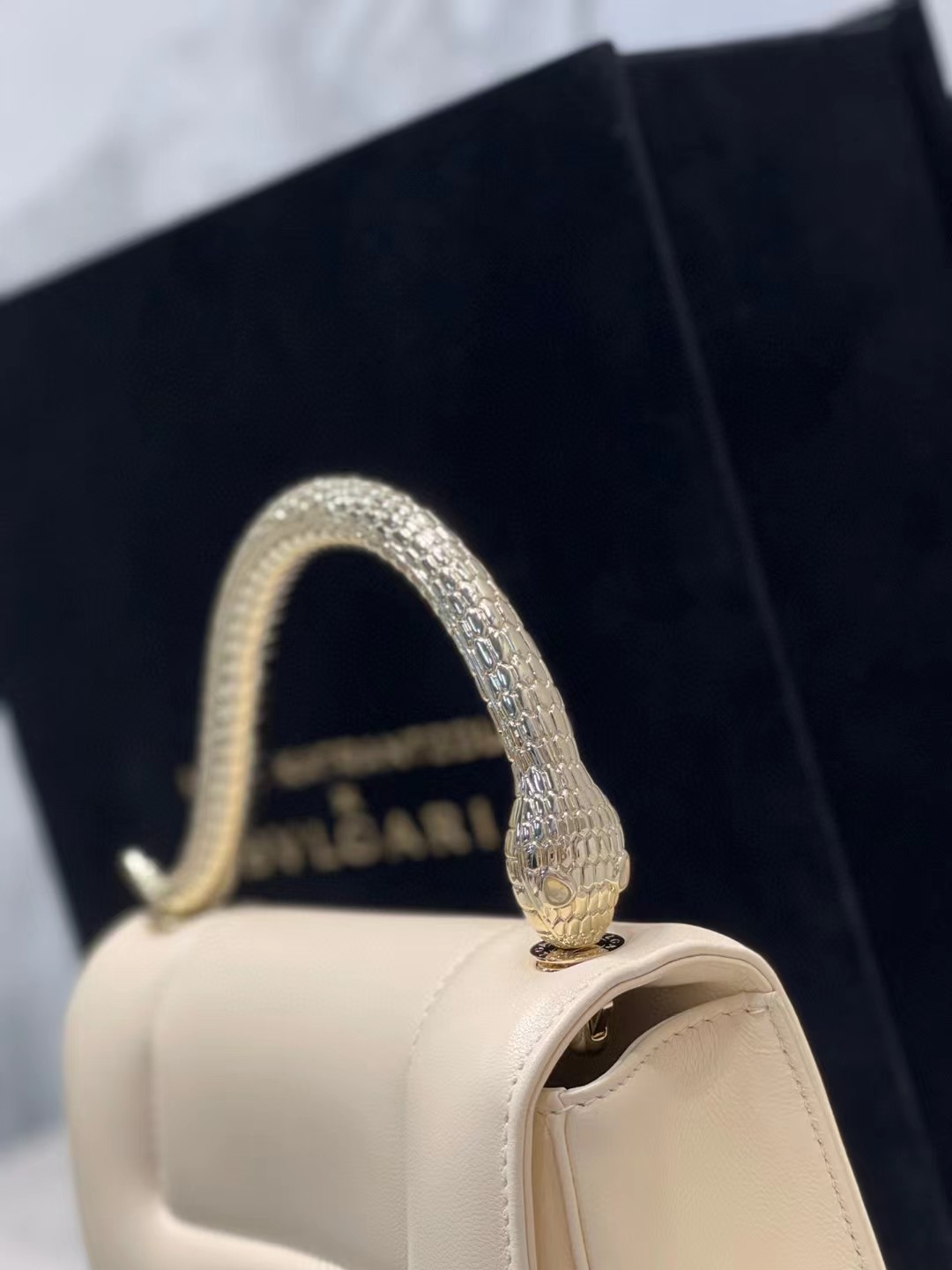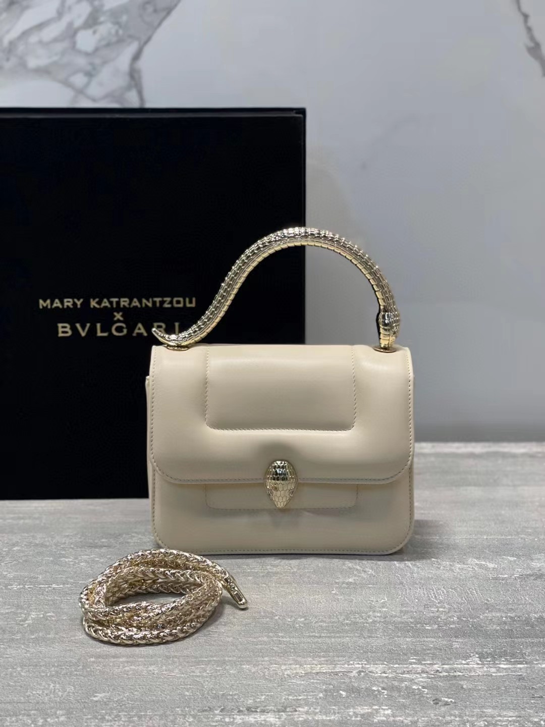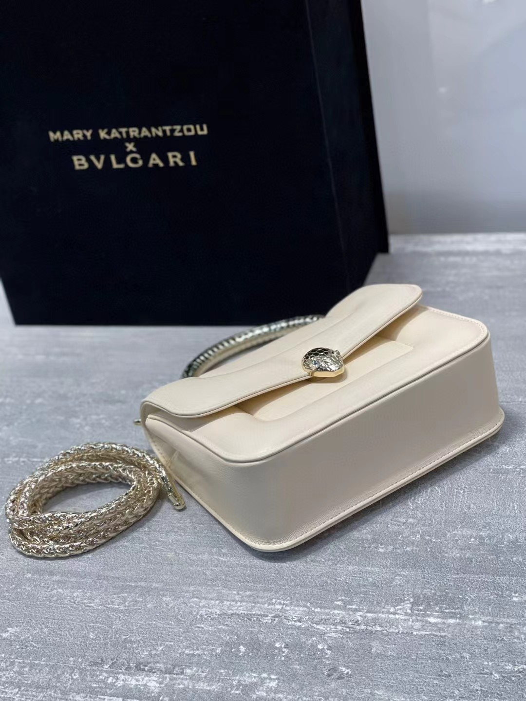 作为“设计师眼中的SERPENTI”系列的全新篇章,Mary Katrantzou重新演绎经典的SERPENTI图案,从灵蛇蜕变汲取灵感,推出全新的精美联名系列。此款手提包采用柔软白色小羊皮材质,搭配浅金镀金黄铜配饰。浅金镀金黄铜重释经典的SERPENTI蛇首搭扣,搭配迷人的水晶双眸,尽显BVLGARI宝格丽古董腕表的设计元素