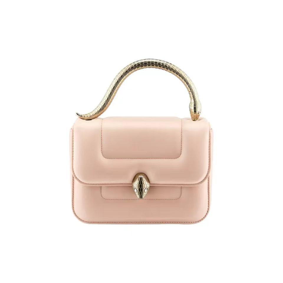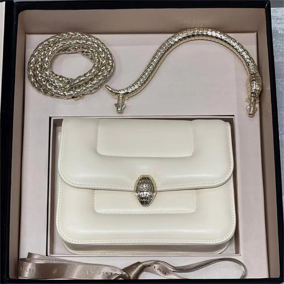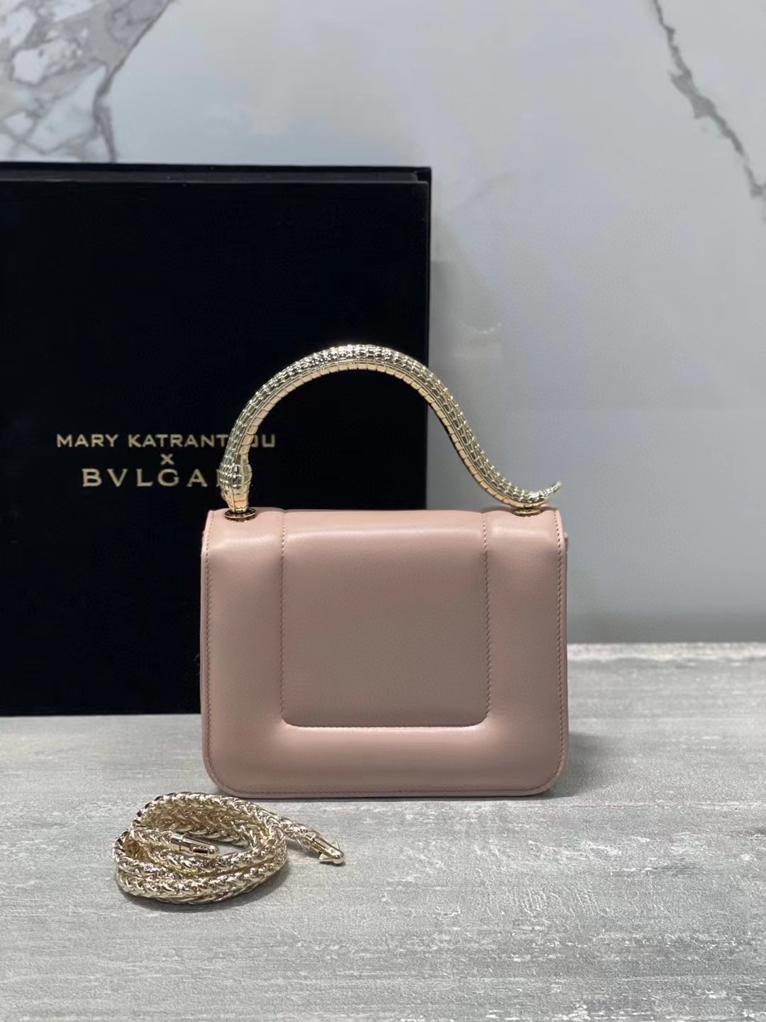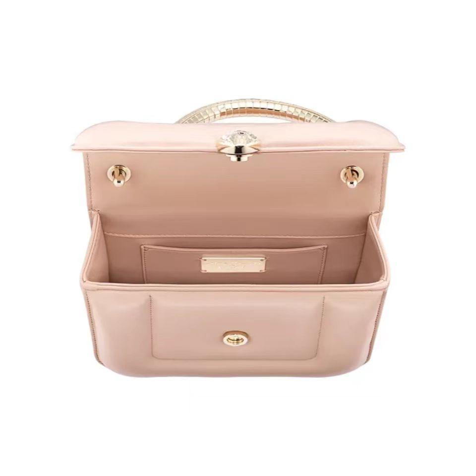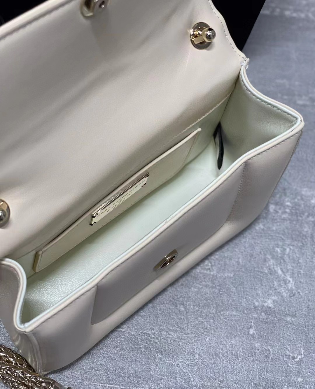 作为“设计师眼中的SERPENTI”系列的全新篇章,Mary Katrantzou重新演绎经典的SERPENTI图案,从灵蛇蜕变汲取灵感,推出全新的精美联名系列。此款手提包采用柔软白色小羊皮材质,搭配浅金镀金黄铜配饰。浅金镀金黄铜重释经典的SERPENTI蛇首搭扣,搭配迷人的水晶双眸,尽显BVLGARI宝格丽古董腕表的设计元素