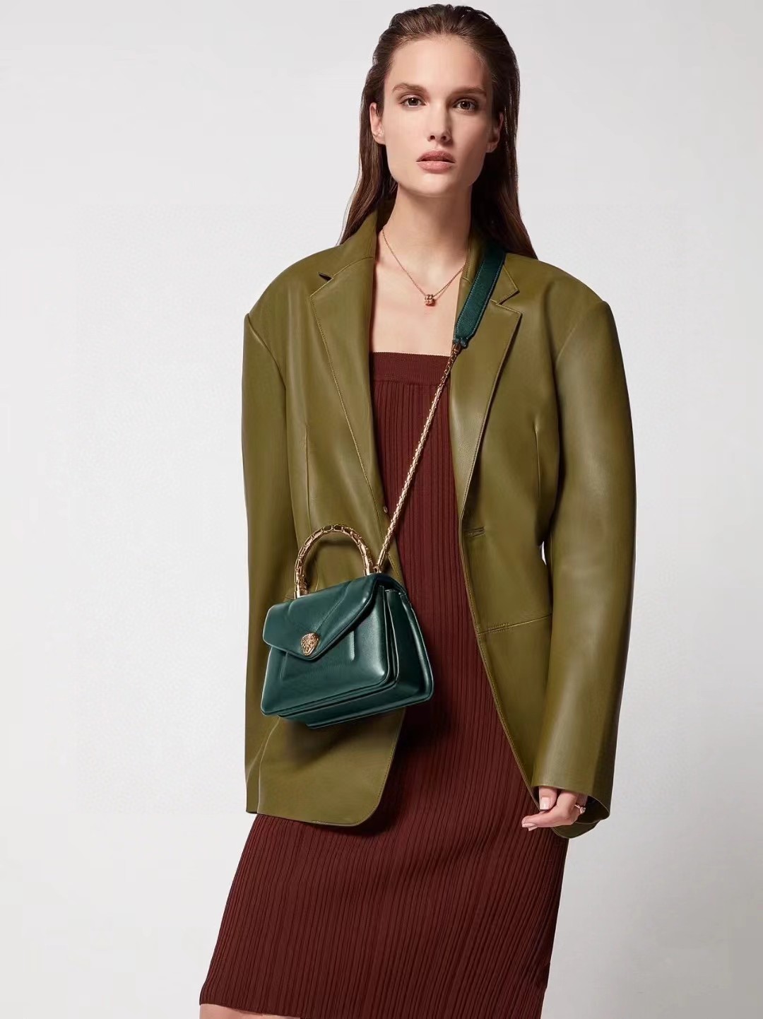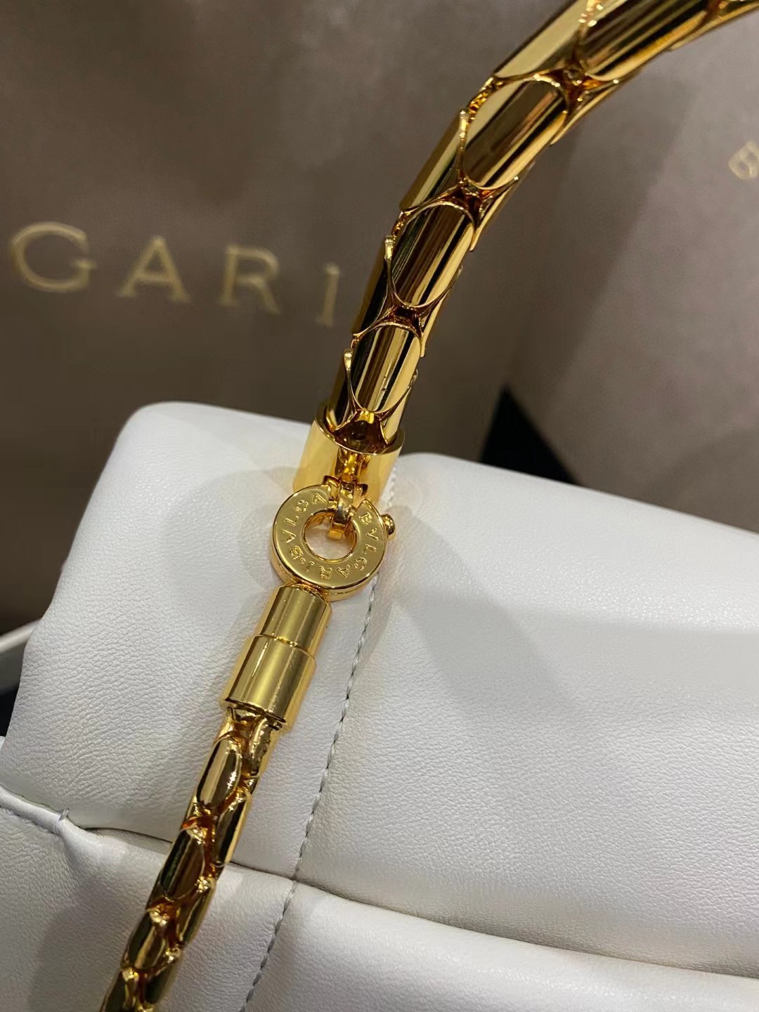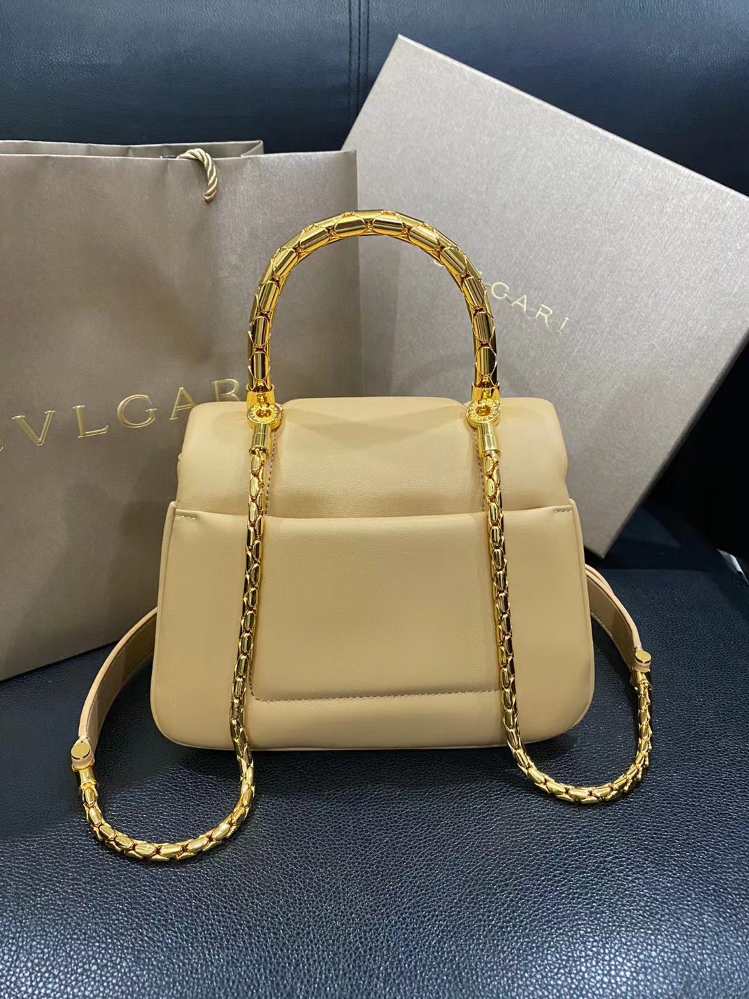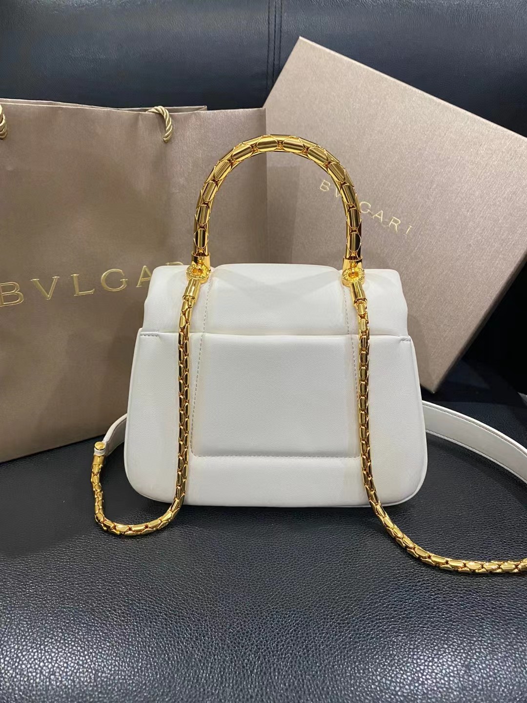 SERPENTI REVERSE系列小号手提包,巧妙玩转大胆比例与瞩目造型,以迷人时尚的蓬松设计重新演绎系列经典特色。包身采用柔软羊皮,由BULGARI宝格丽工艺大师手工精制而成,呈现如密镶钻石般的独特质地,搭配经典蛇首磁扣,灵感源自1960年代的一枚BULGARI宝格丽腕表。搭配经典蛇形链条和皮革肩带及蛇形金属手柄,设有三个隔层,两个内部拼接口袋和一个背面拼接口袋。
