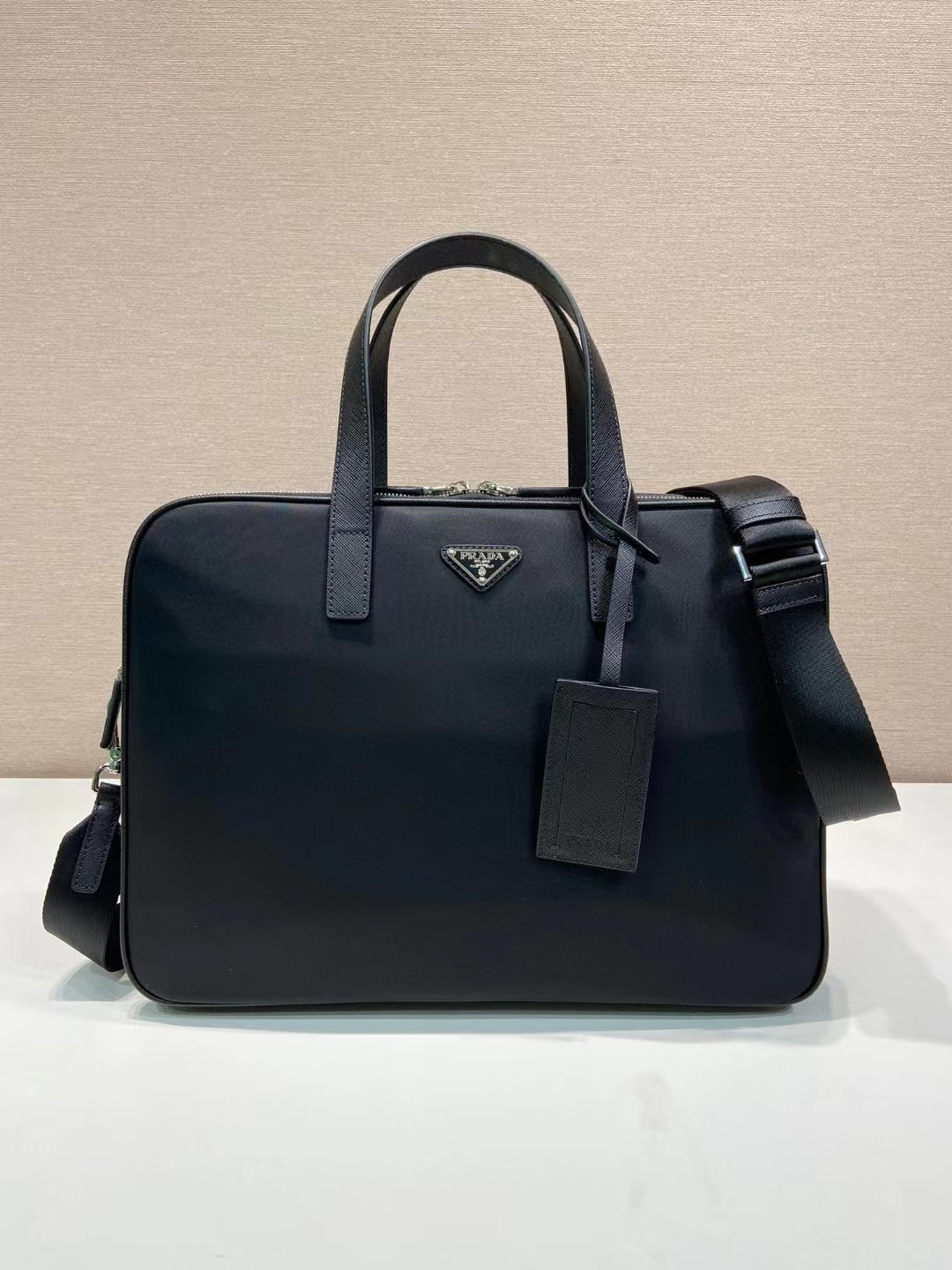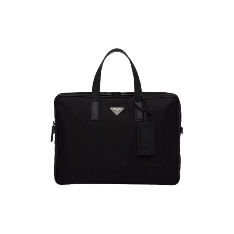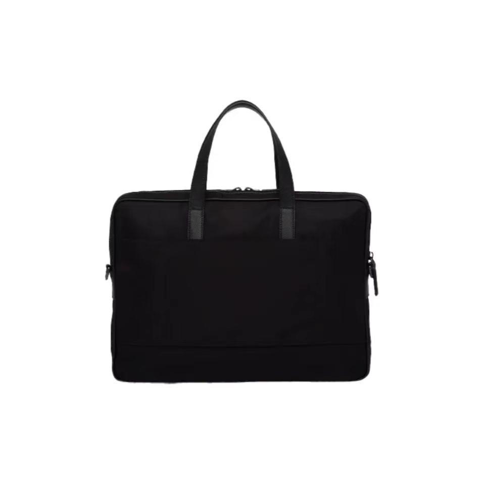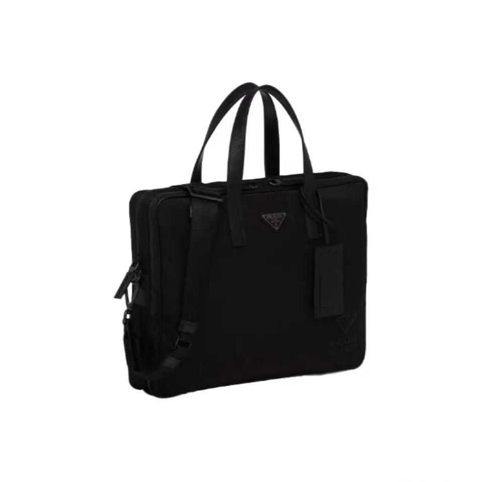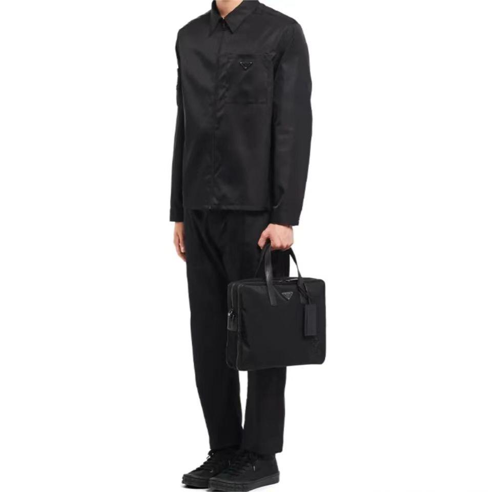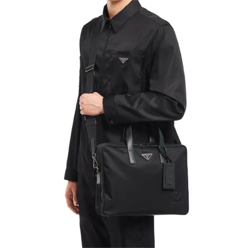 【介绍】 新款公文包三角标,这款再生尼龙材质重释经典的男士公文包,为新一季增添亮点。公文包配有双提手和可拆卸肩带,标志为三角标,细节设计精巧别致。出差背面可挂在拉杆箱上。非常实用,简约/又大气。