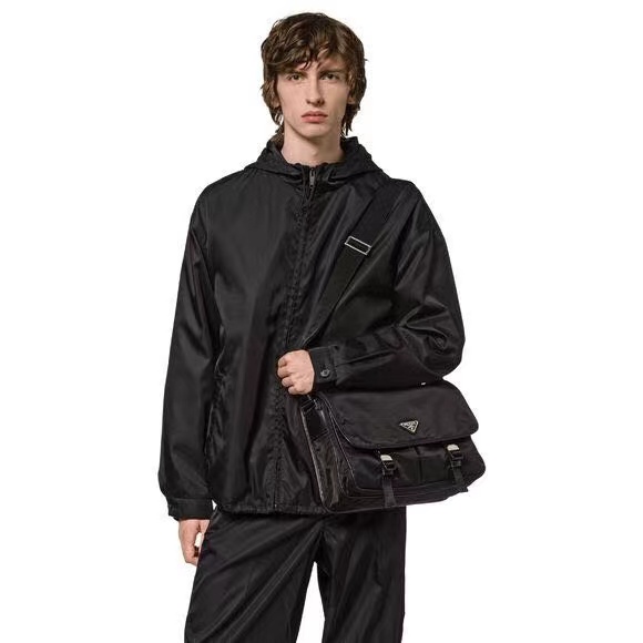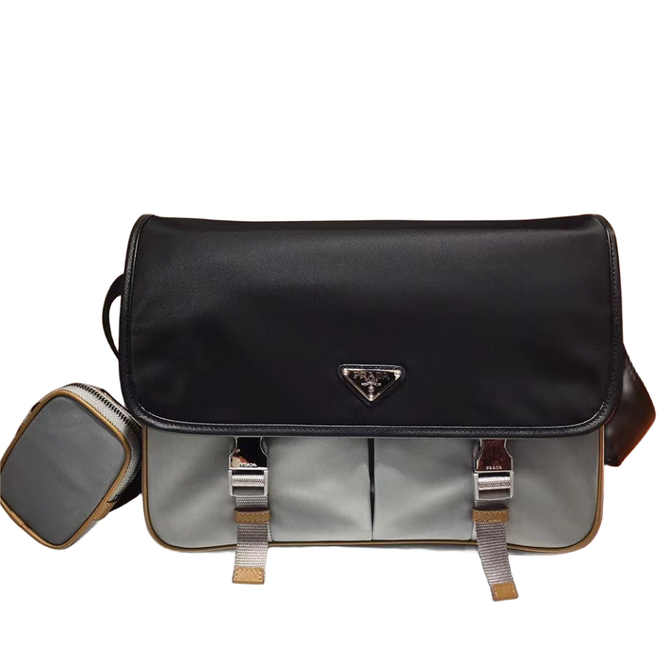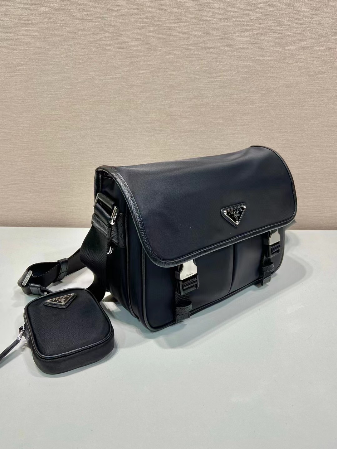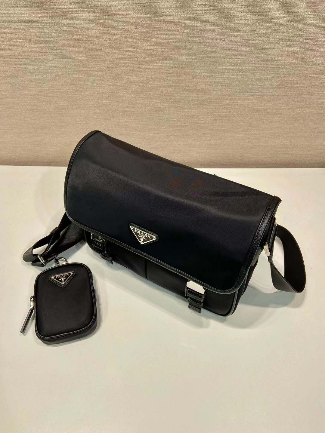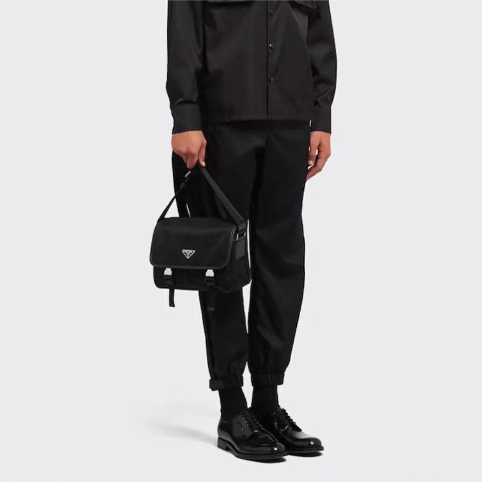 PRADA 邮差包,这款尼龙翻盖手袋饰有经典的Saffiano皮革饰边,配有两枚旁开扣,并饰有标志性的三角形金属徽标,彰显时尚设计格调,采用进口尼龙和Saffiano皮革材质,两个正面口袋,其中一个带拉链背面拉链袋,两个内部手机袋,又可调式尼龙徽标提花肩带,经典又时尚的邮差包,男土们最爱。