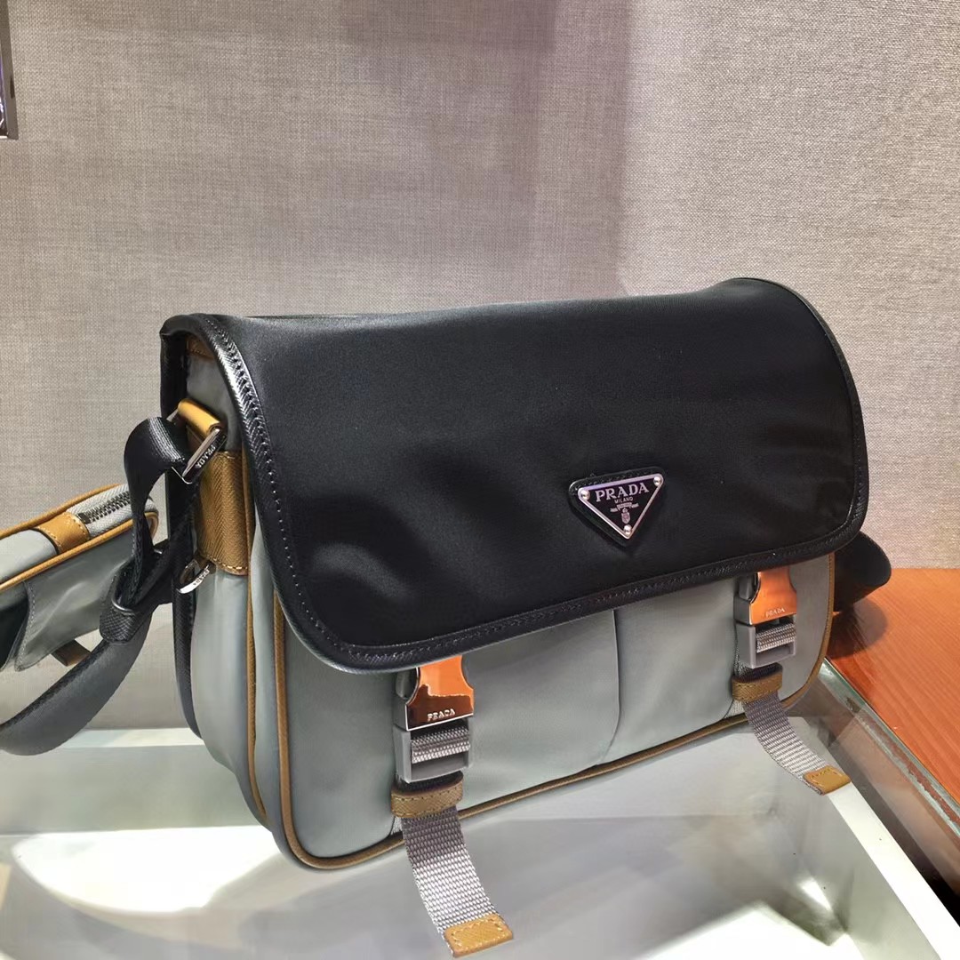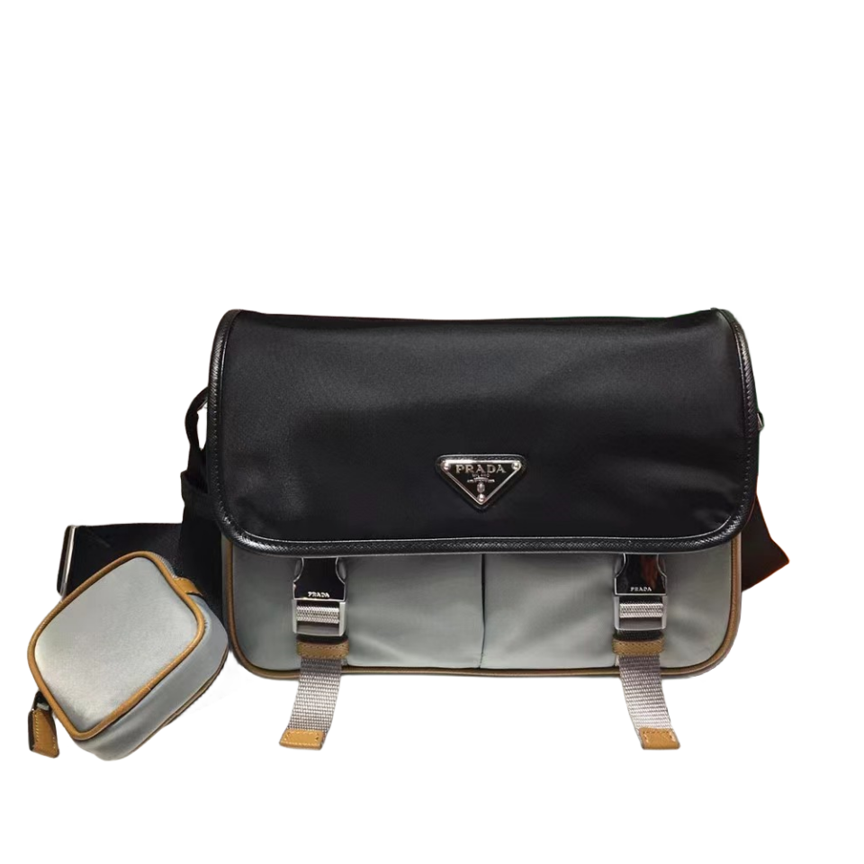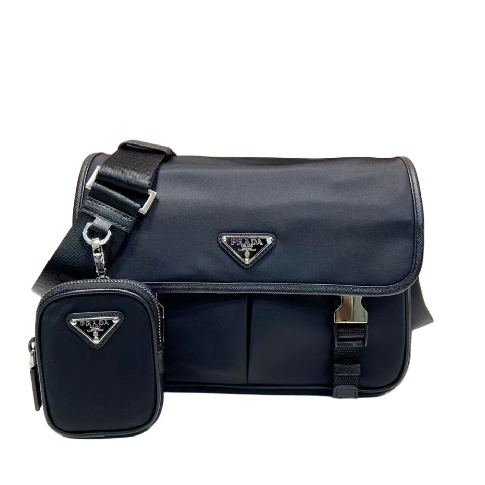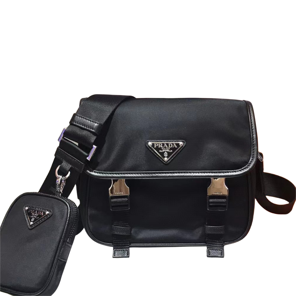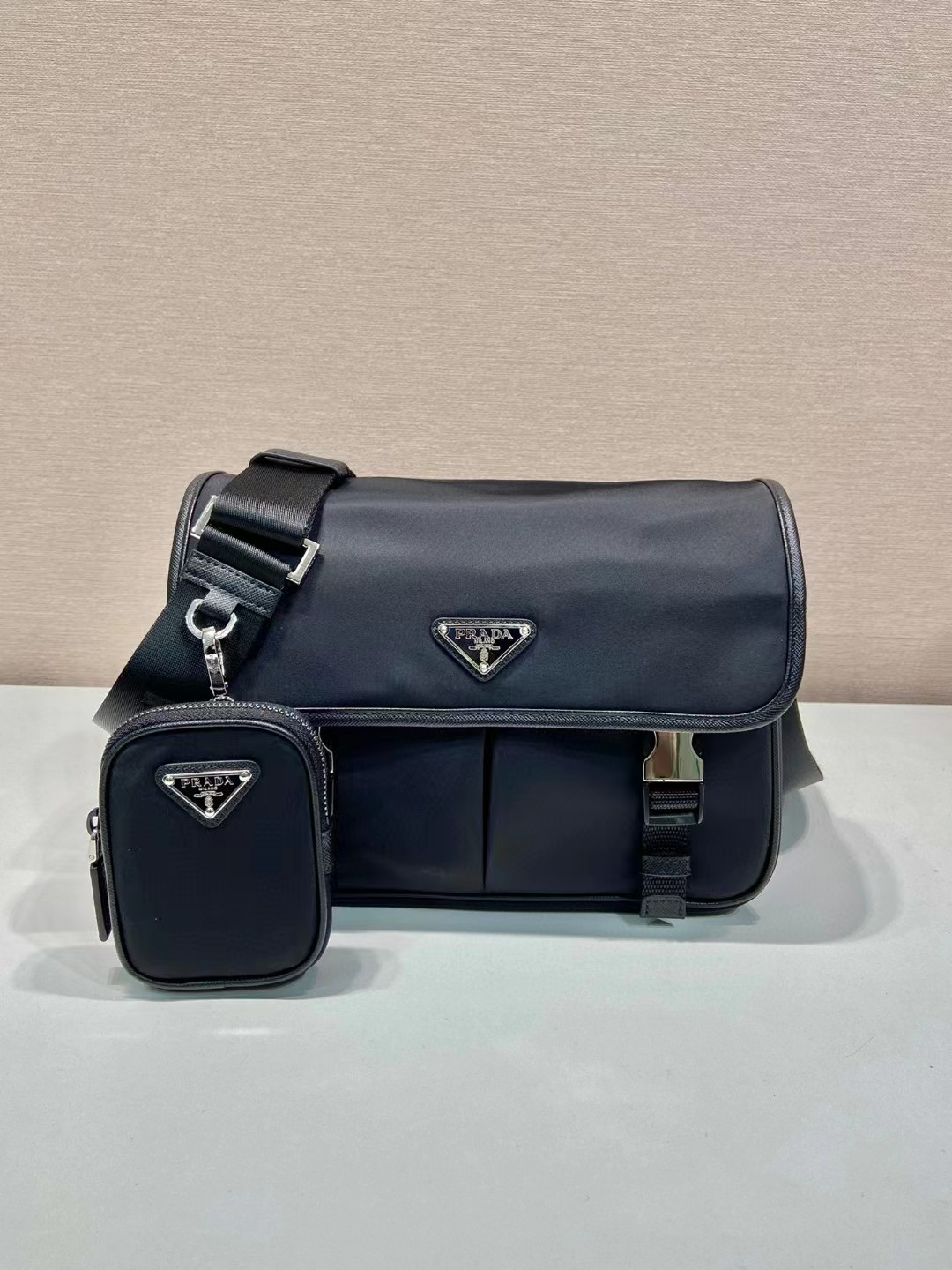 PRADA 邮差包,这款尼龙翻盖手袋饰有经典的Saffiano皮革饰边,配有两枚旁开扣,并饰有标志性的三角形金属徽标,彰显时尚设计格调,采用进口尼龙和Saffiano皮革材质,两个正面口袋,其中一个带拉链背面拉链袋,两个内部手机袋,又可调式尼龙徽标提花肩带,经典又时尚的邮差包,男土们最爱。