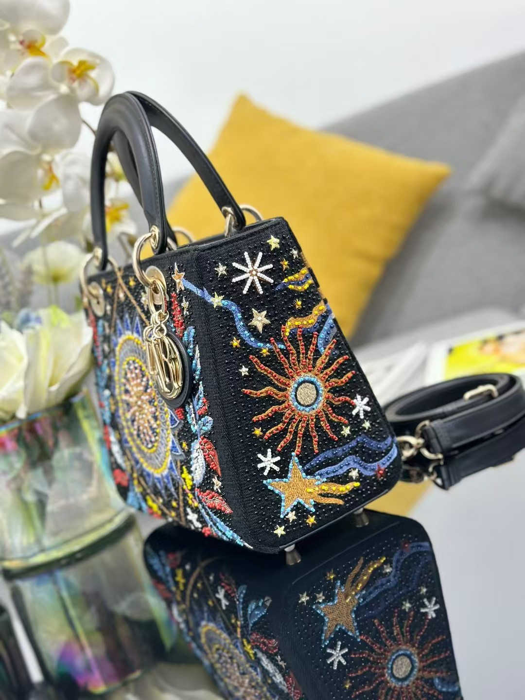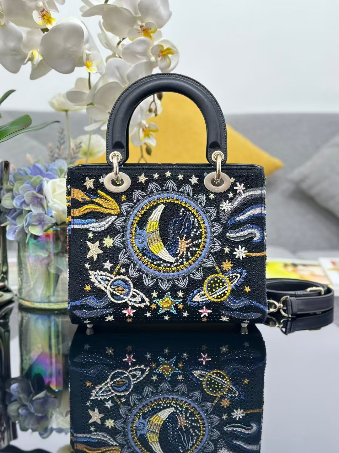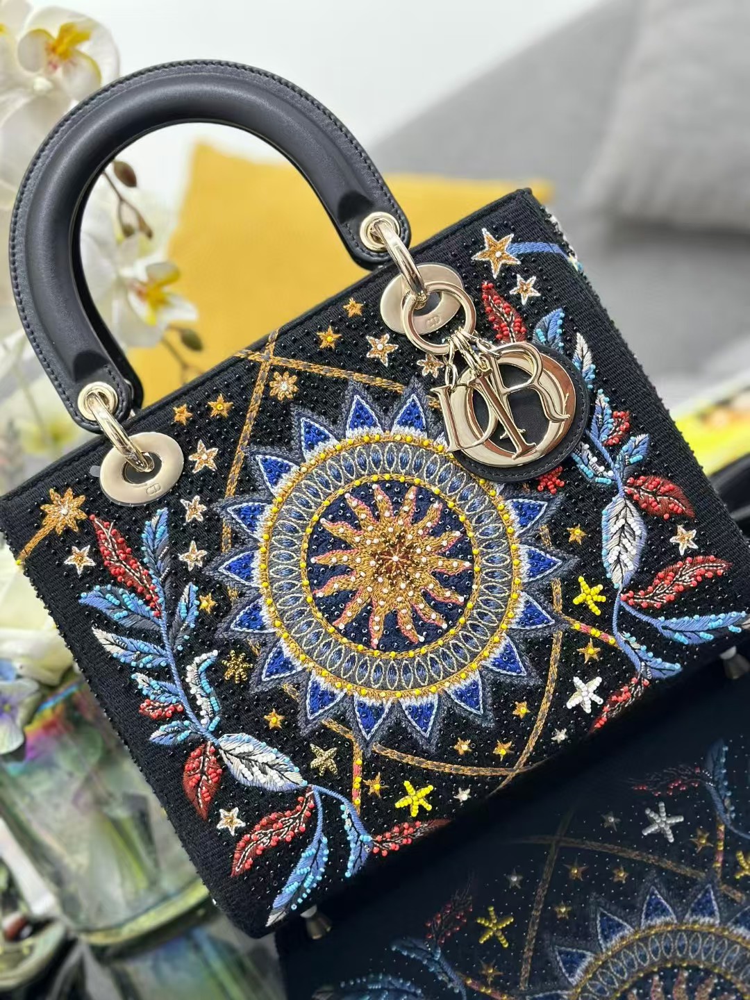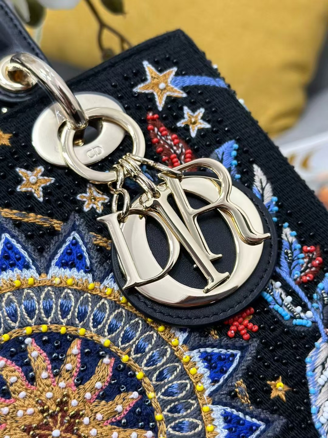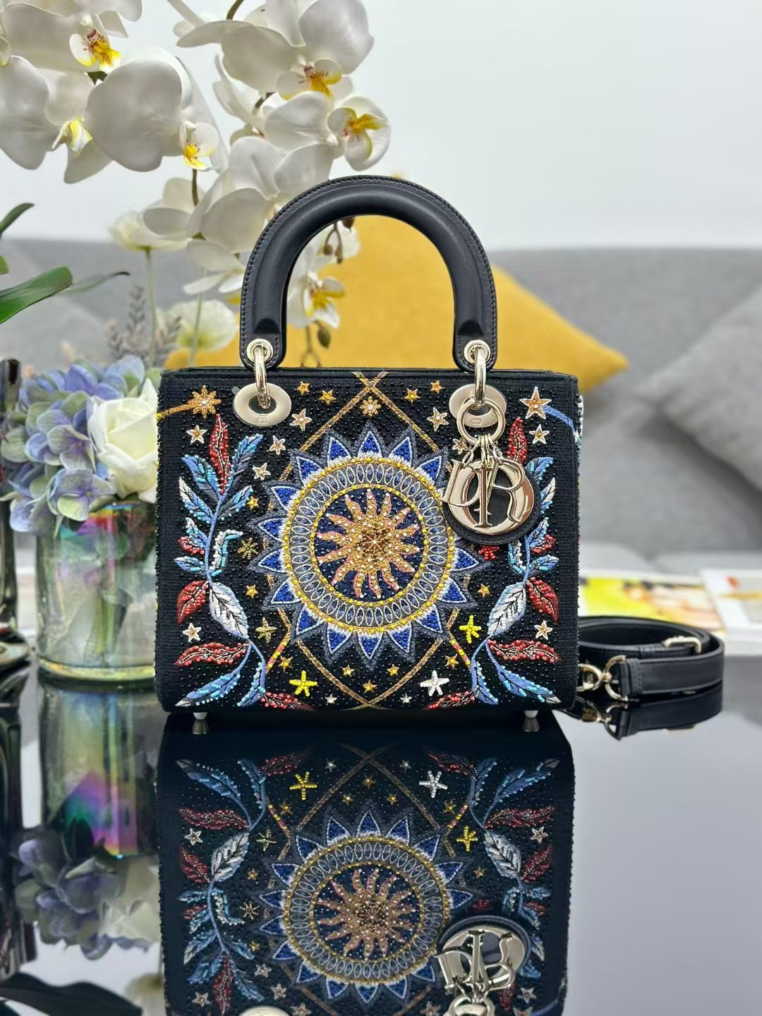 【介绍】 Lady Dior 五格刺绣海底珠子,典雅和美丽的真知灼见。时髦且富有女性魅力,经久不衰却又现代时尚。采用精致的珠饰牛皮革制成,搭配当季的图案,流露出 Maria Grazia Chiuri 对神秘感的迷恋。手袋采用海底装饰,预示着好运与欢乐。浅金色的标志性"D.I.O.R."吊饰点缀其 A 字型的轮廓。