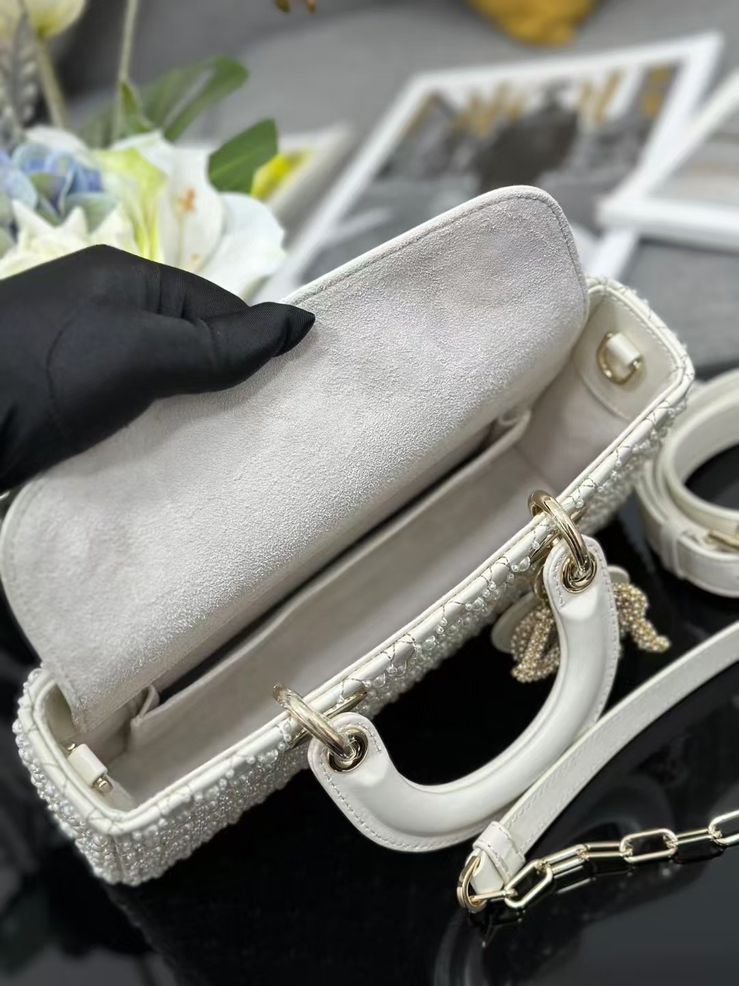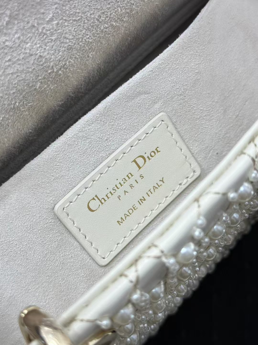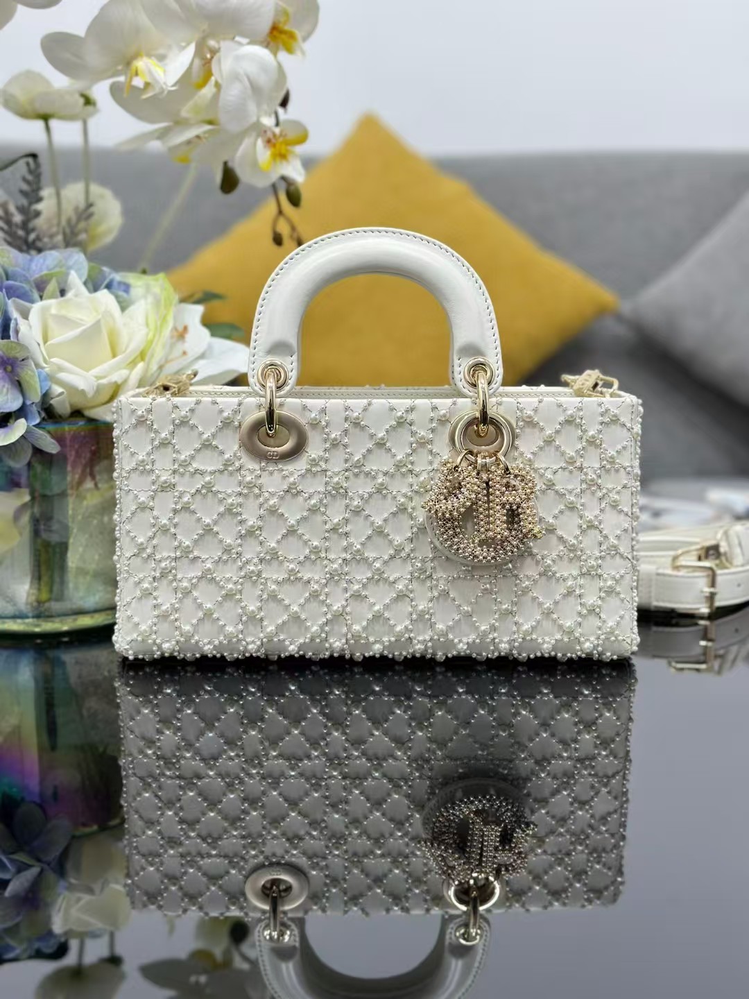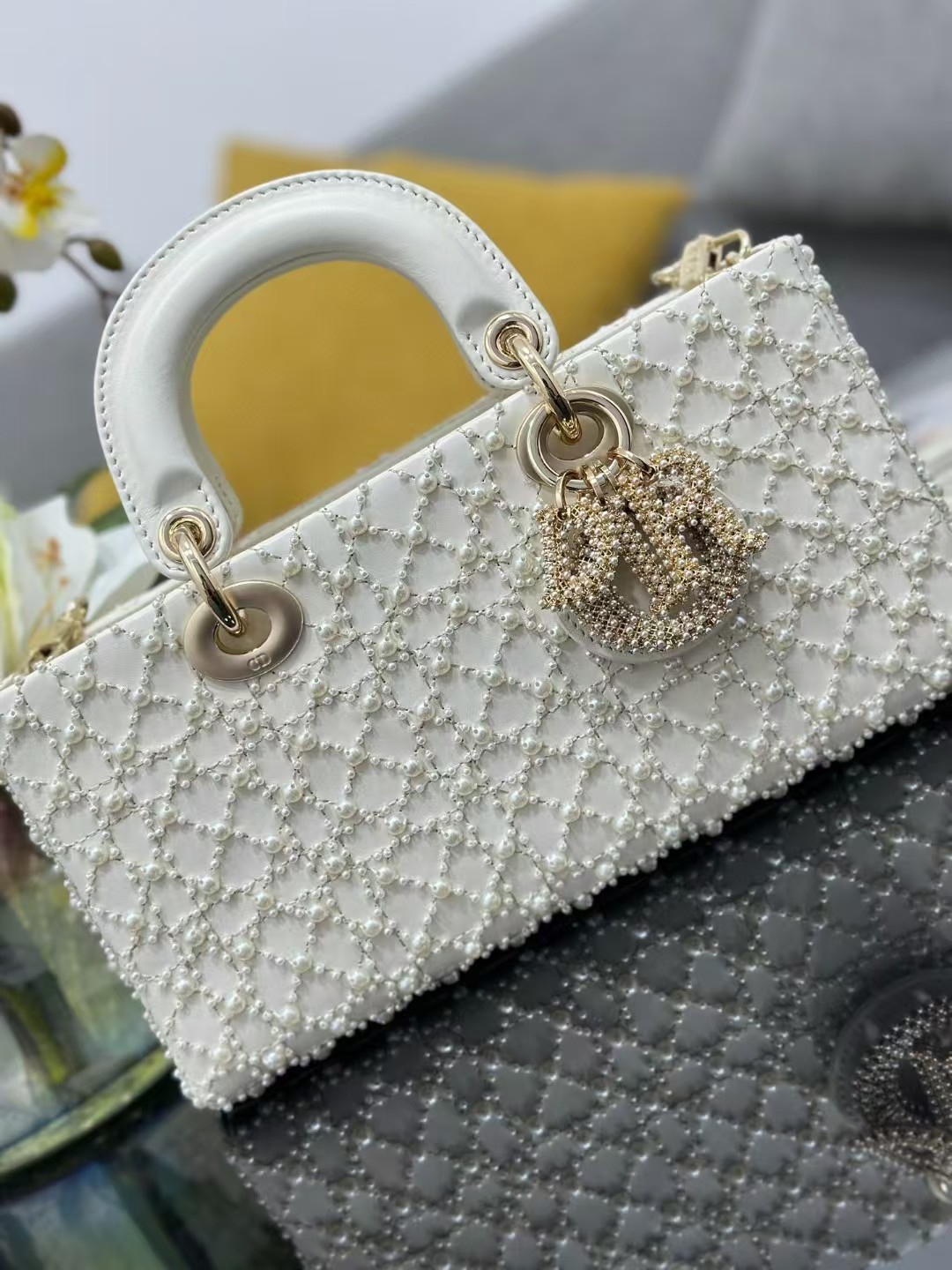 DIOR 迪奥 Lady D-Joy 26横格刺绣半颗珍珠白色 单肩斜挎手提包