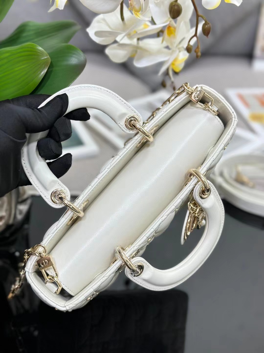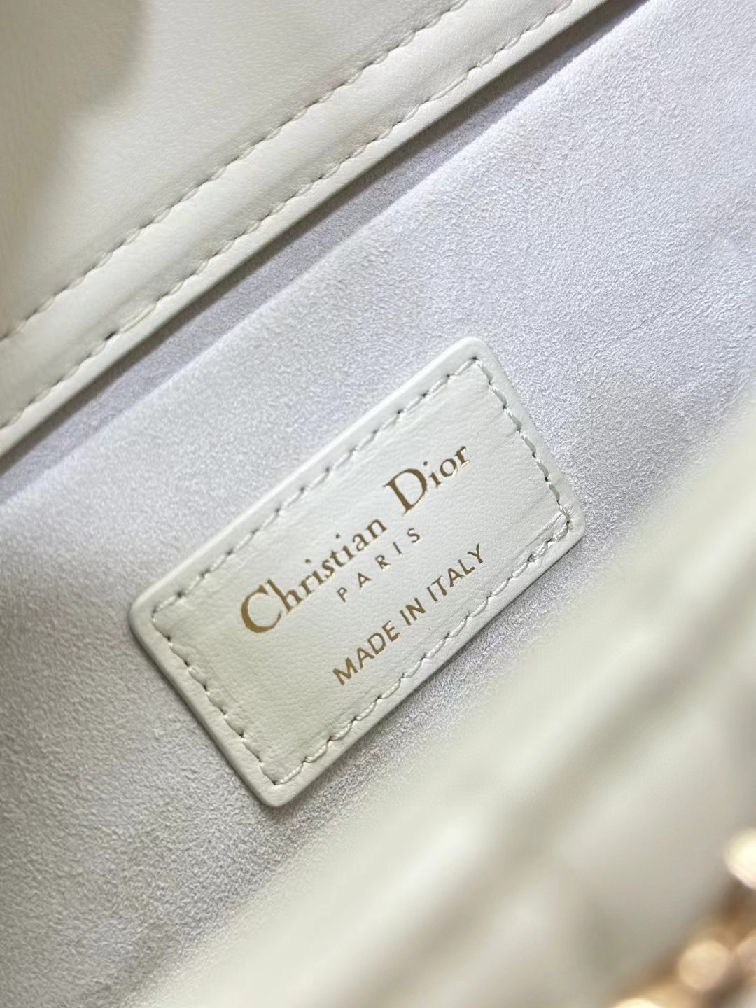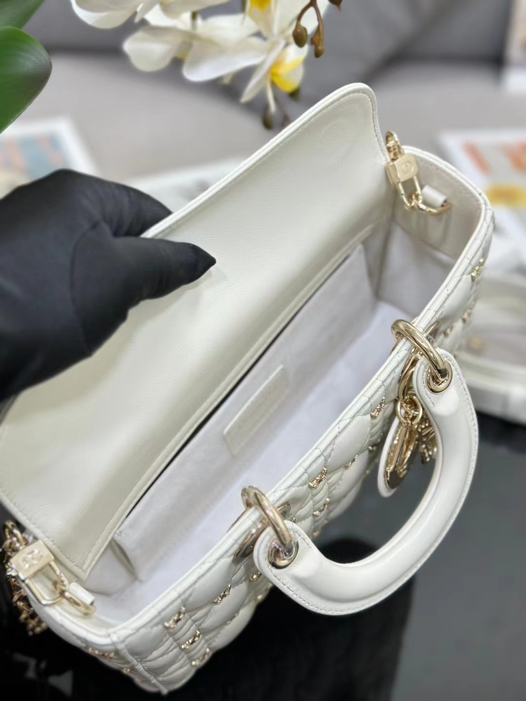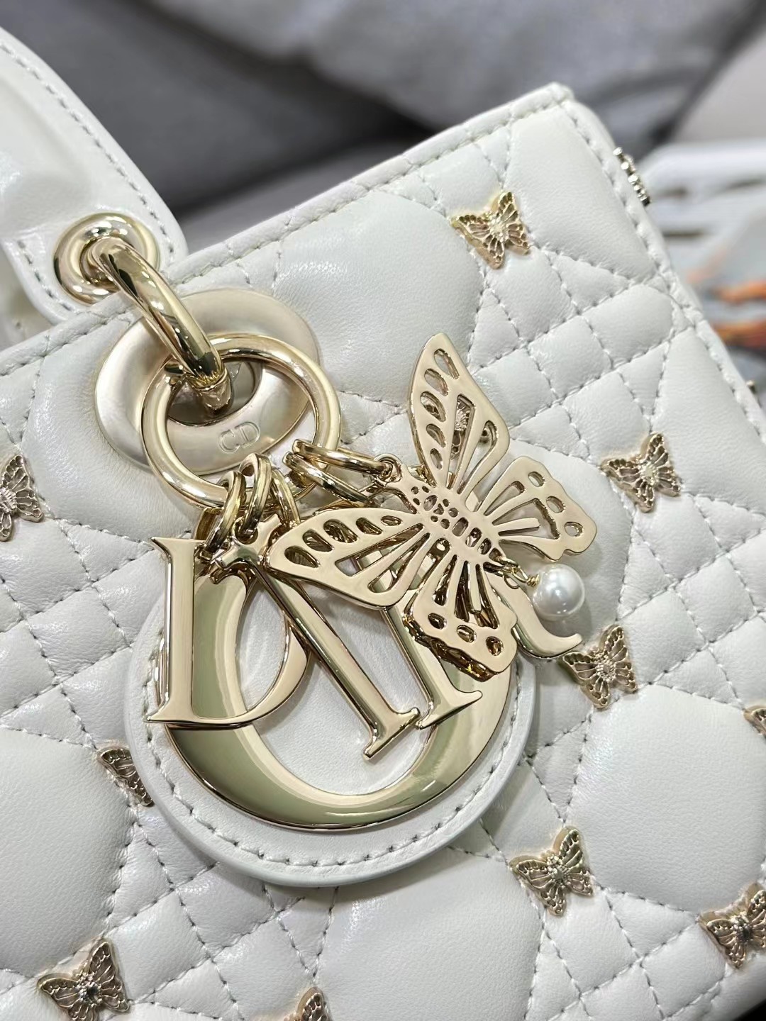 Lady D-Joy 新款蝴蝶钉 内里配羊筋,采用羊皮革精心制作,以金色饰面金属蝴蝶铆钉点缀藤格纹缉面线,D.I.O.R. 吊饰搭配浅金色饰面金属蝴蝶吊饰和白色树脂珠饰,为精美的轮廓增添一分灵动。中号款式,搭配可拆卸的链条肩带和可调节、可拆卸的皮革肩带,可手提、肩背或斜挎,是日常造型的理想之选。