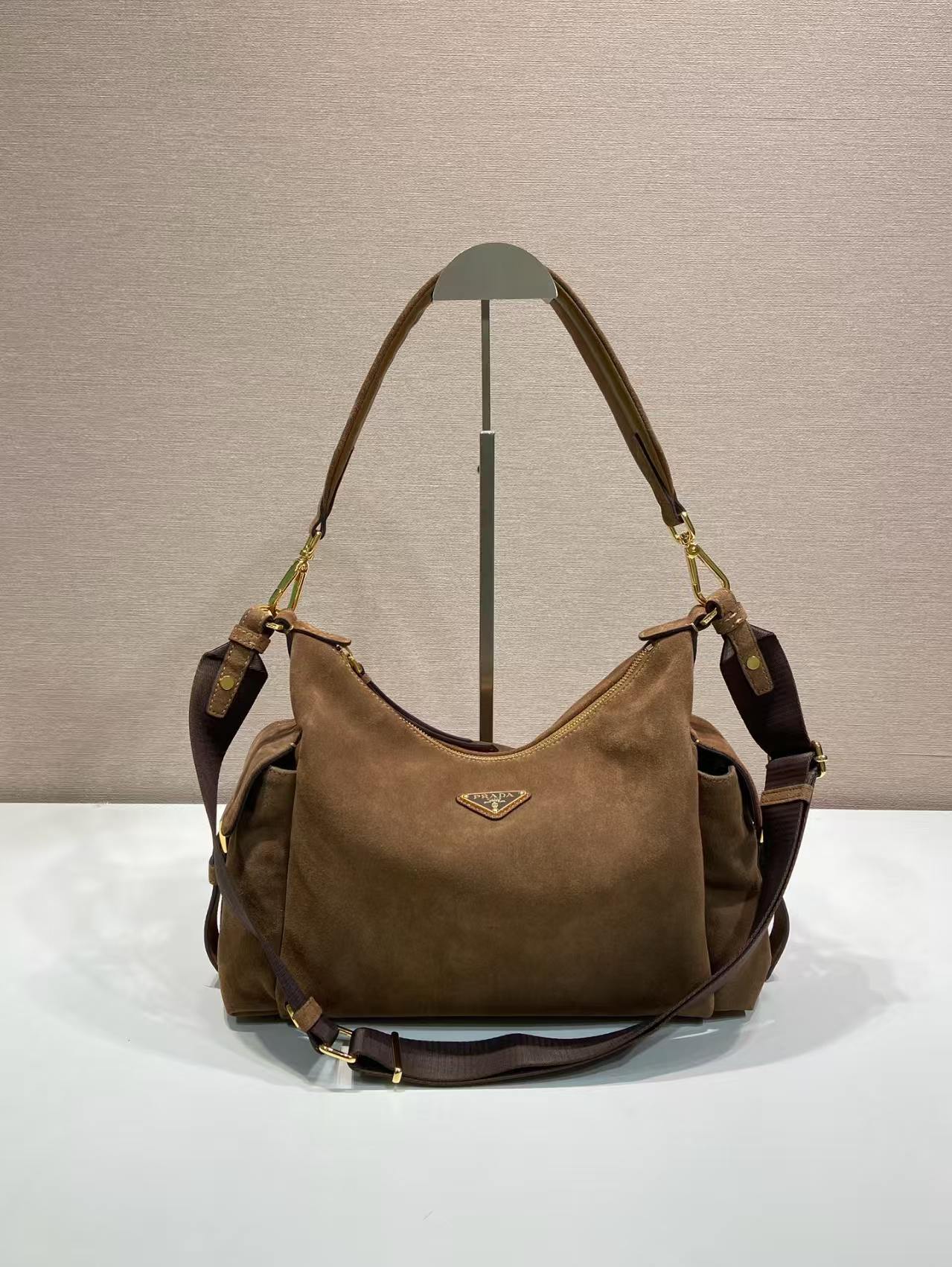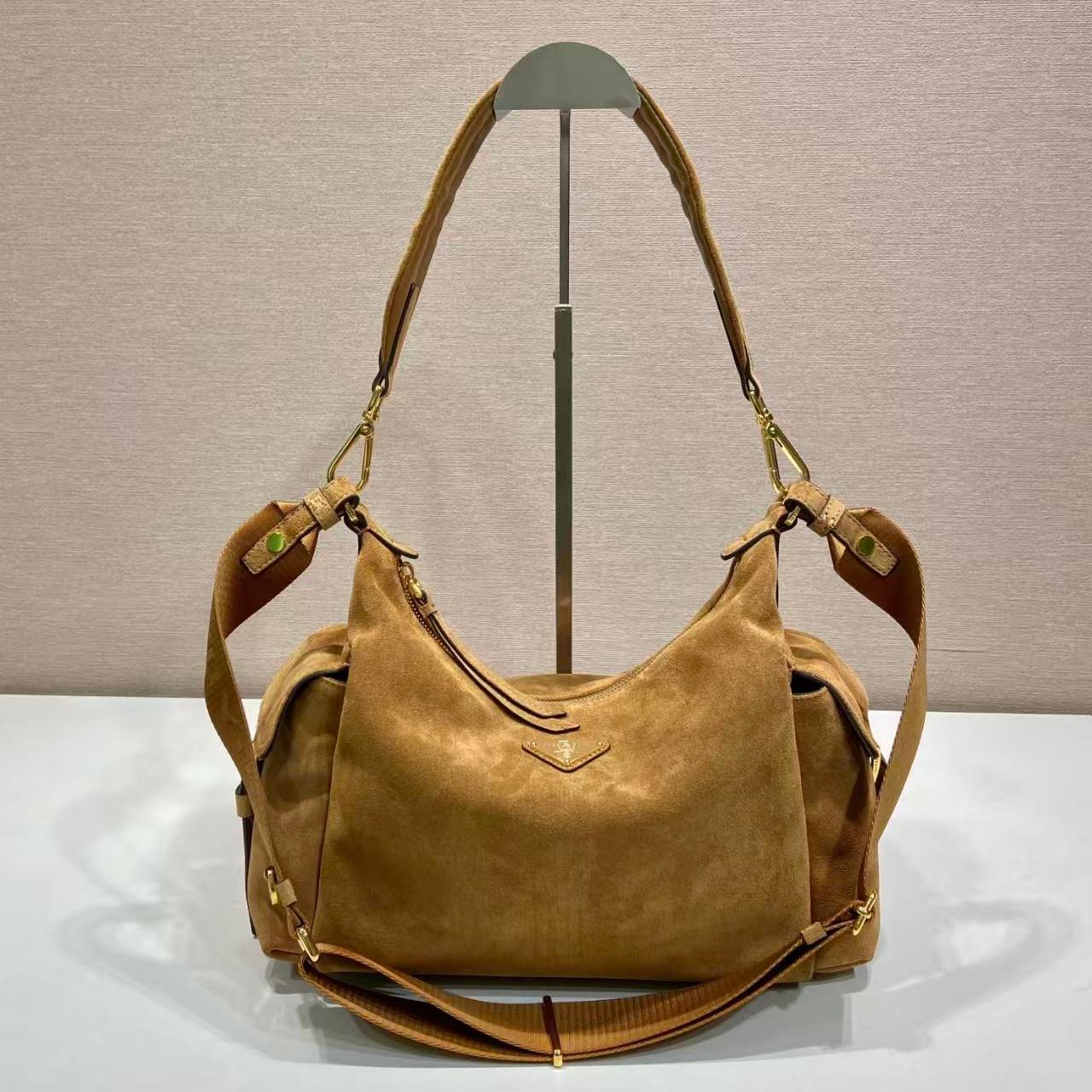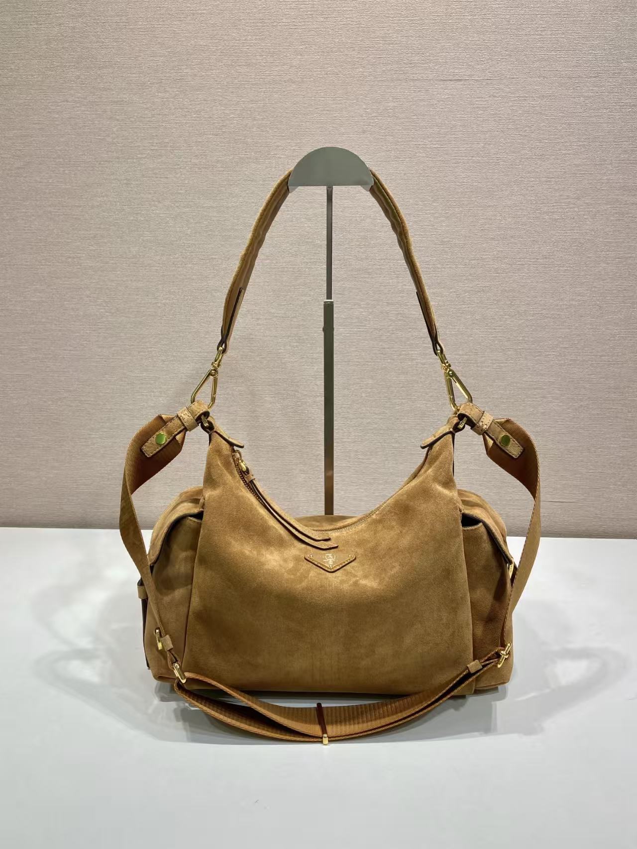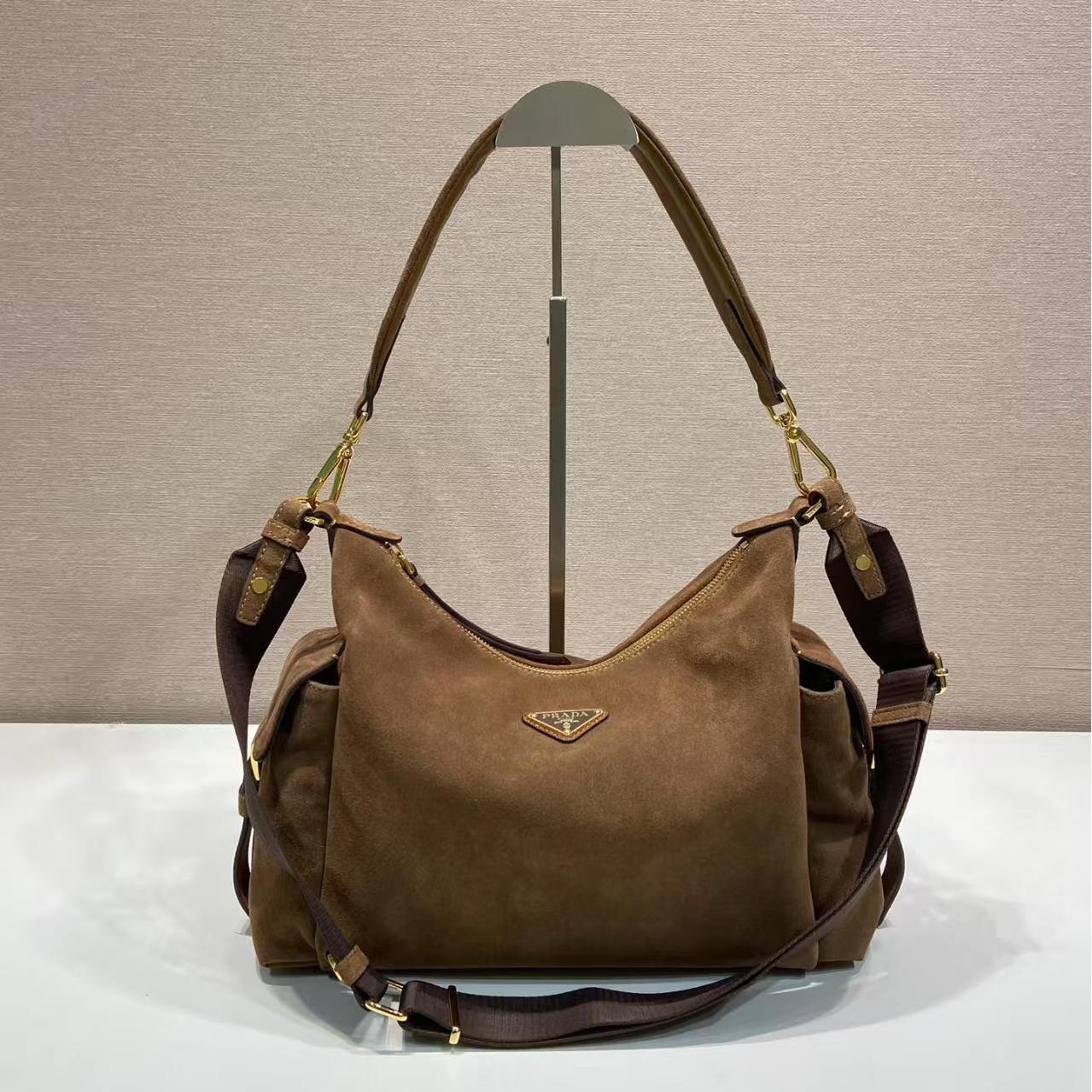 【介绍】 新品麂皮探索包,这款探索包采用进口麂皮,具有柔软的轮廓和多个口袋。轻质实用的Re-Nylon强调了设计的多功能风格,而皮革细节和标志性点缀则反映了P家的手工传统,配有2条可拆卸、可调节的编织标志带肩带。容量空间大,上身效果非常时尚。又是一款永久不过时爆款。值得拥有!