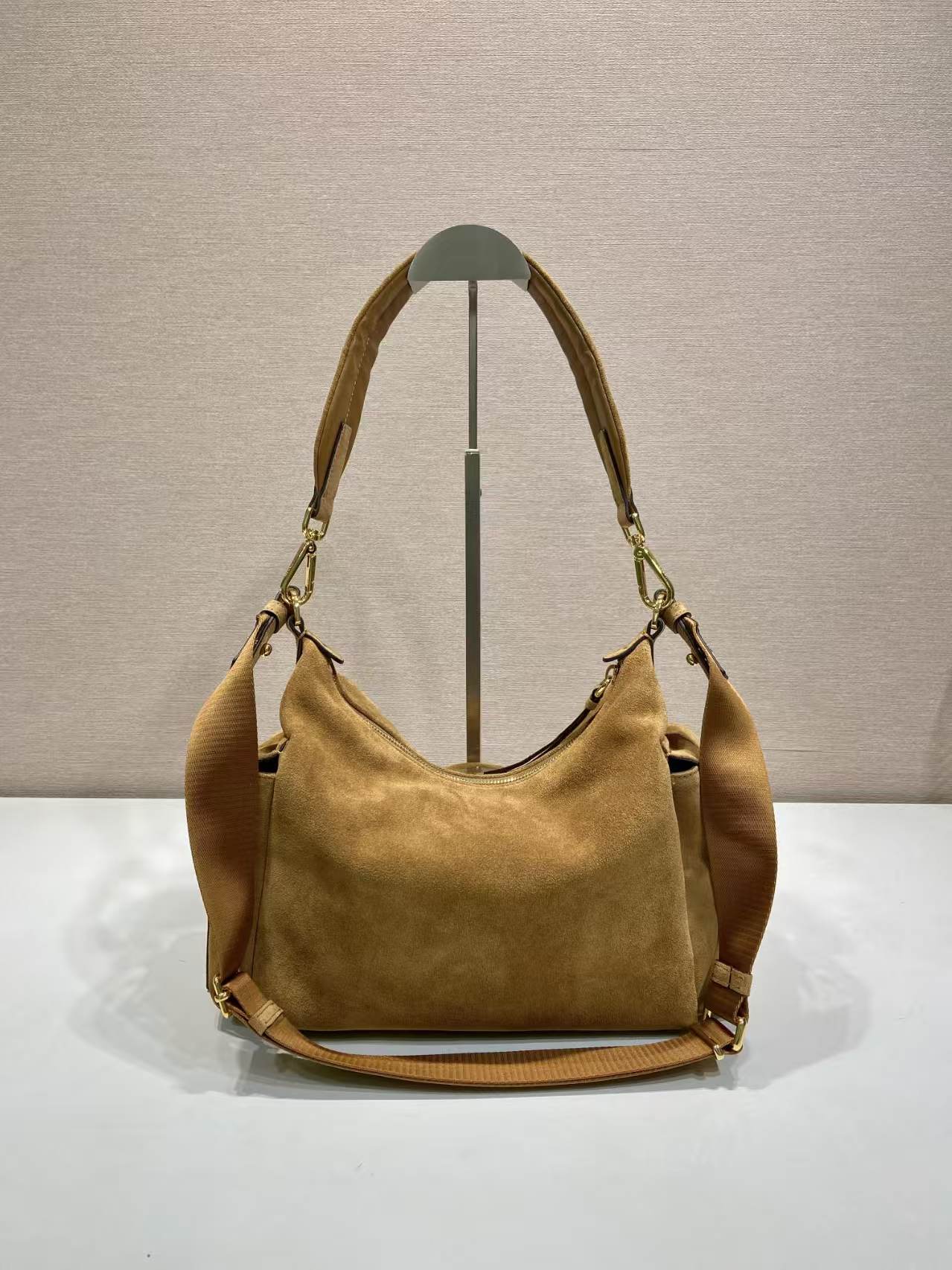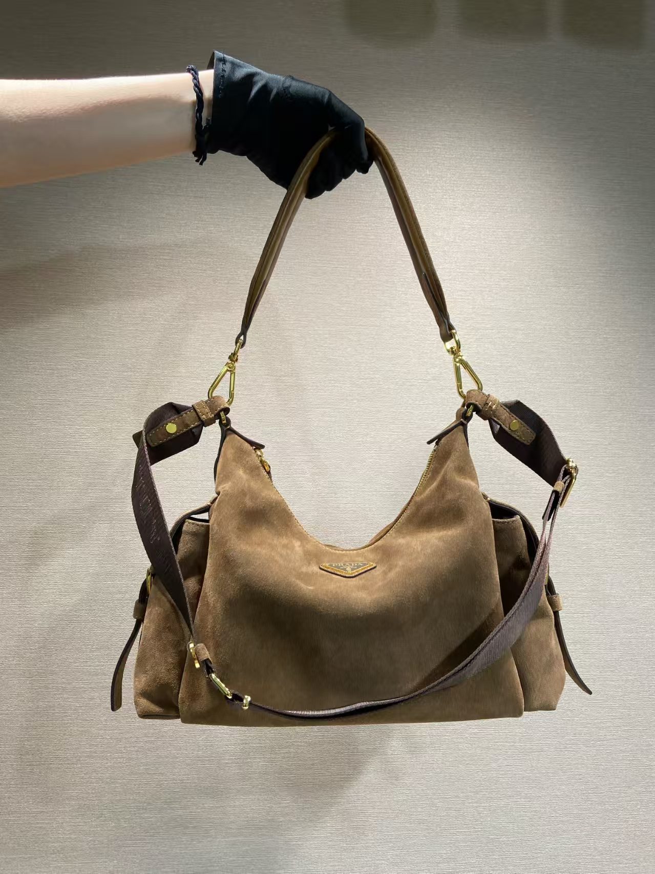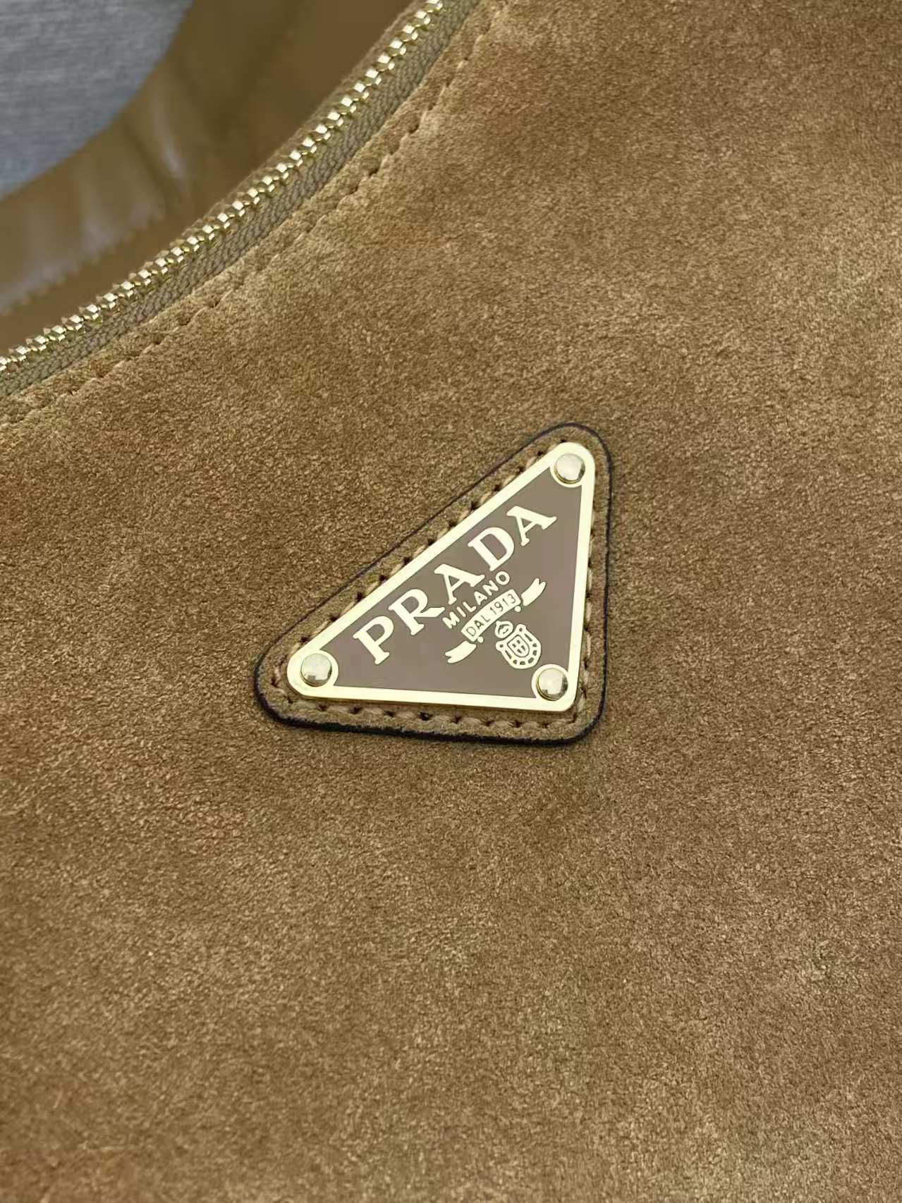 【介绍】 新品麂皮探索包,这款探索包采用进口麂皮,具有柔软的轮廓和多个口袋。轻质实用的Re-Nylon强调了设计的多功能风格,而皮革细节和标志性点缀则反映了P家的手工传统,配有2条可拆卸、可调节的编织标志带肩带。容量空间大,上身效果非常时尚。又是一款永久不过时爆款。值得拥有!