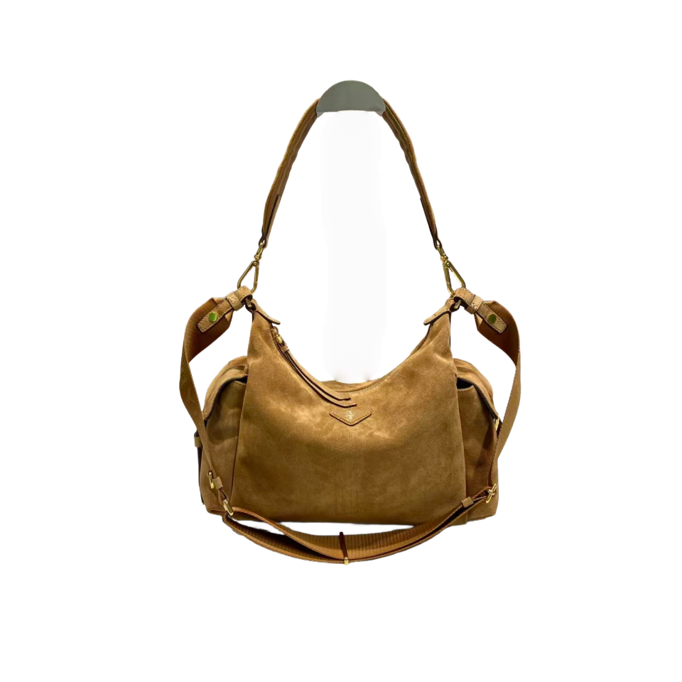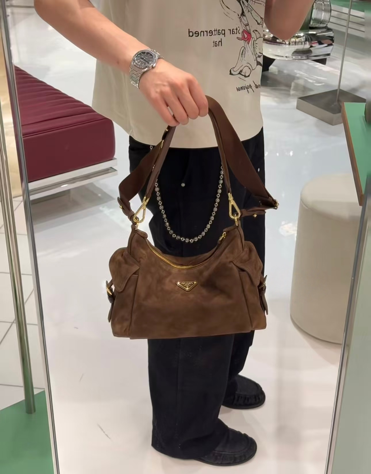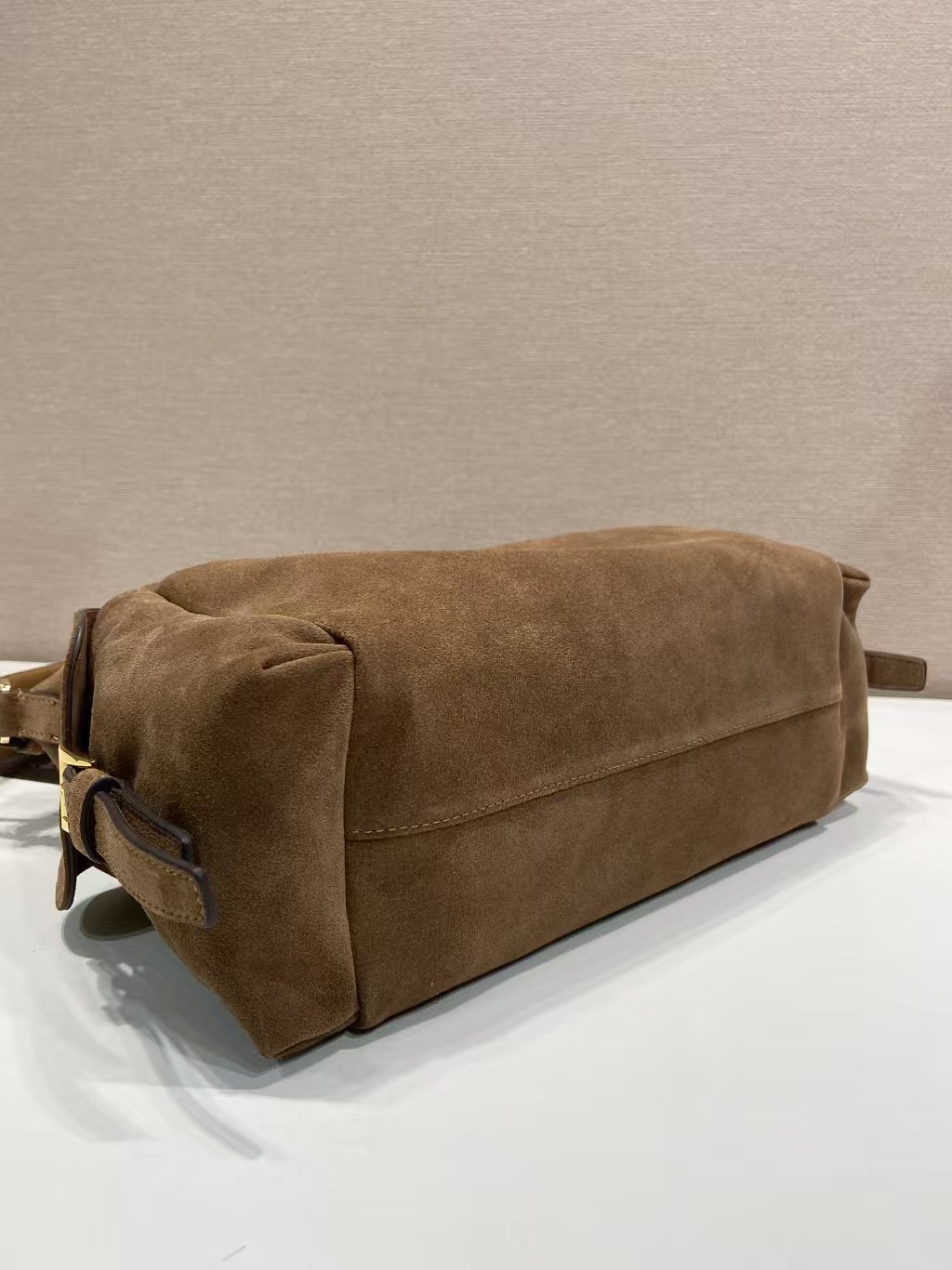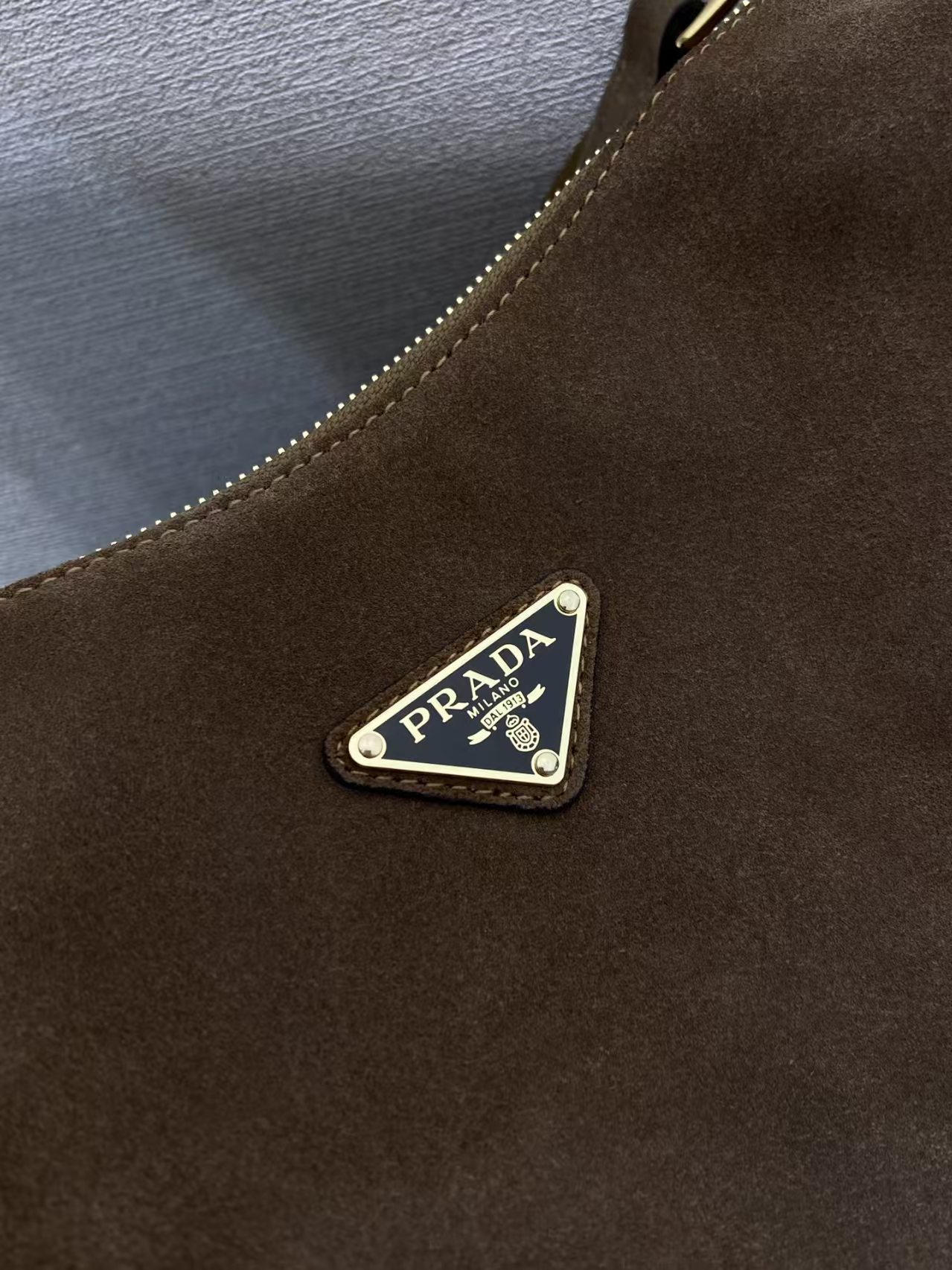 【介绍】 新品麂皮探索包,这款探索包采用进口麂皮,具有柔软的轮廓和多个口袋。轻质实用的Re-Nylon强调了设计的多功能风格,而皮革细节和标志性点缀则反映了P家的手工传统,配有2条可拆卸、可调节的编织标志带肩带。容量空间大,上身效果非常时尚。又是一款永久不过时爆款。值得拥有!