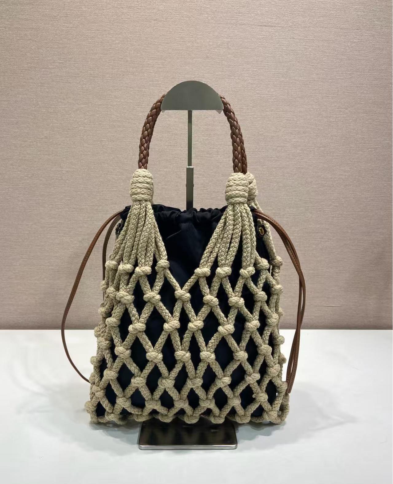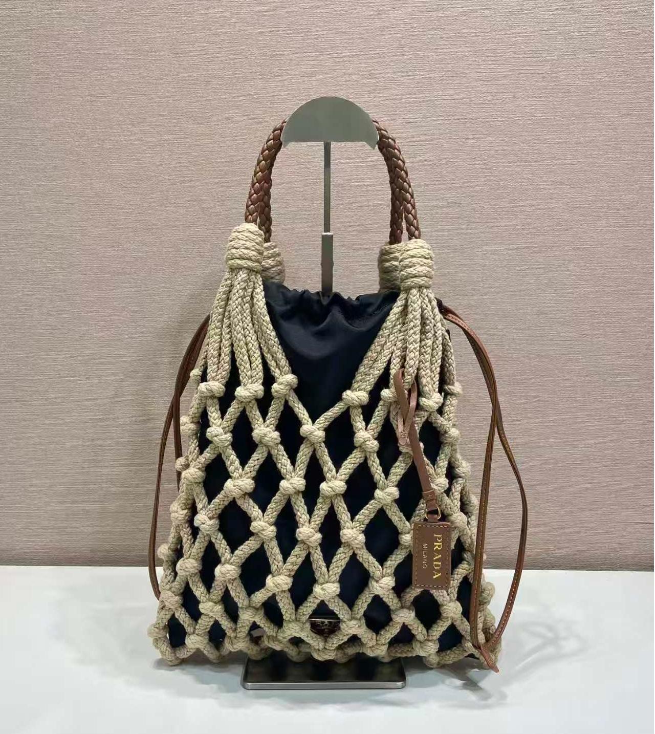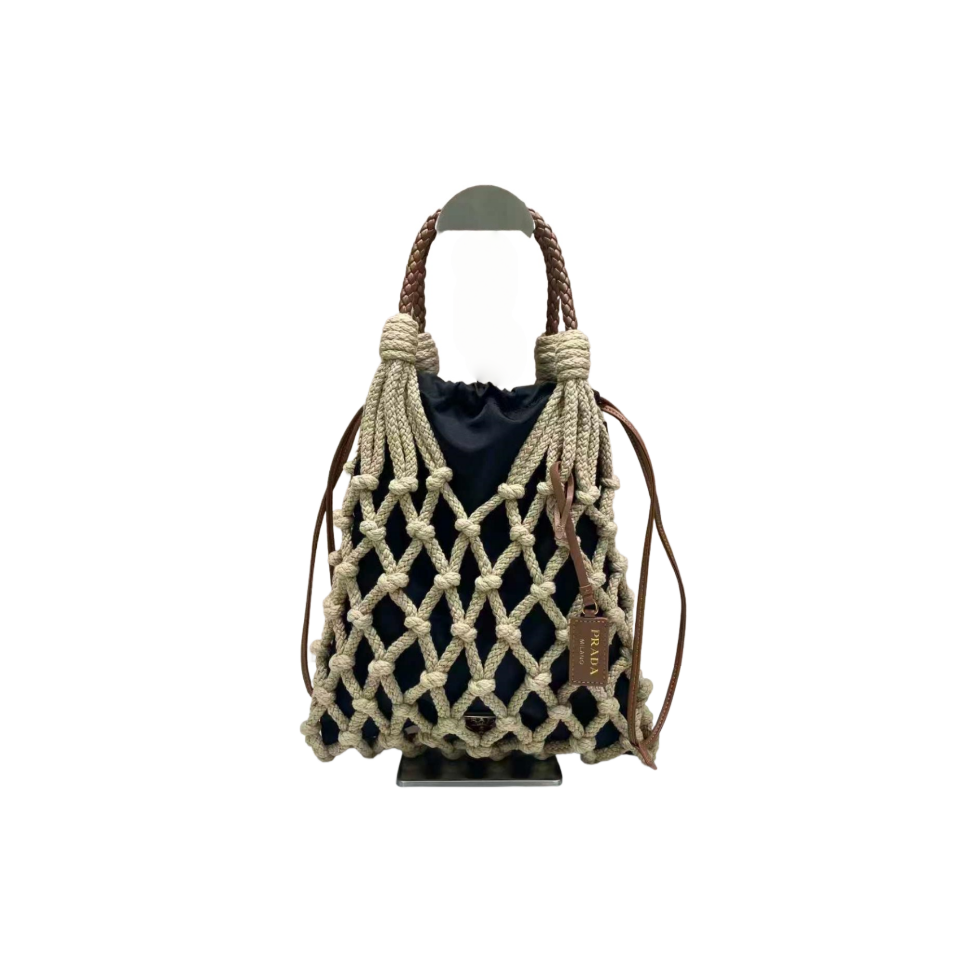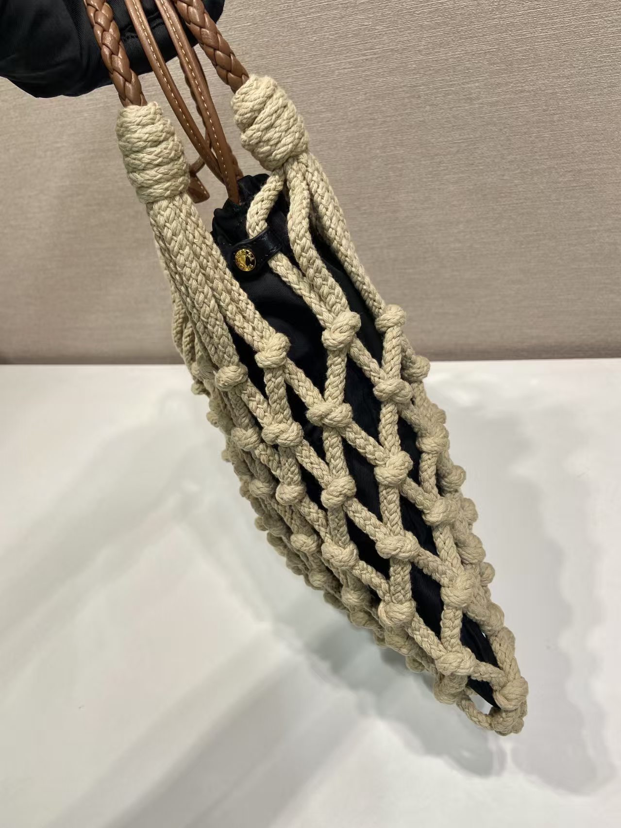 【介绍】 这款手工线绳包的macramé设计,采用纯手工编织和尼龙面料,体现了清新的优雅和真实的自由感。编织皮革手柄,可拆卸皮革吊坠和金属硬件,可拆卸抽绳,二合一设计,容量空间大,非常时尚。