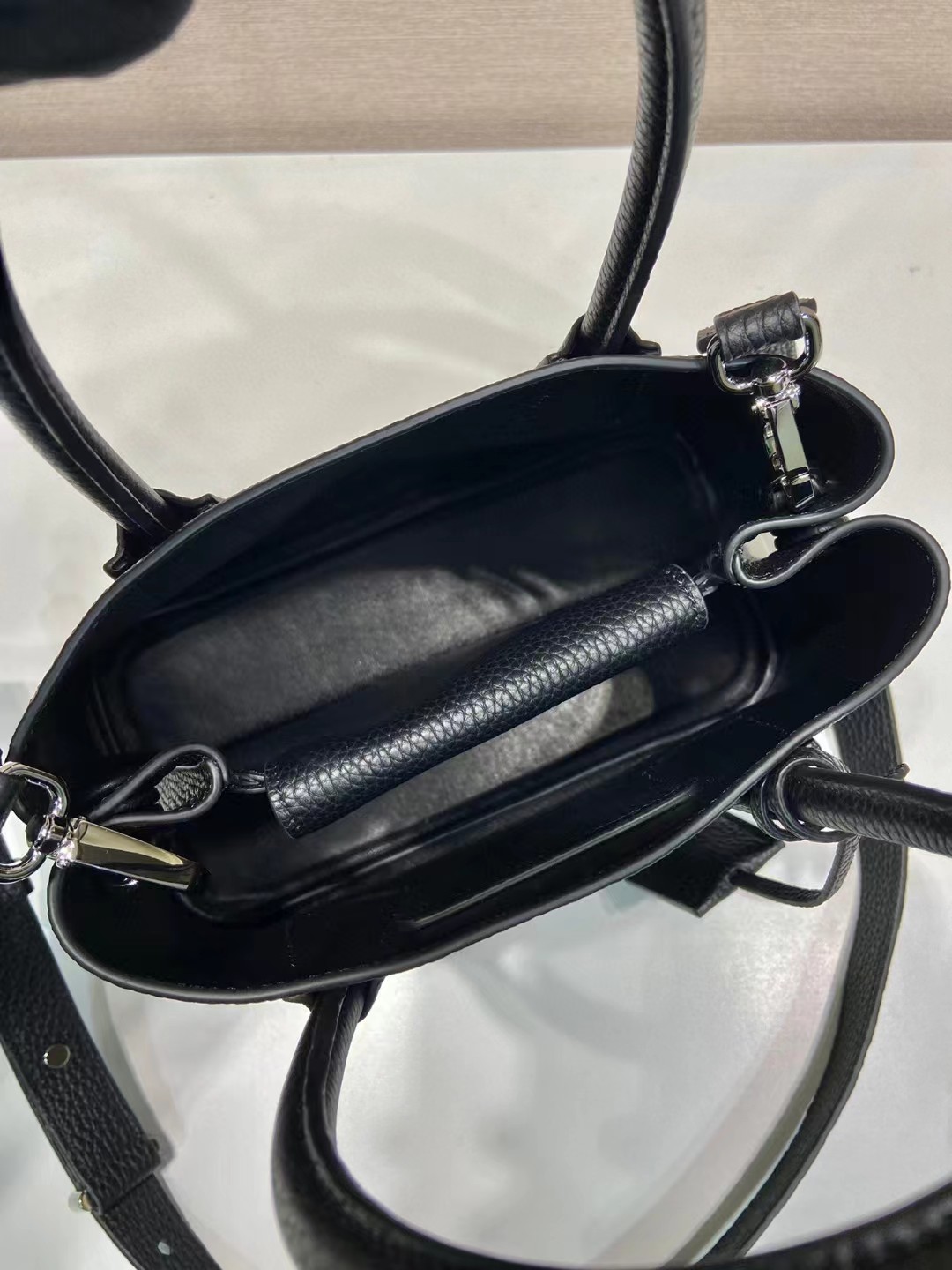 包包非常喜欢,跟朋友的正品对比,皮质手感一模一样,很惊讶。黑色好搭配衣服,感谢