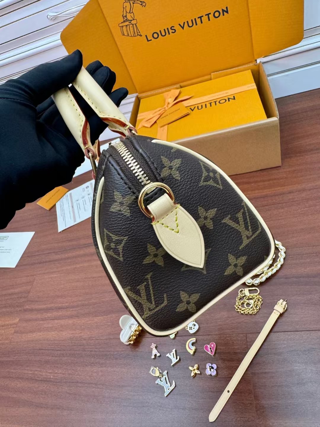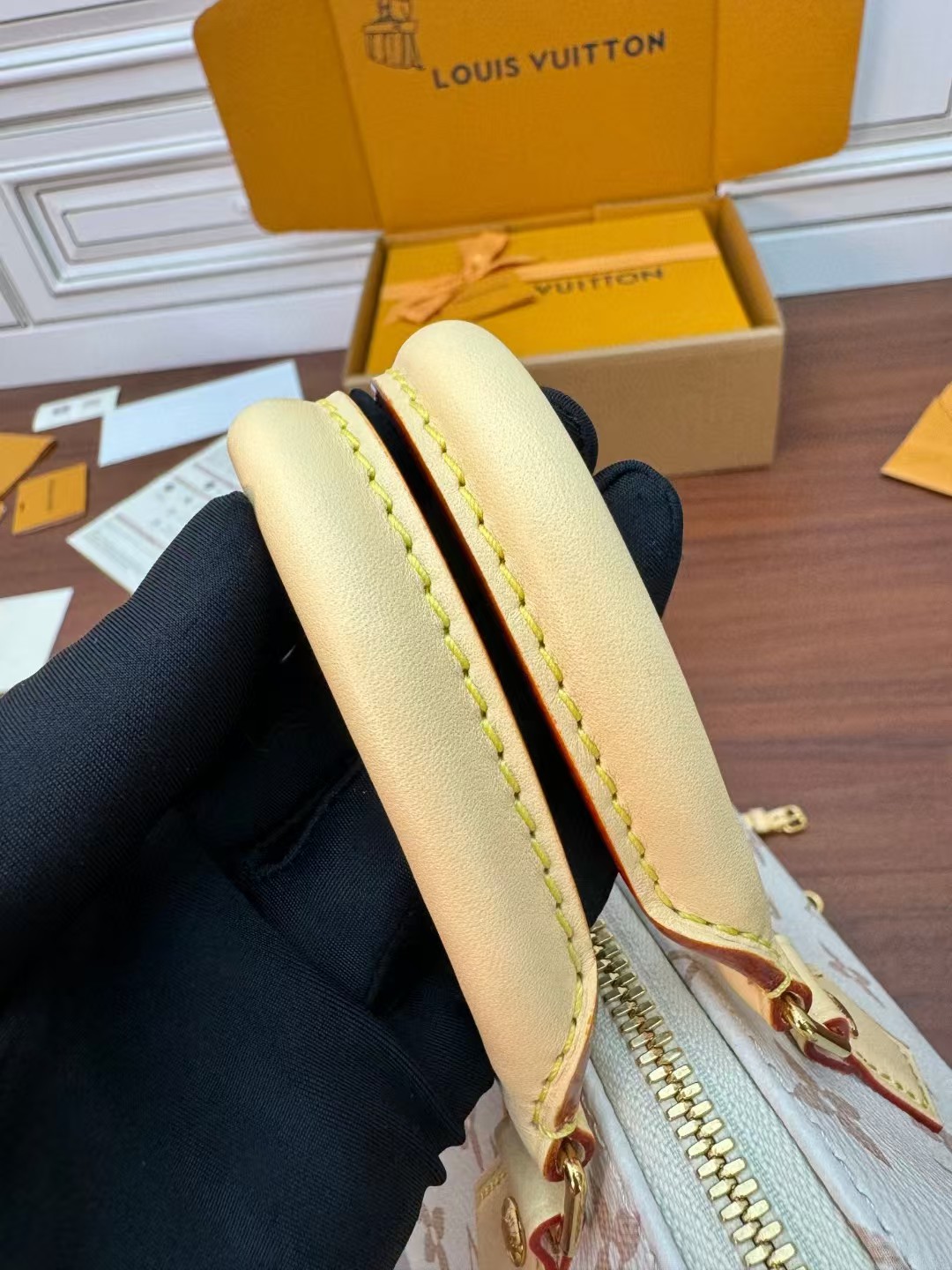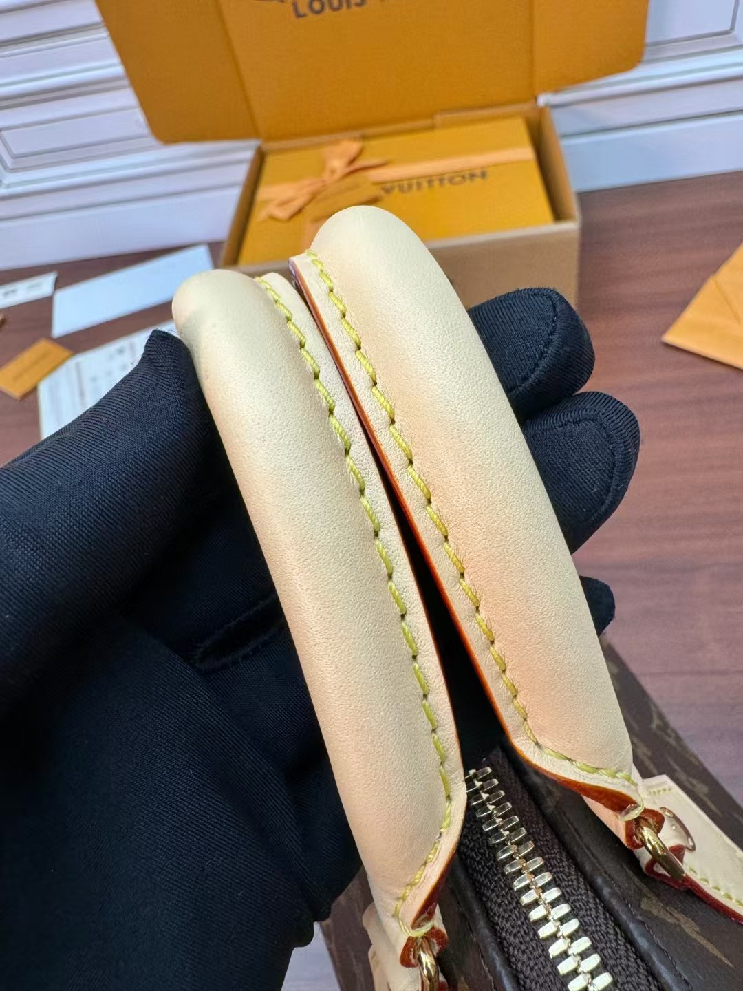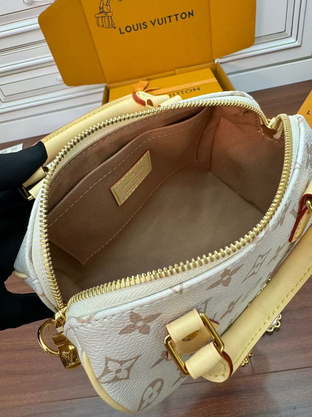 收到包包就打开包装,全方位拍照看看有没有瑕疵,品相完美,感谢!