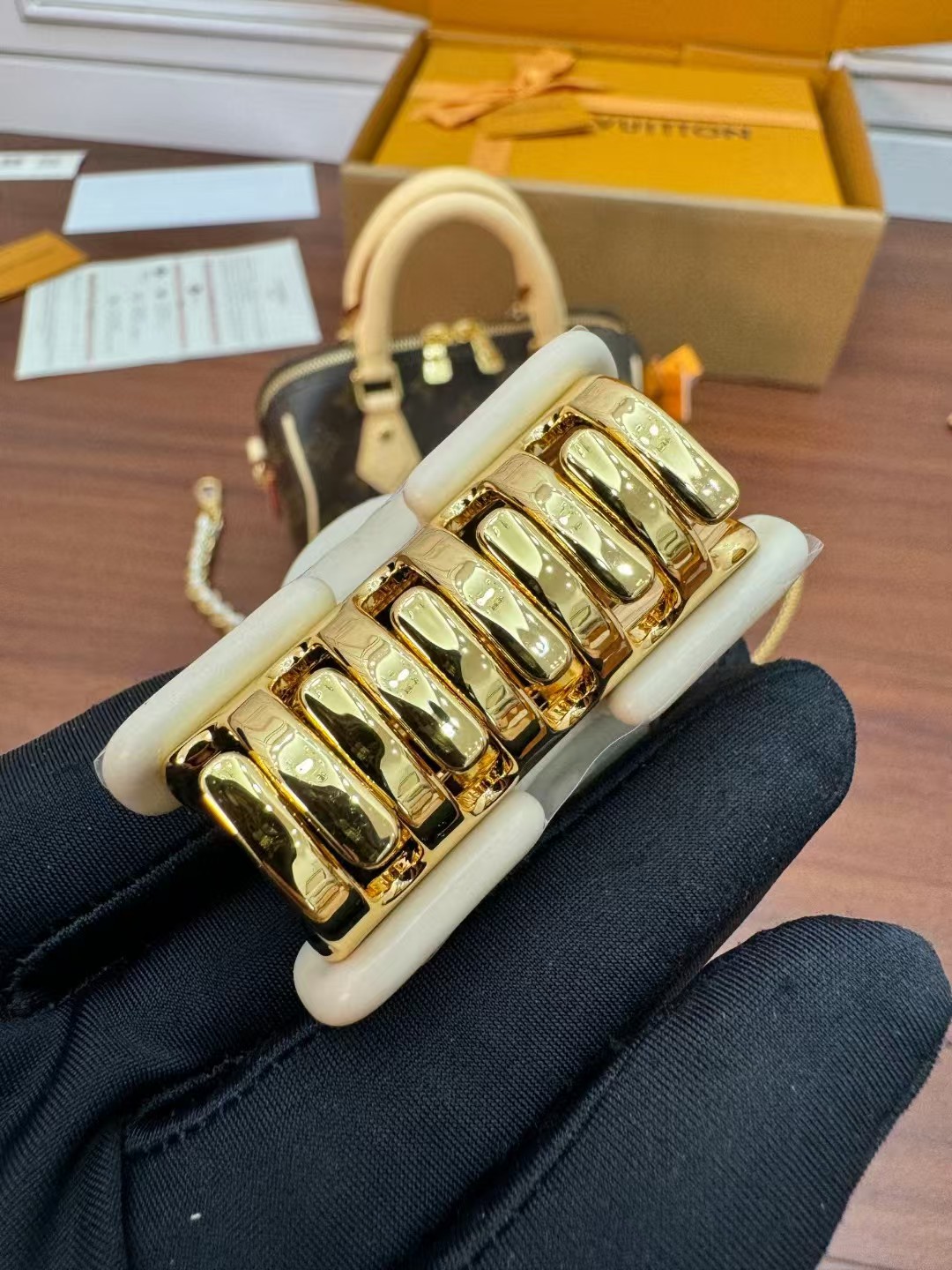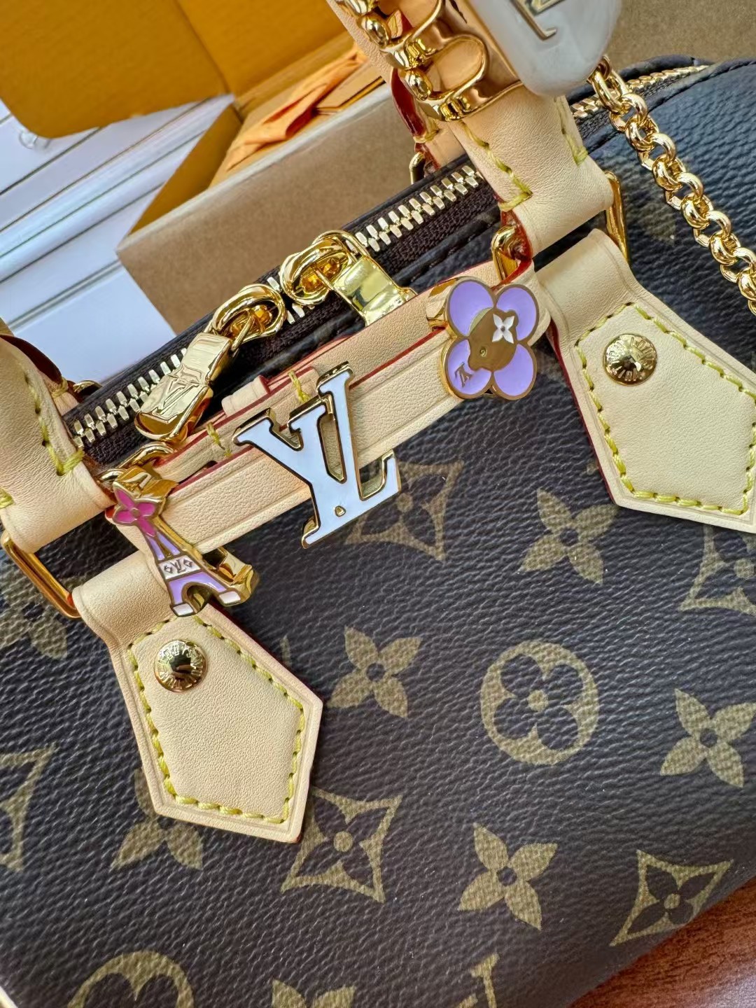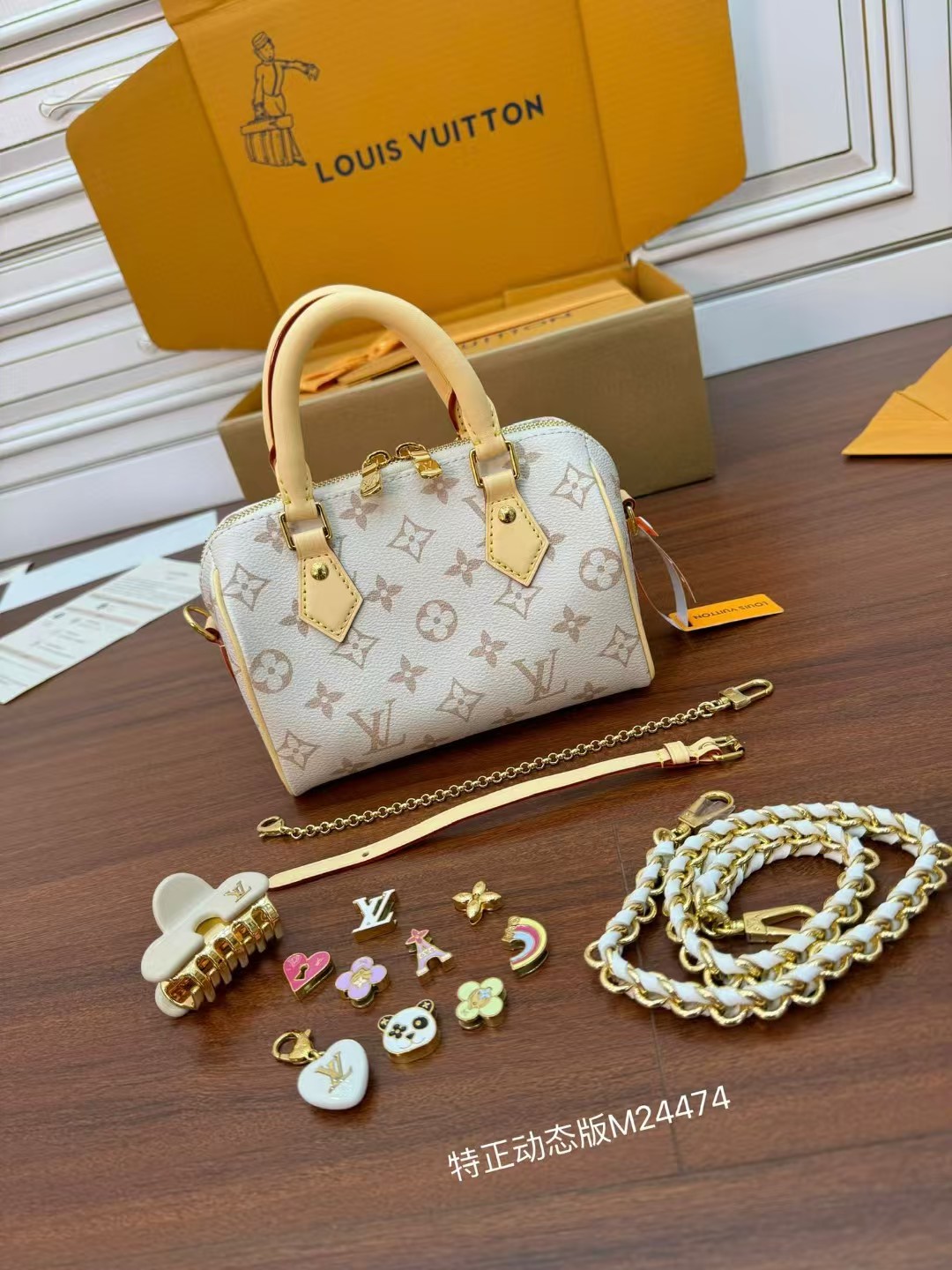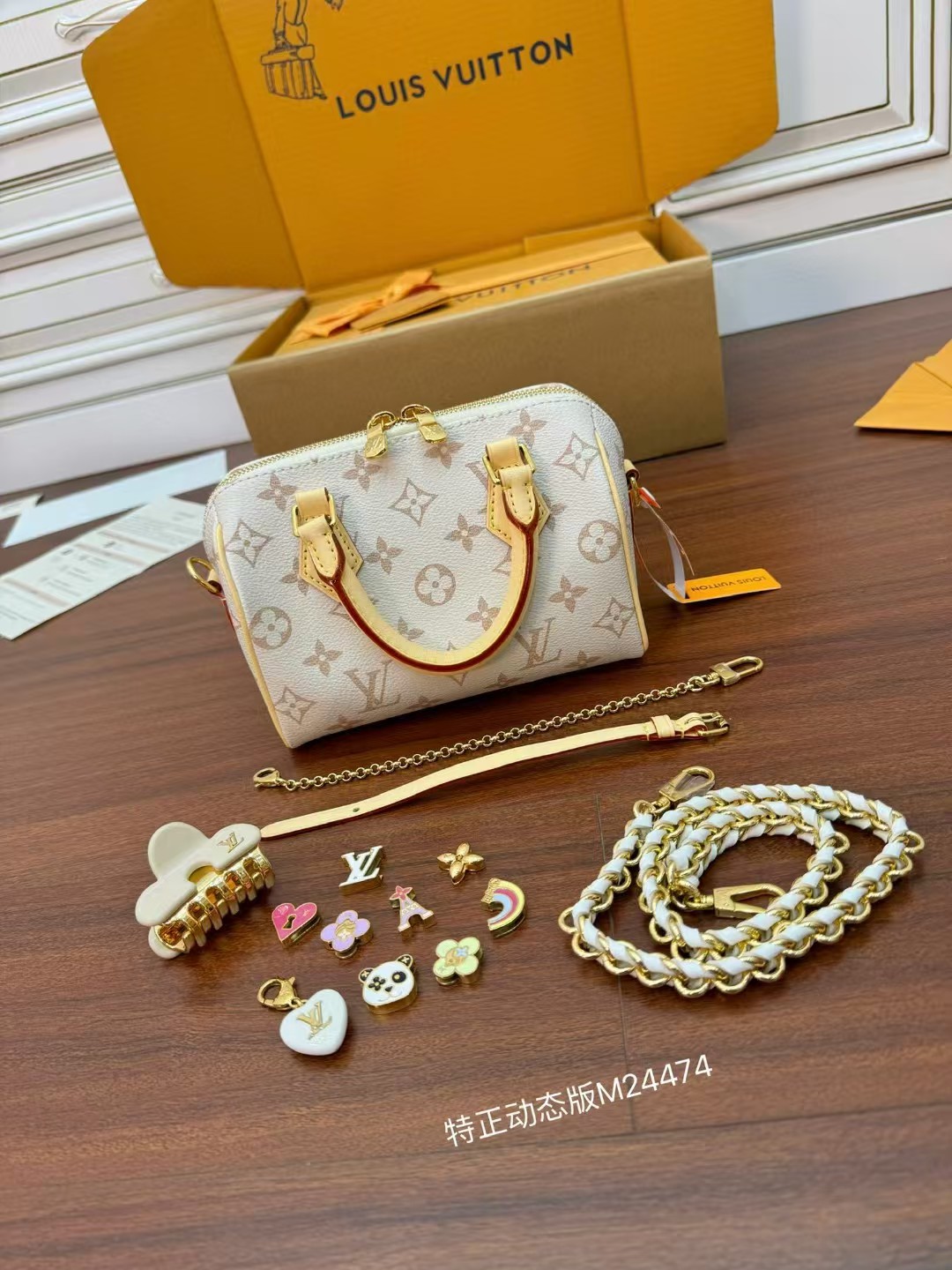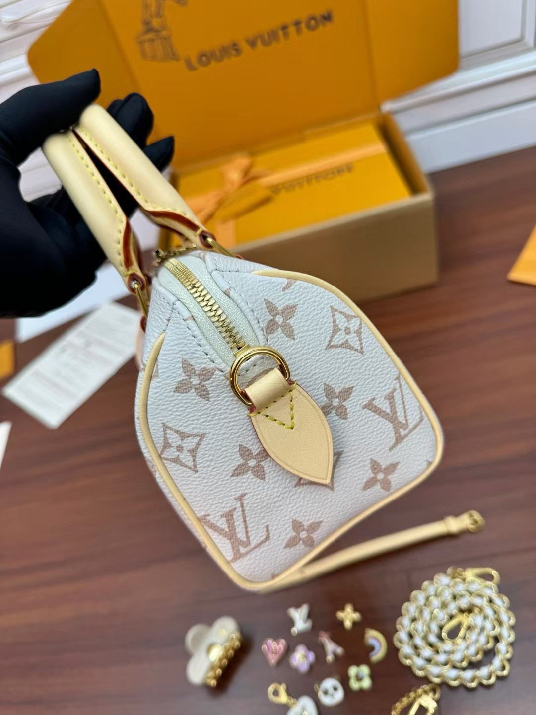 收到包包就打开包装,全方位拍照看看有没有瑕疵,品相完美,感谢!