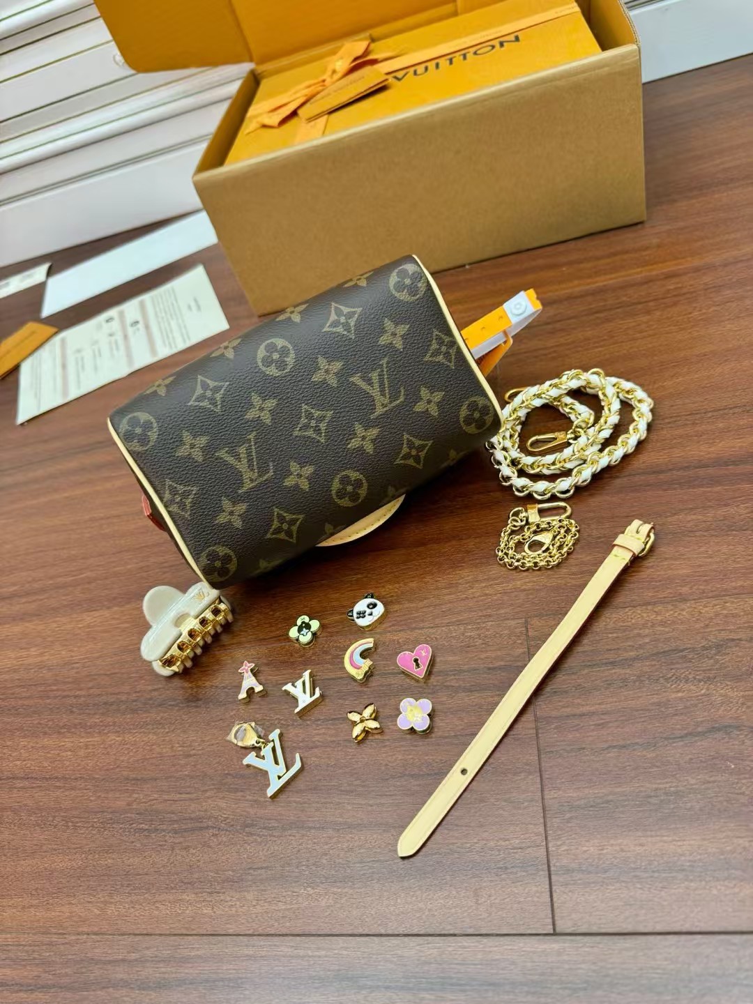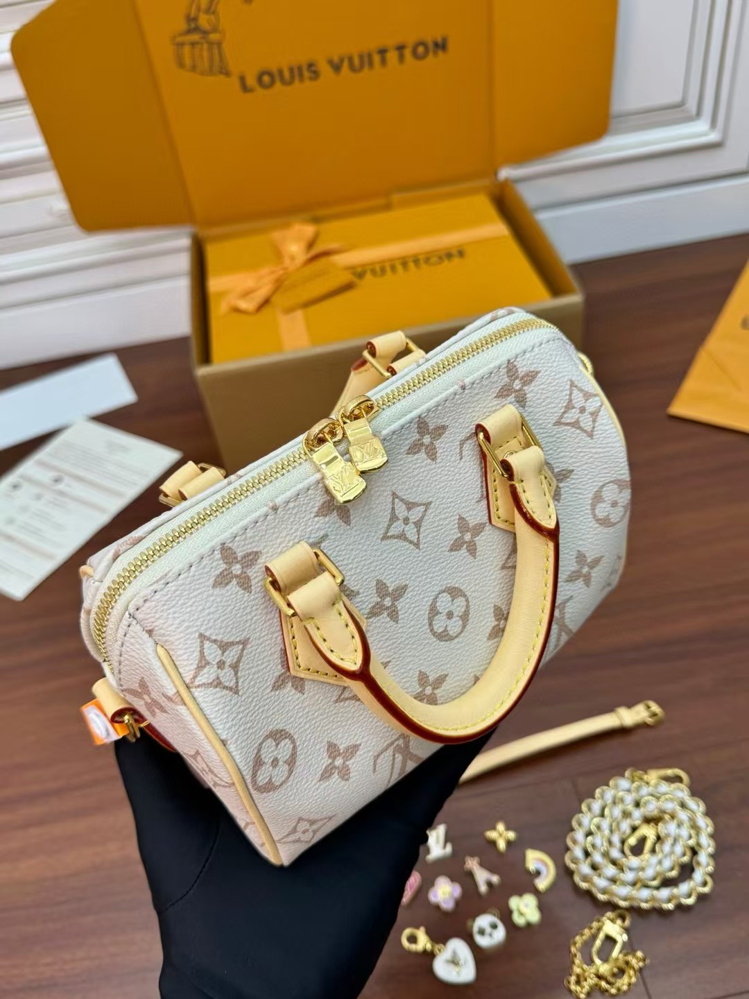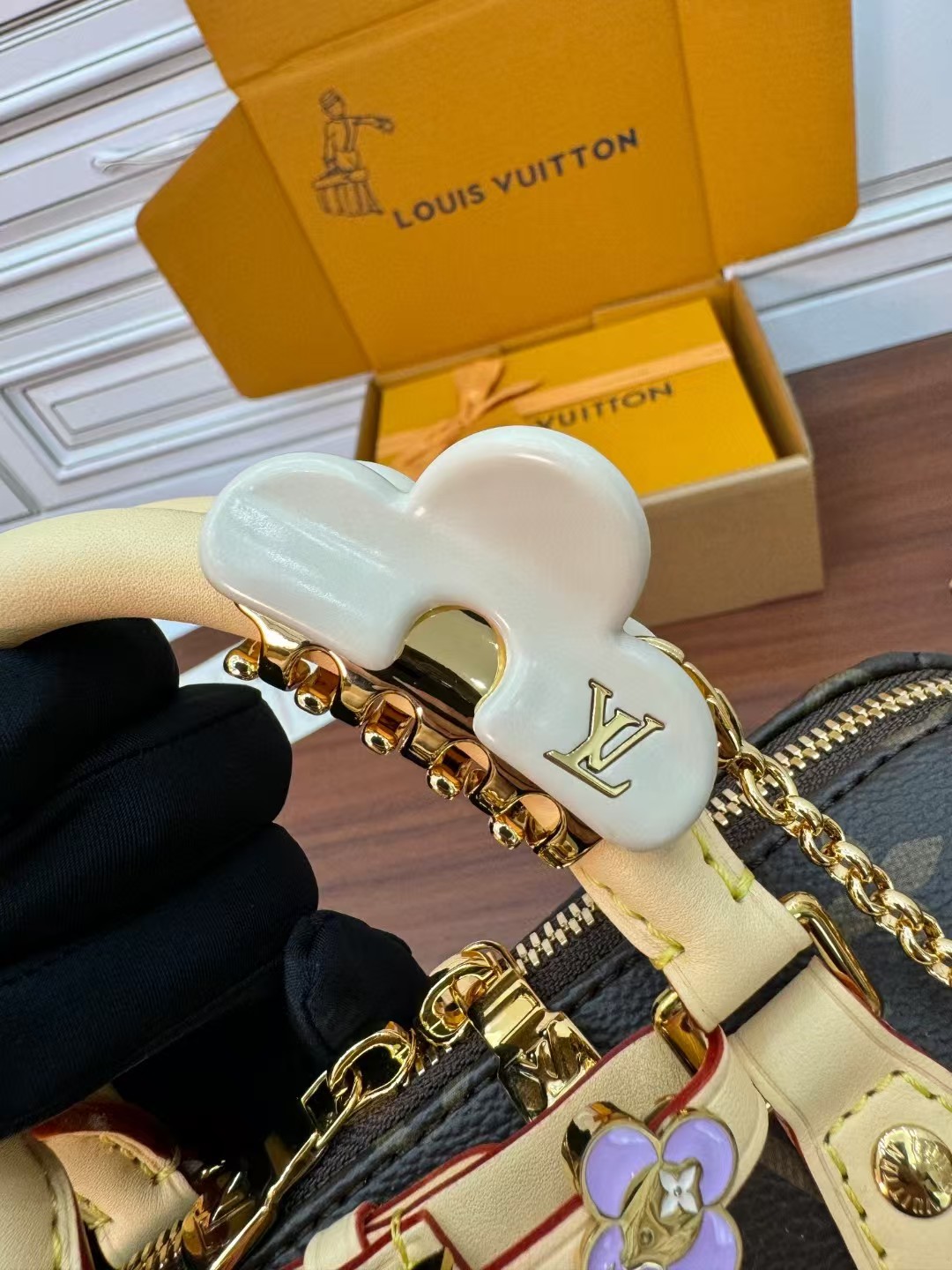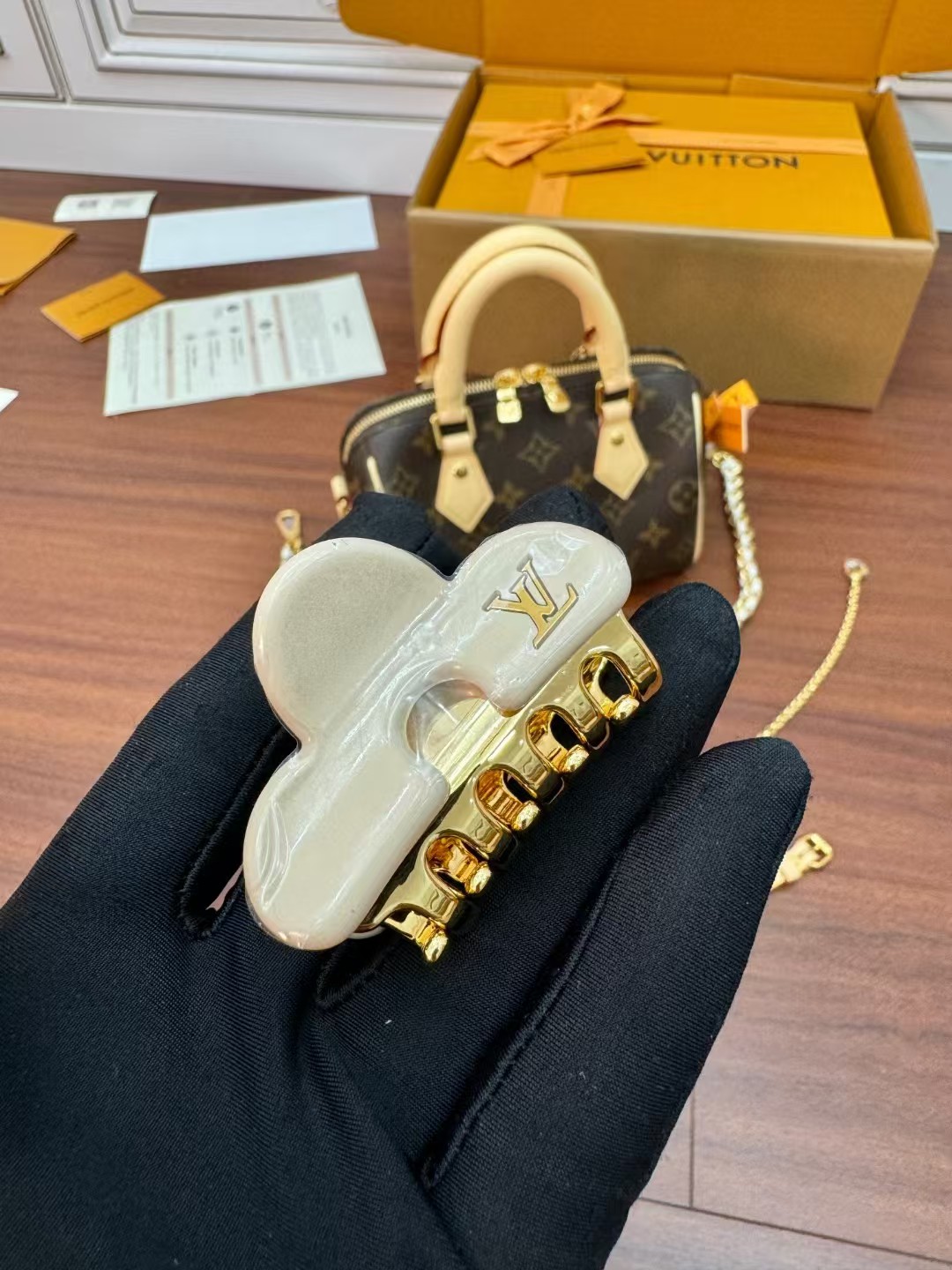 收到包包就打开包装,全方位拍照看看有没有瑕疵,品相完美,感谢!