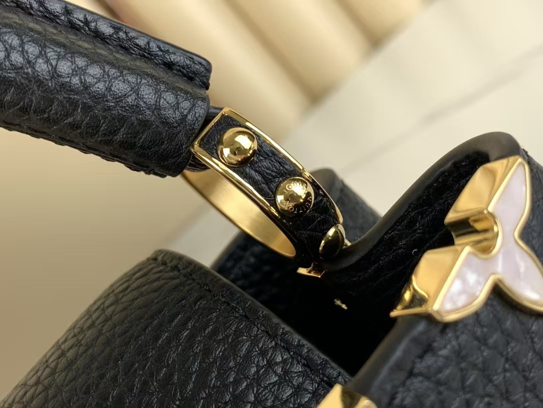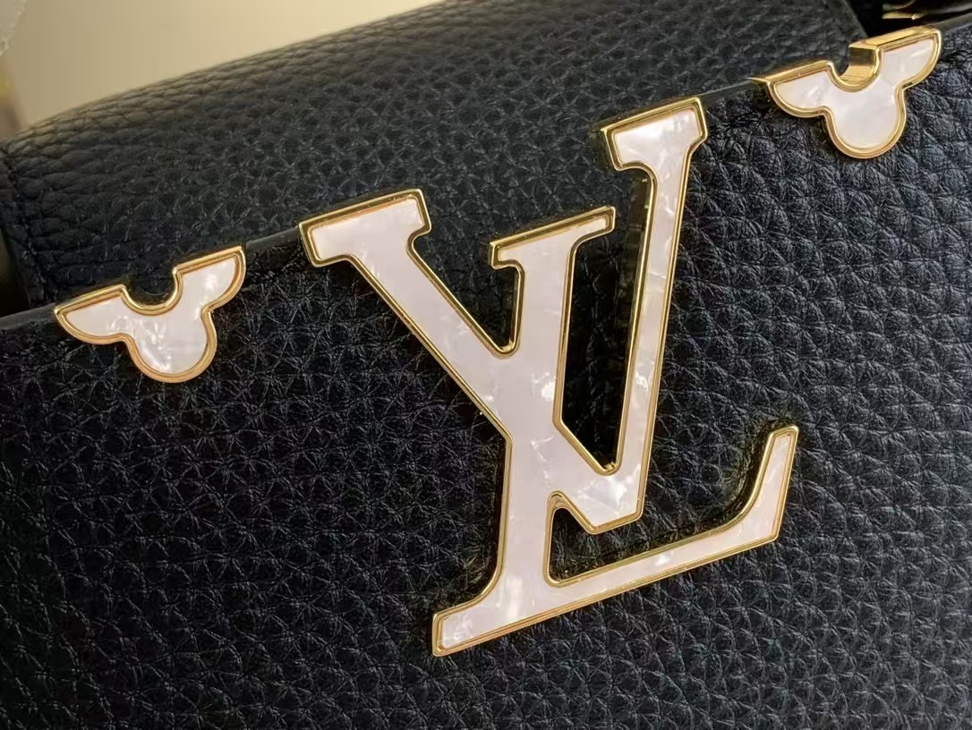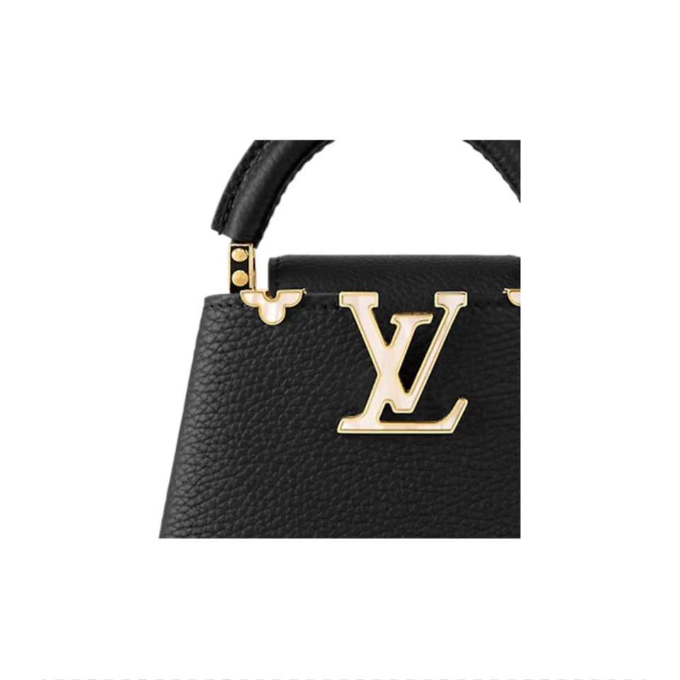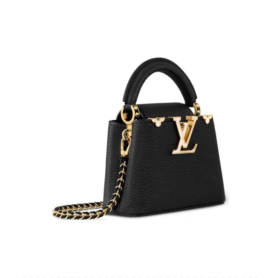 【介绍】 本款Capucines Nano手袋出自CapucinesFlower Crown 系列,以粒面 Taurillon 牛皮革裁出玲珑构型,轻松驾驭昼夜场合。Monogram 花卉闪烁贝壳莹泽,将LV字母簇拥其间,宛如珠宝般雅致华美。可拆卸链条再添功能细节。