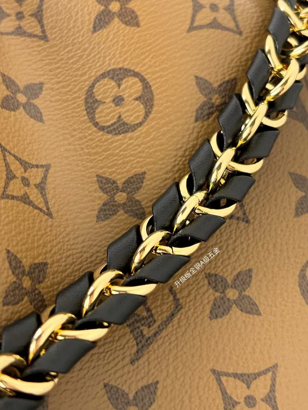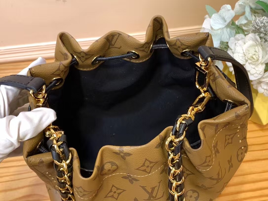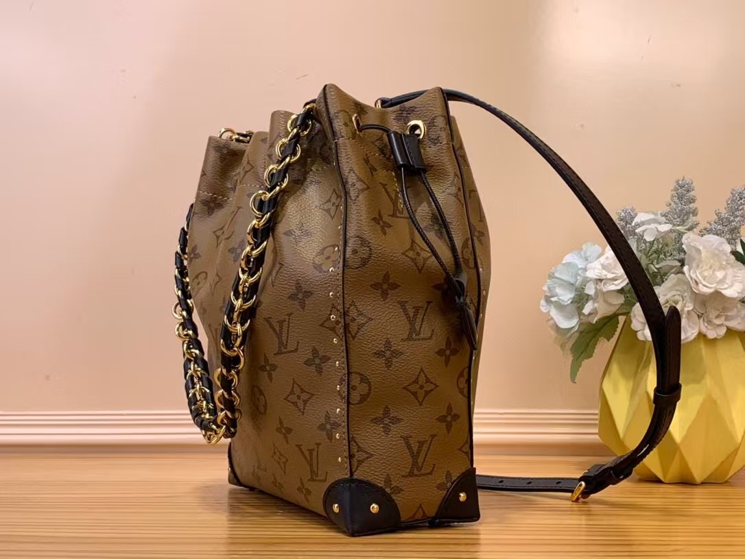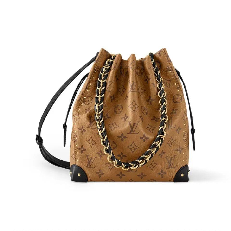 【介绍】 【NOÉ TRUNK 小号手袋 】 黄花/铆钉。2025 Cruise Xl早春系列重绎经典 Noé 手袋,为 Trunk 家族再添新成员。Monogram Reverse 帆布包身配有耀目编织链条,皮革包角和抽绳开合延续标志性细节,手提或斜挎皆可再现秀场造型。