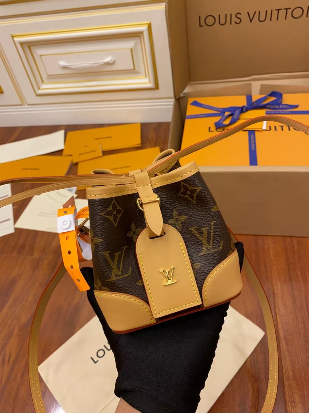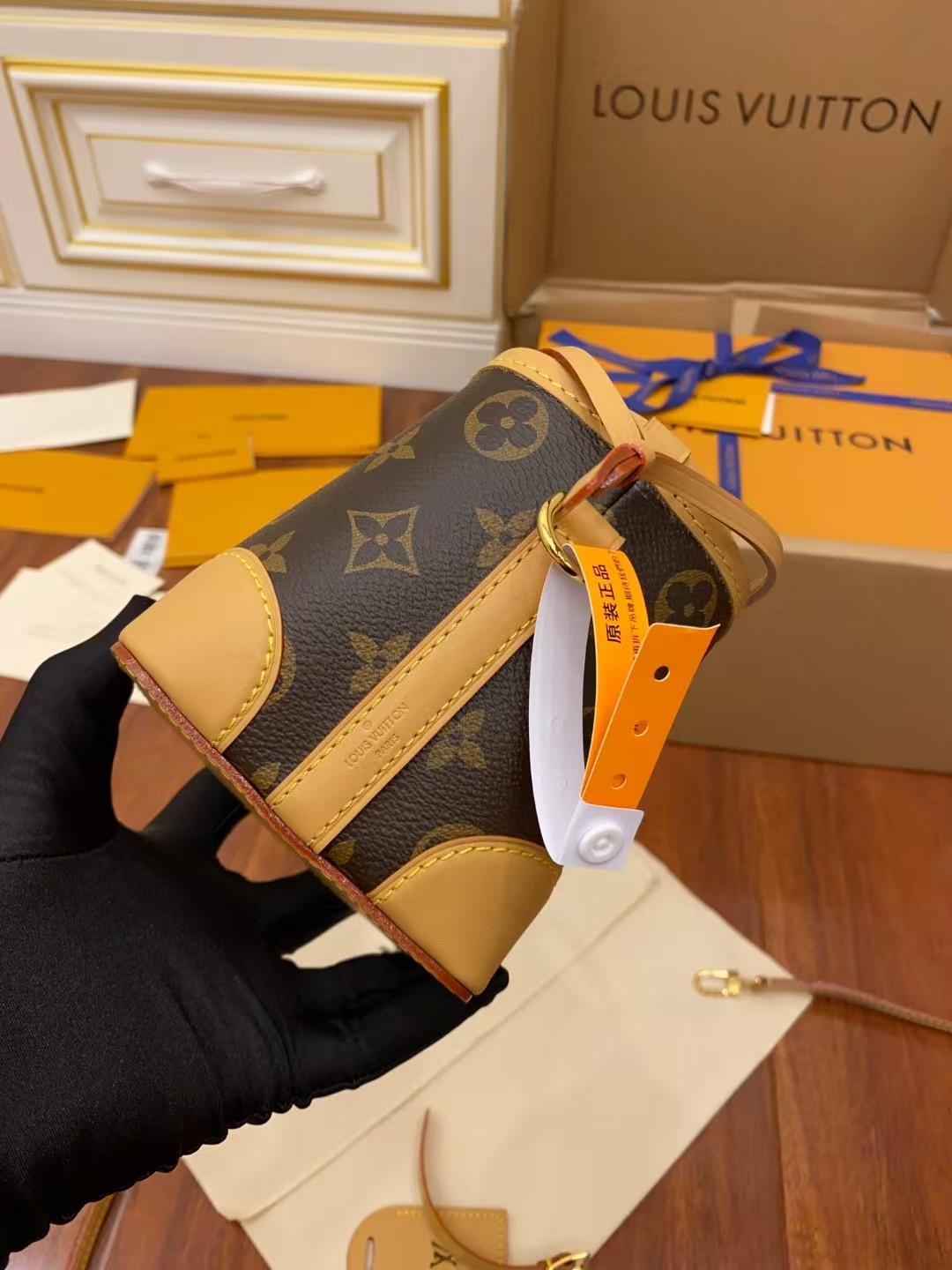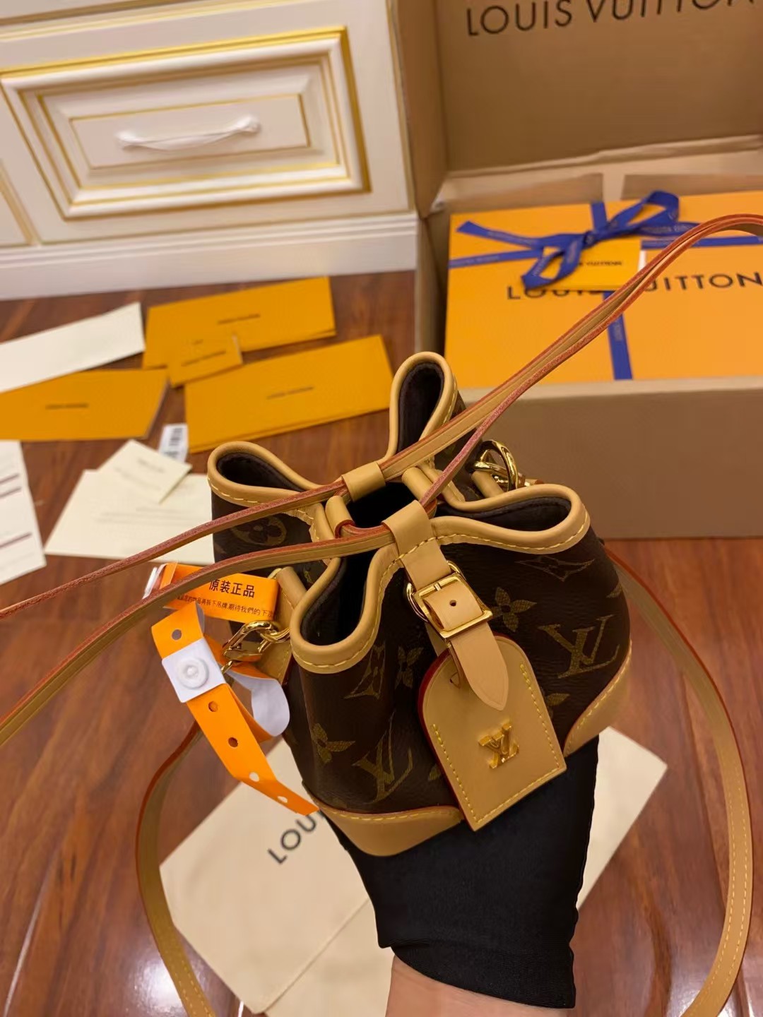 收到包包就打开包装,全方位拍照看看有没有瑕疵,品相完美,感谢!