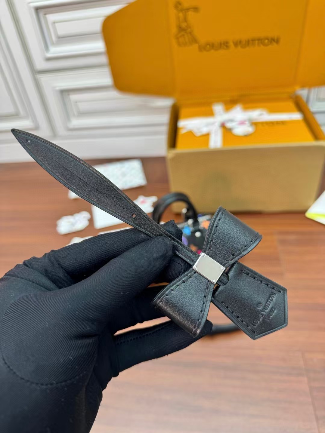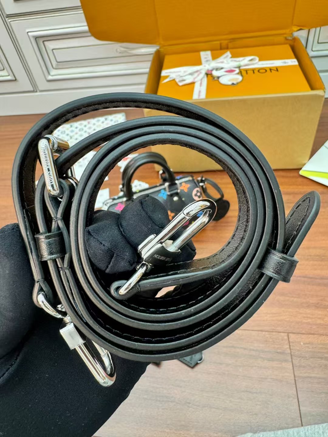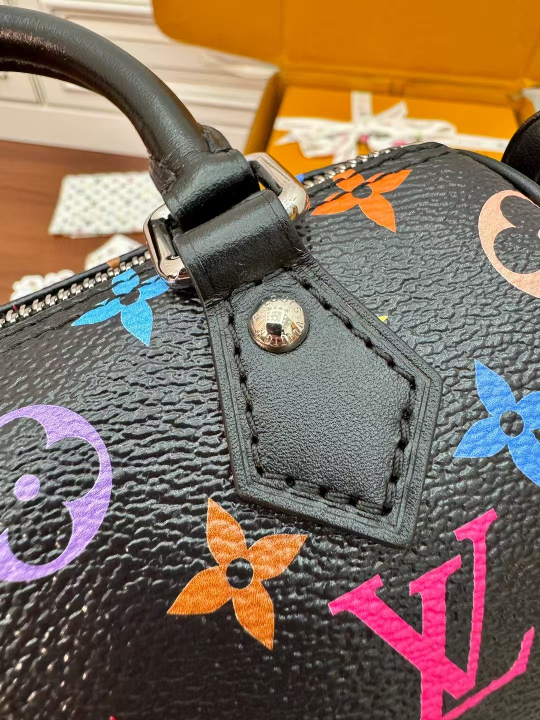 收到包包就打开包装,全方位拍照看看有没有瑕疵,品相完美,感谢!