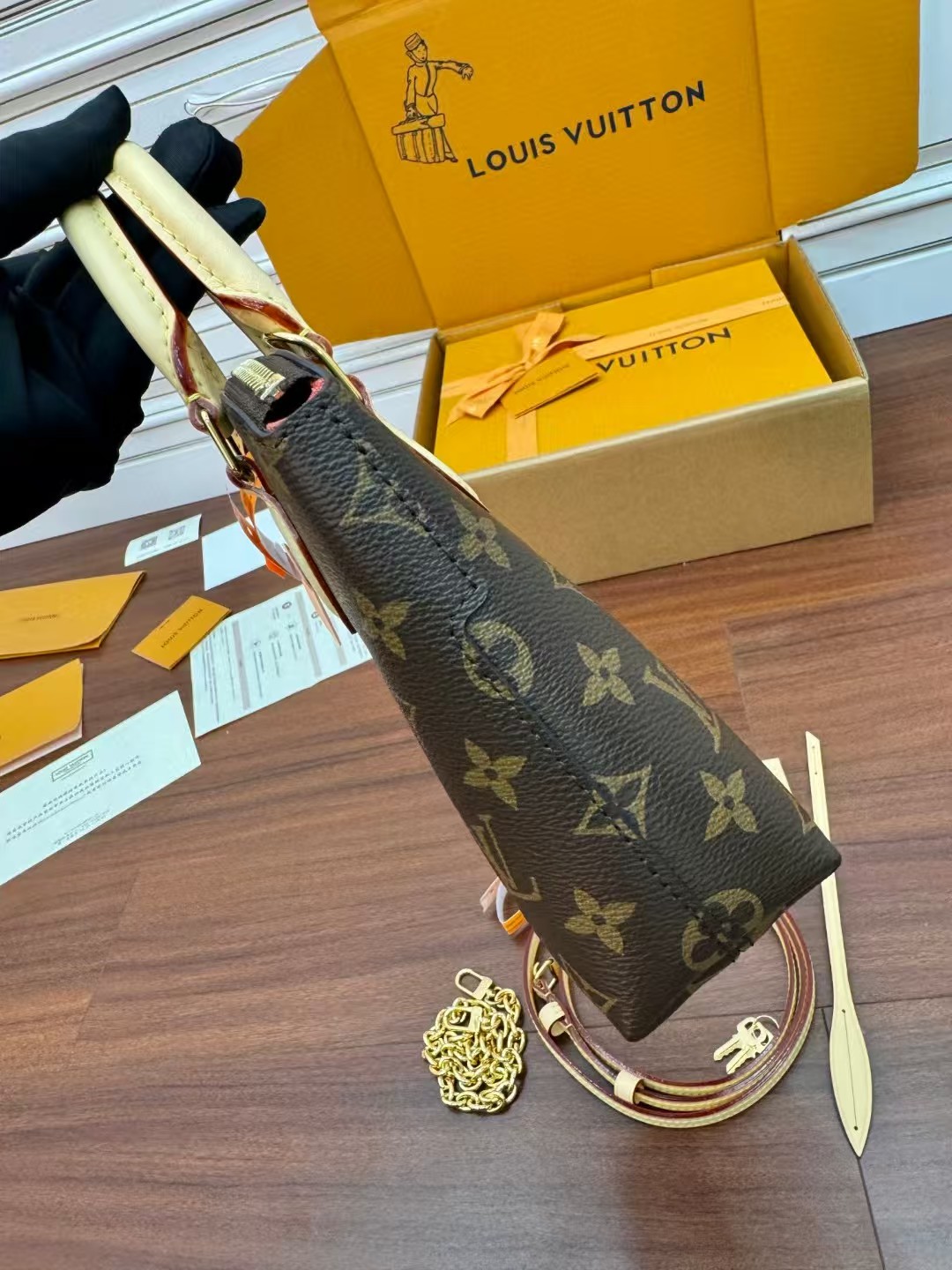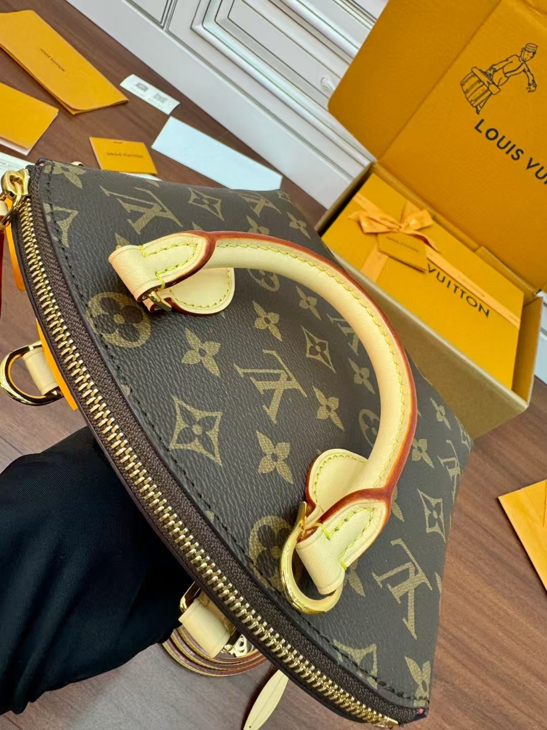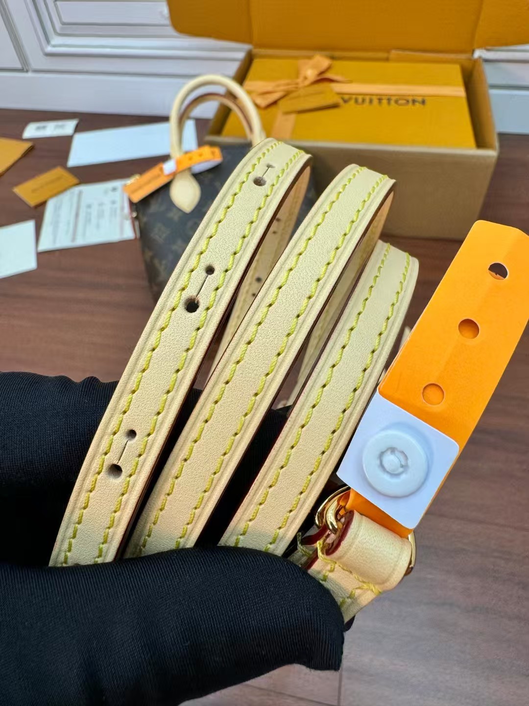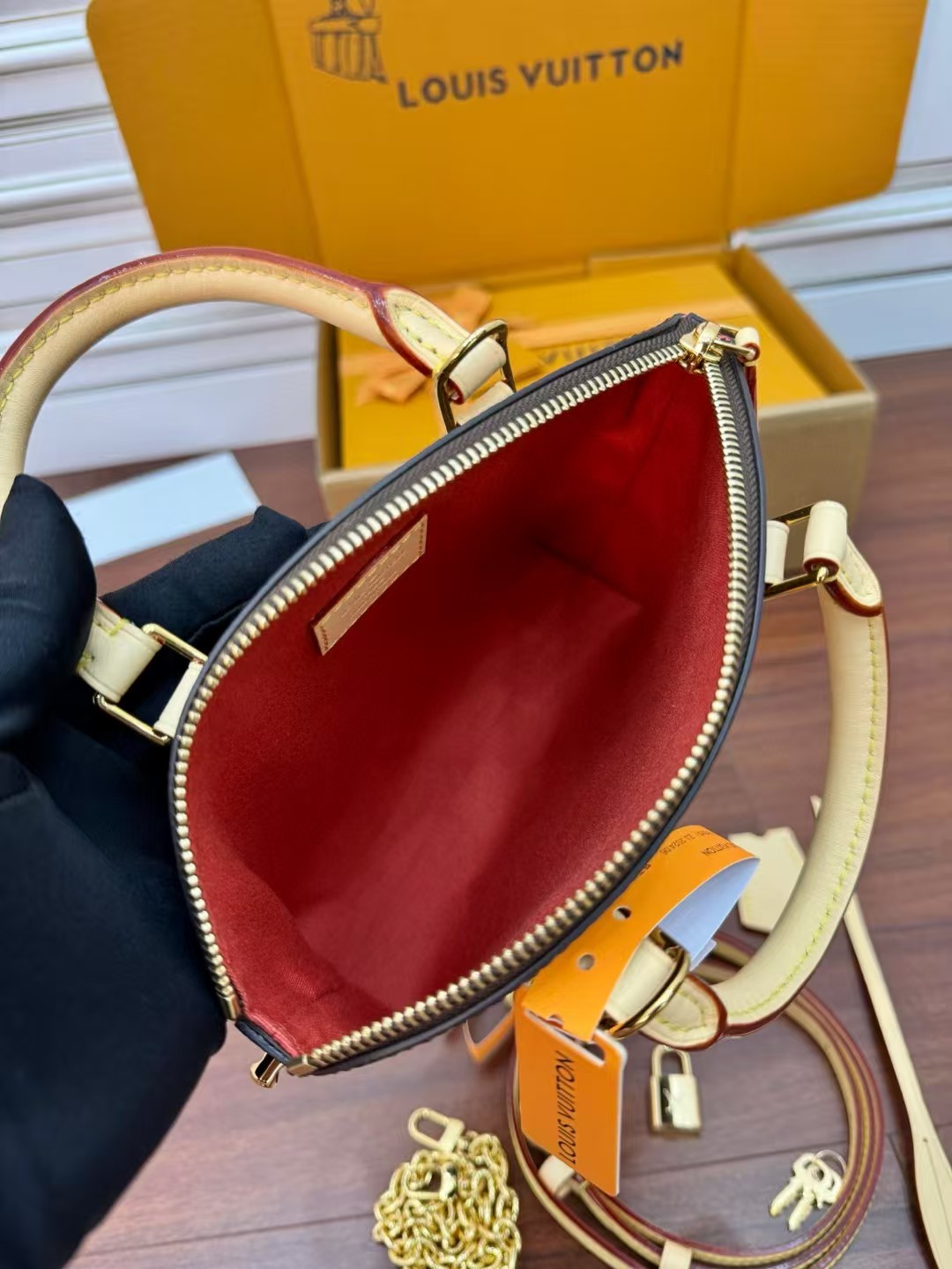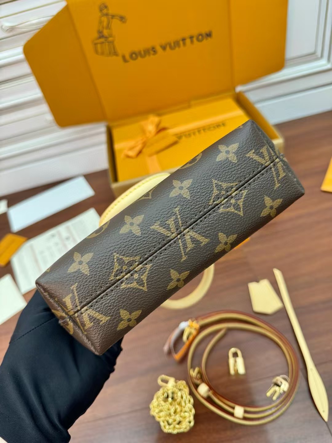 收到包包就打开包装,全方位拍照看看有没有瑕疵,品相完美,感谢!