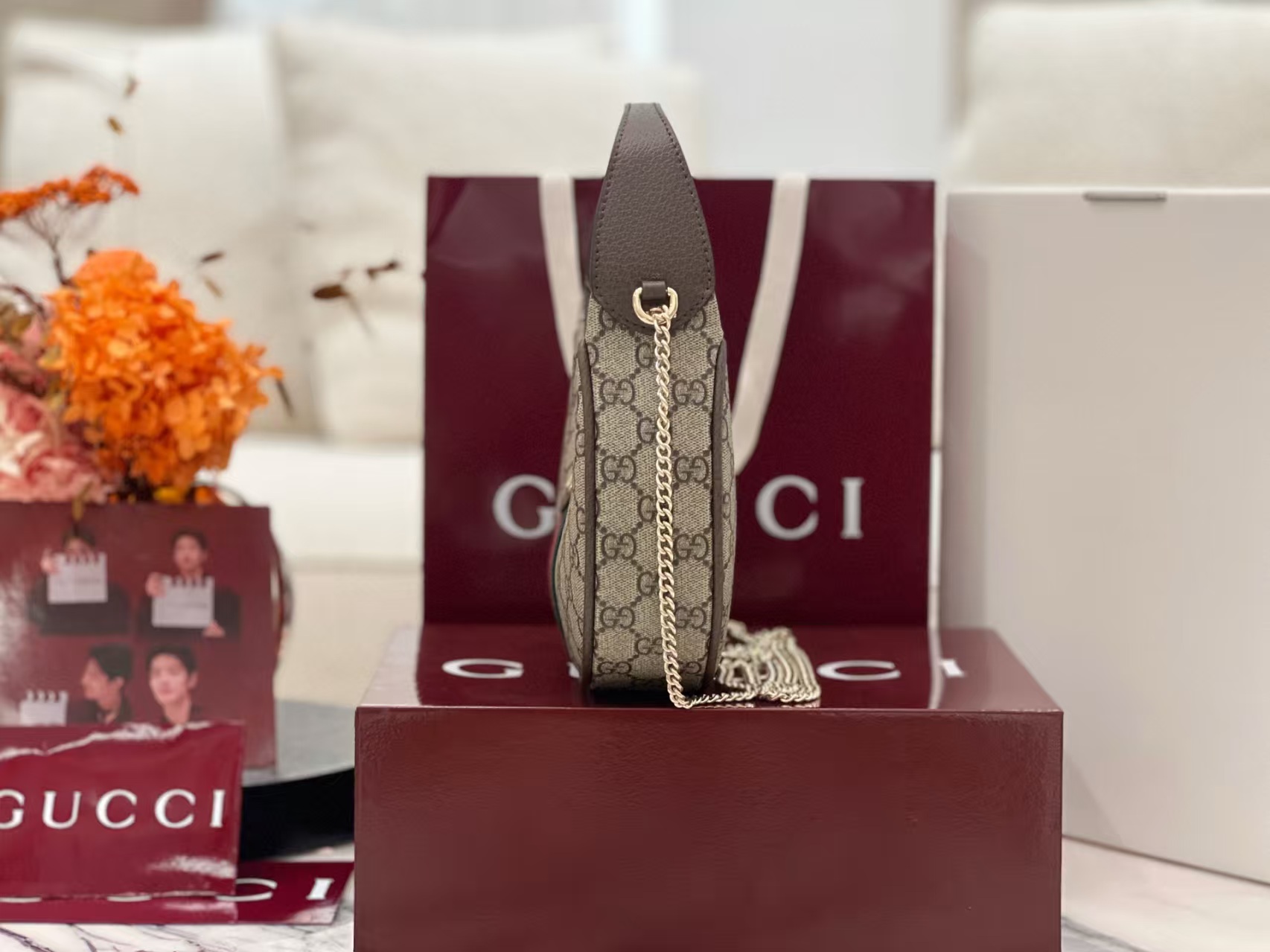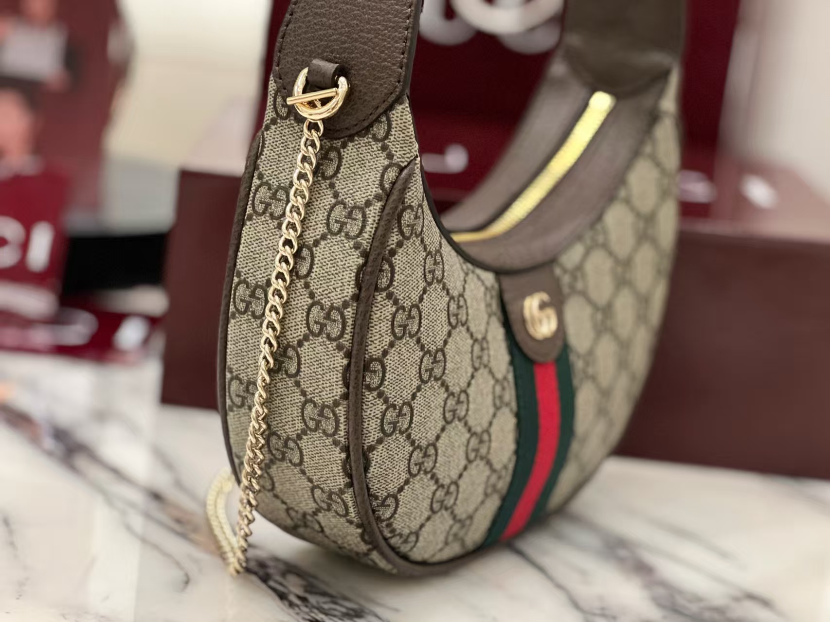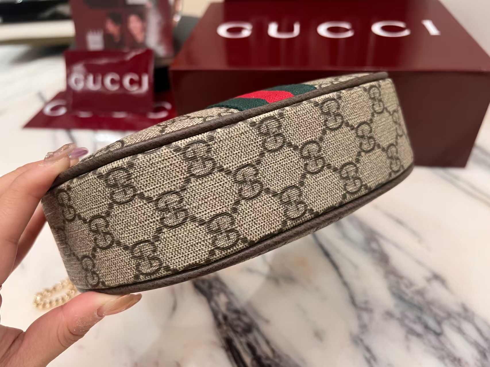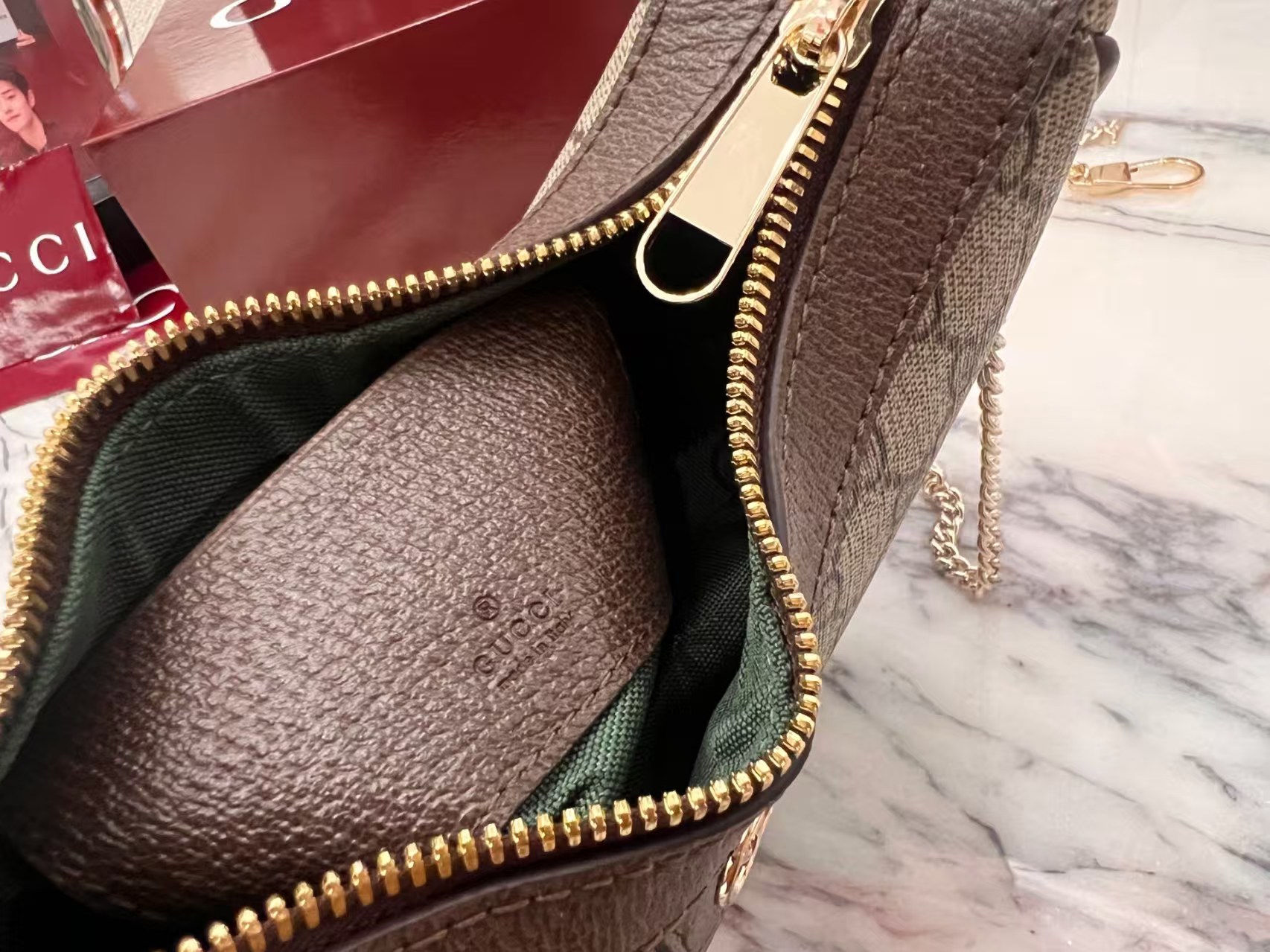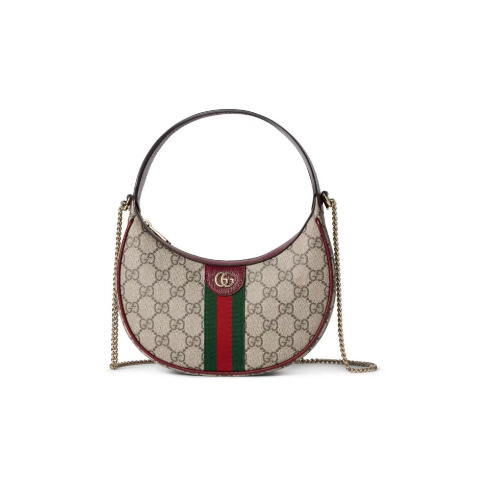 【介绍】 海外原单 Ophidia系列匠心演绎新颖廓形与功能,搭配标志性的米色和棕色配色,缔就质地柔软、风格时尚的包袋单品。这款新月造型肩背包配有一根雅致的链式包带。