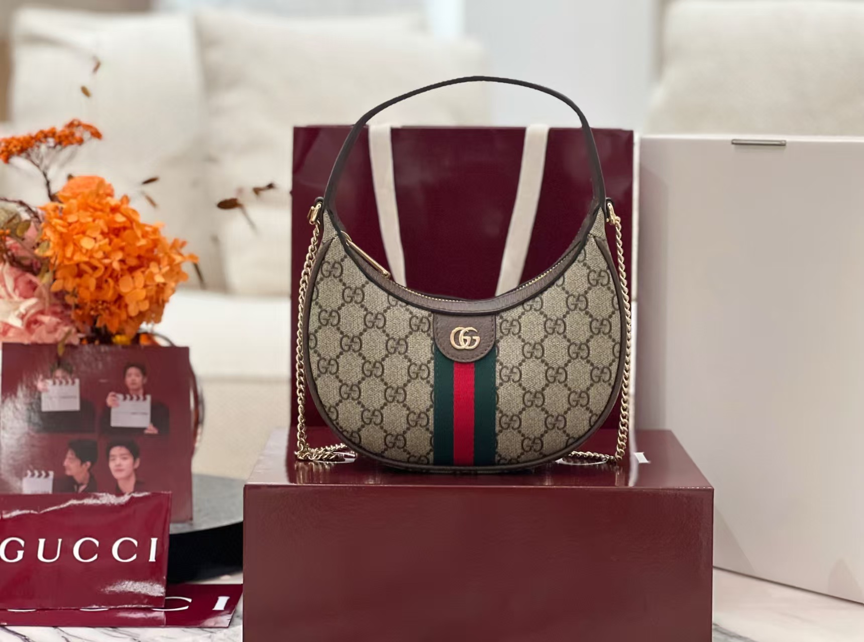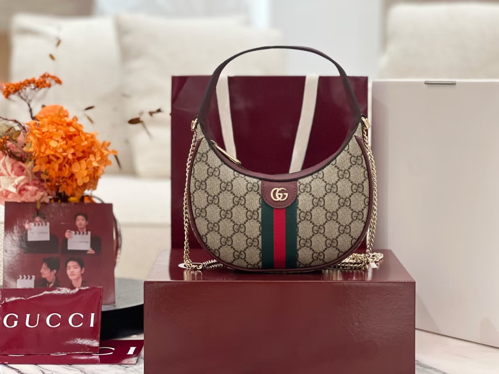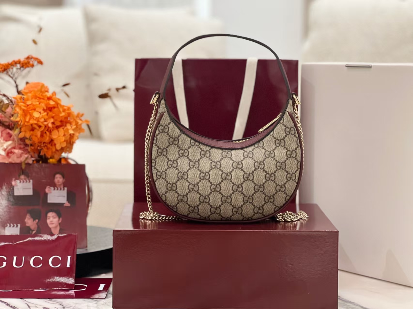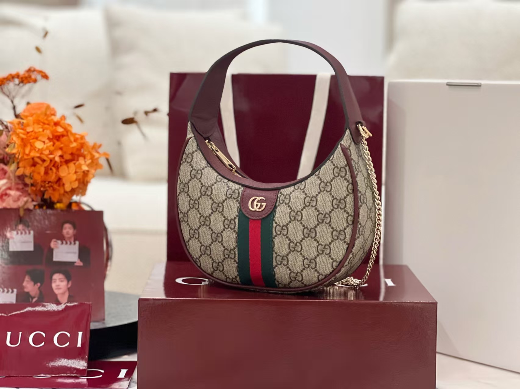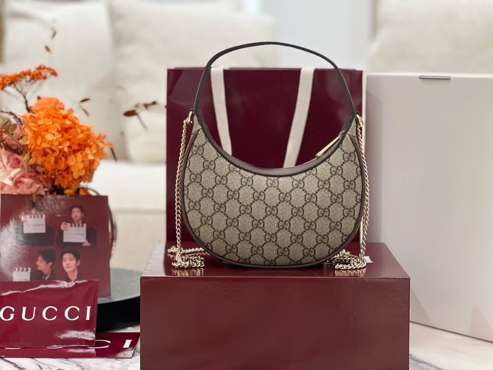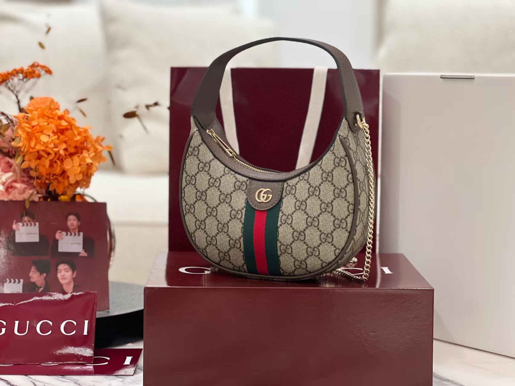【介绍】 海外原单 Ophidia系列匠心演绎新颖廓形与功能,搭配标志性的米色和棕色配色,缔就质地柔软、风格时尚的包袋单品。这款新月造型肩背包配有一根雅致的链式包带。