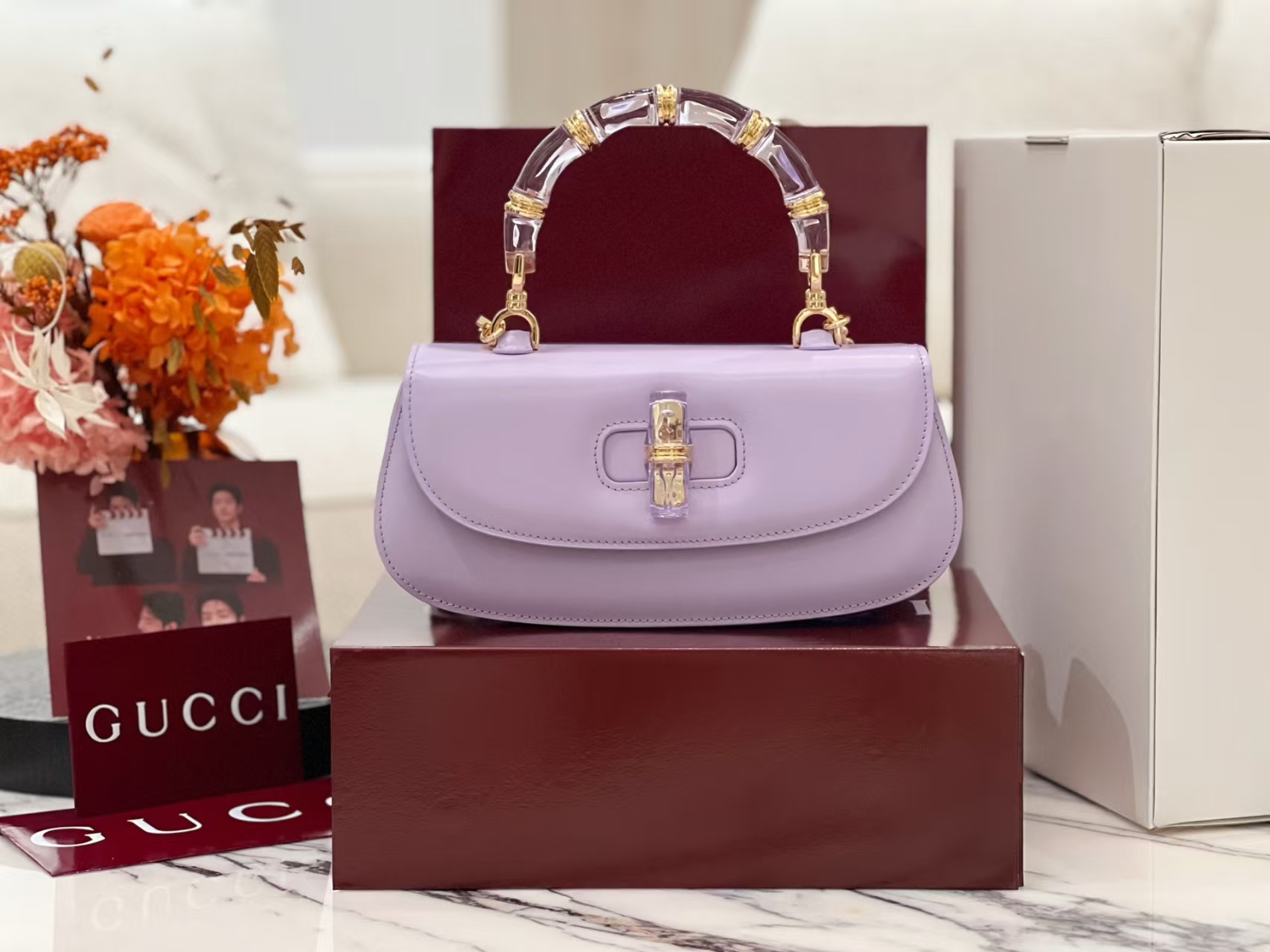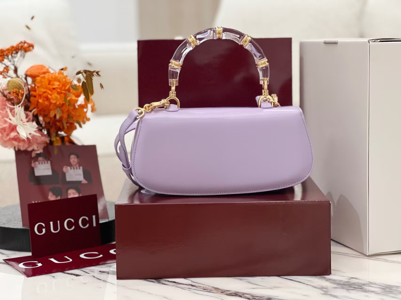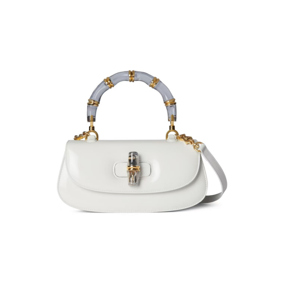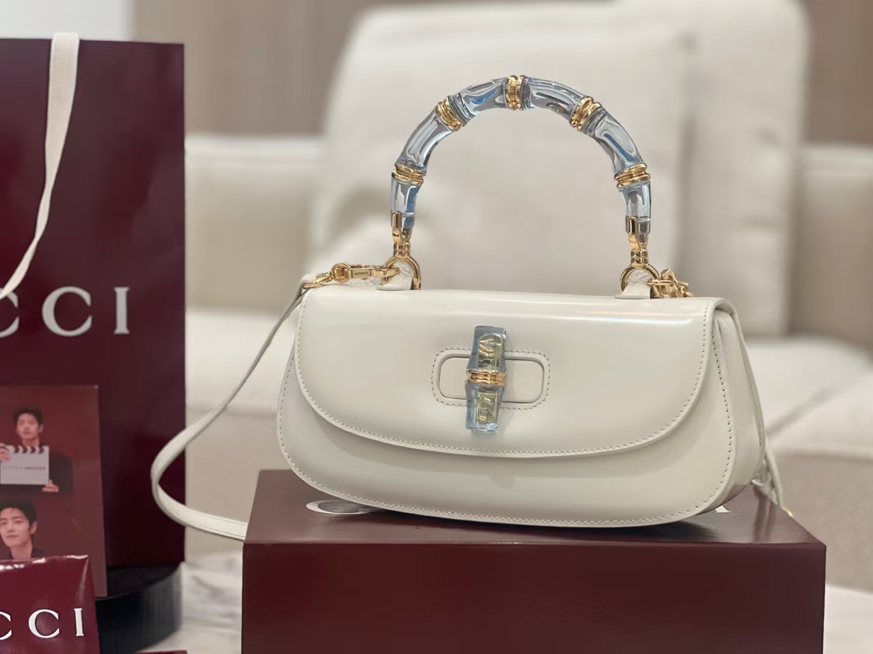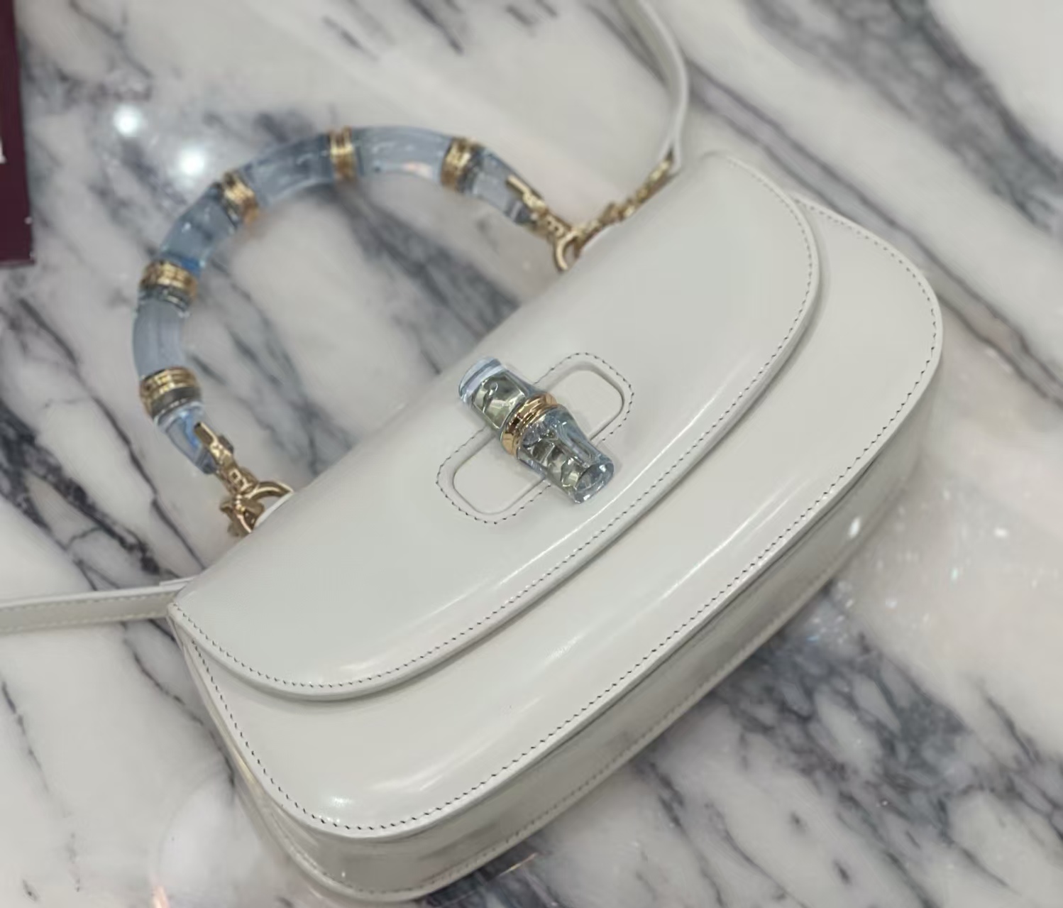 【介绍】 海外原单 这款小号手提包以树脂和黄铜细节焕新演绎标志性竹节造型配件,为2025春夏系列再添亮眼力作。Gucci Bamboo Diva手提包能为各种造型增添一抹亮色。