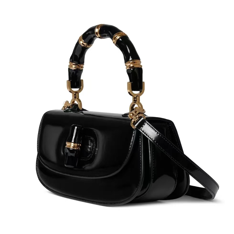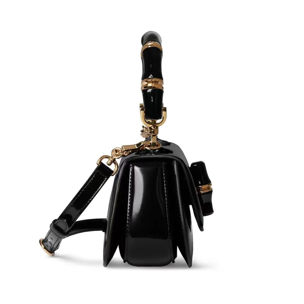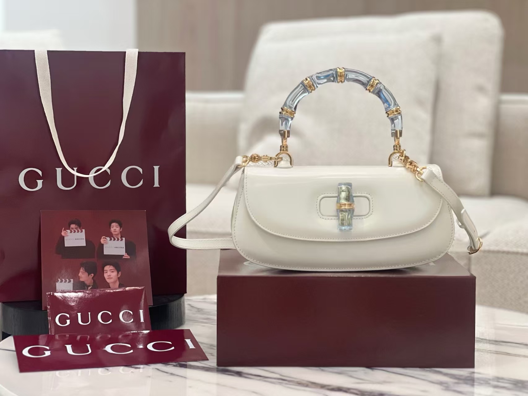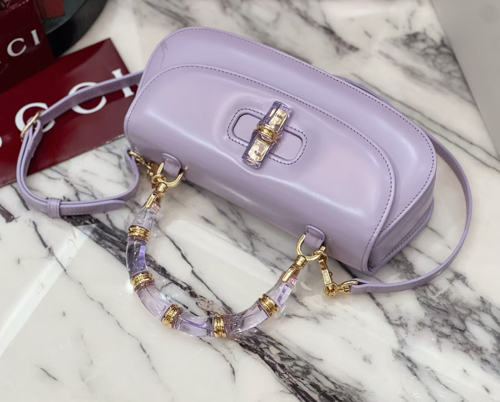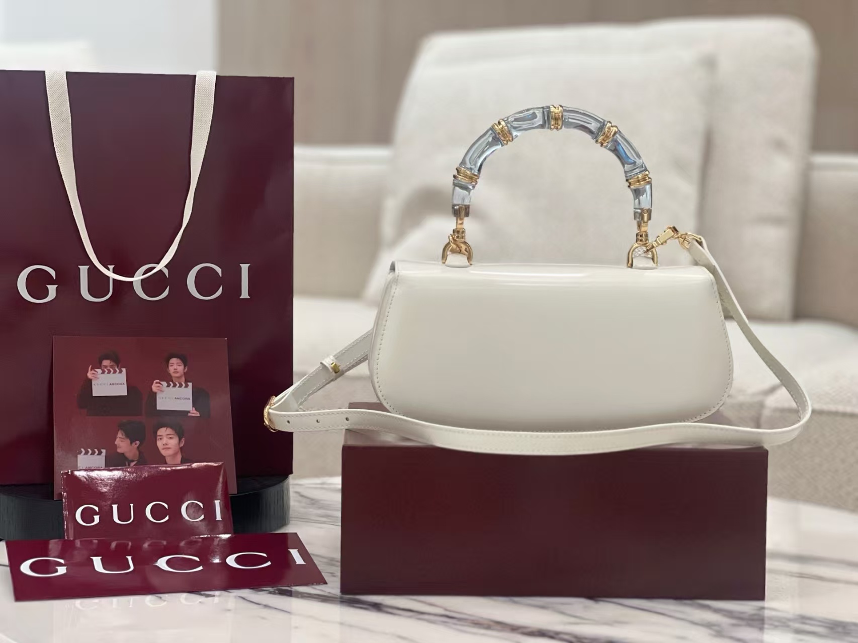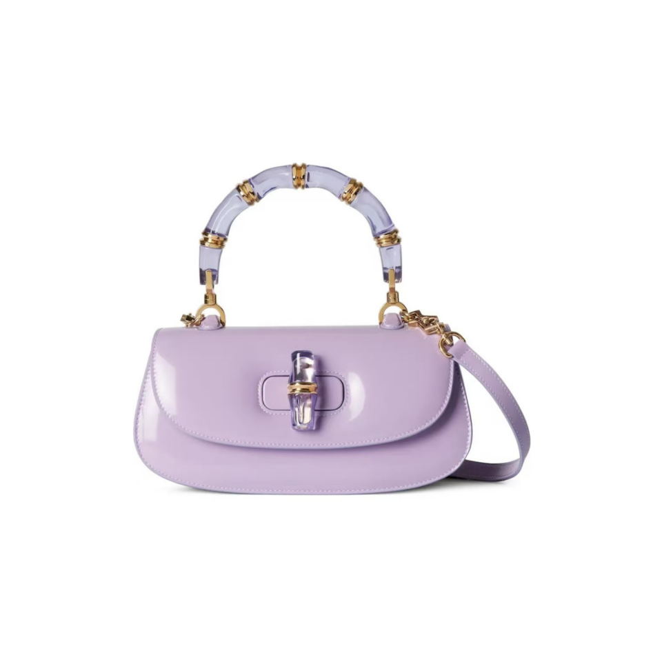 【介绍】 海外原单 这款小号手提包以树脂和黄铜细节焕新演绎标志性竹节造型配件,为2025春夏系列再添亮眼力作。Gucci Bamboo Diva手提包能为各种造型增添一抹亮色。