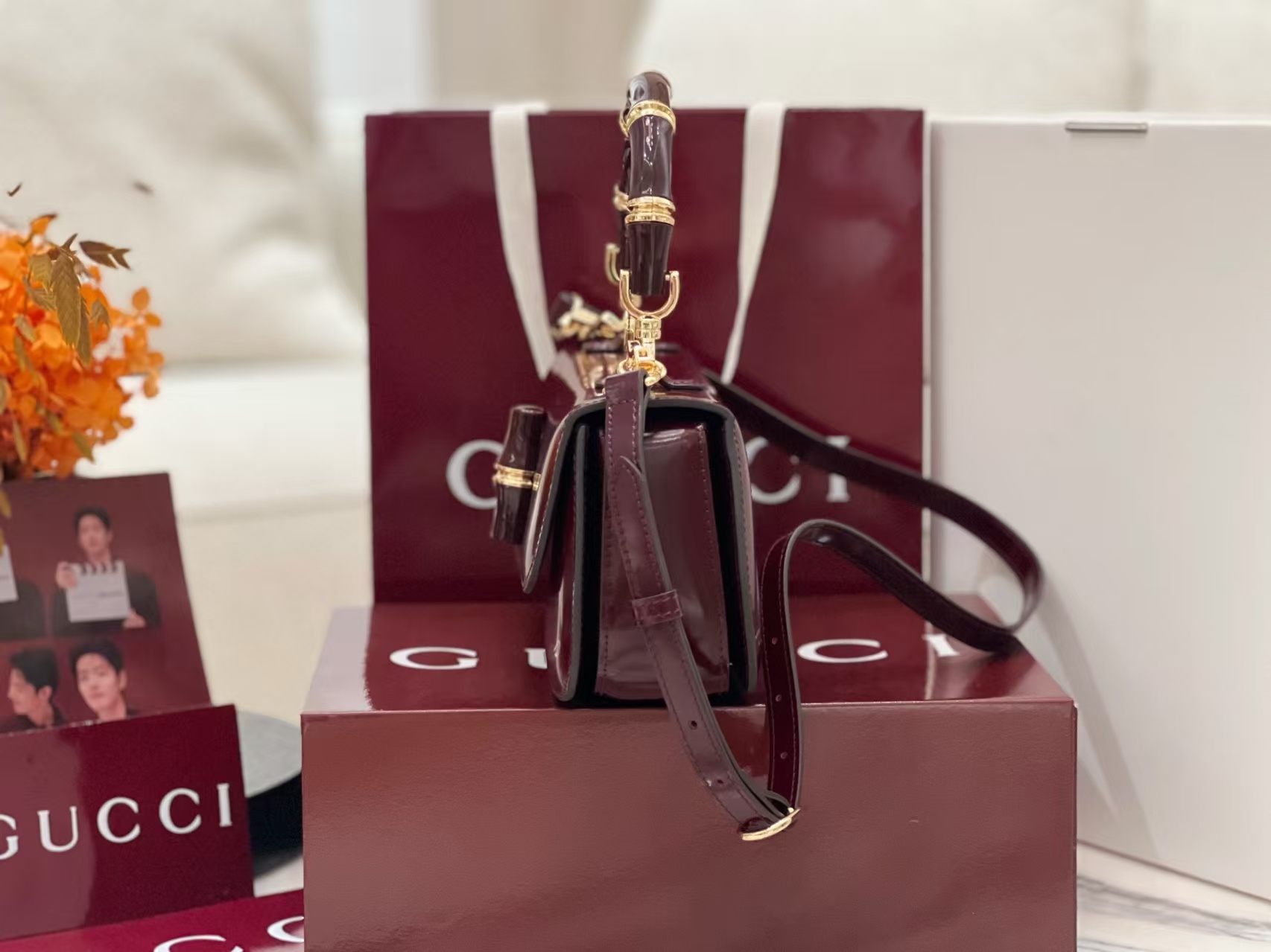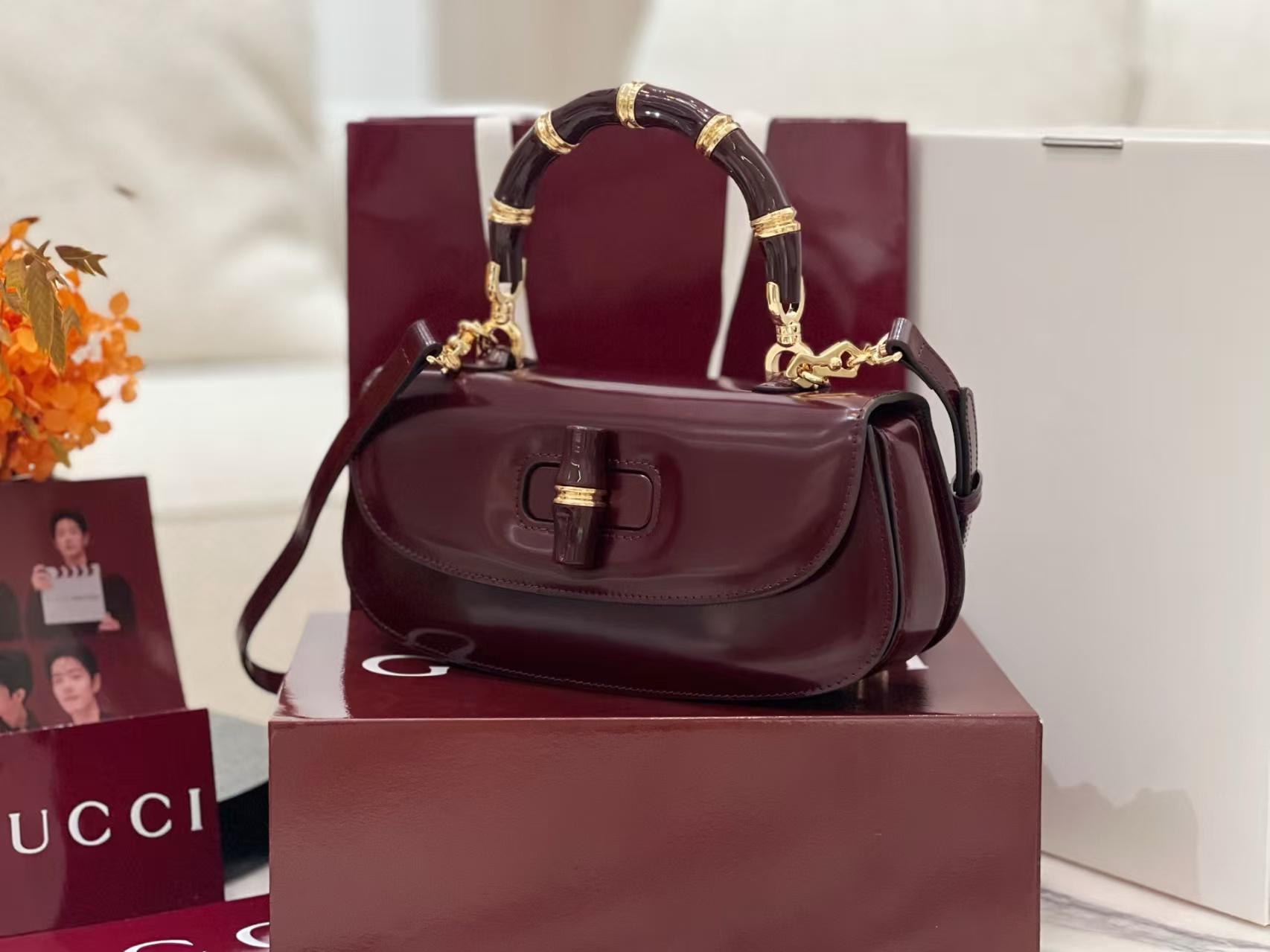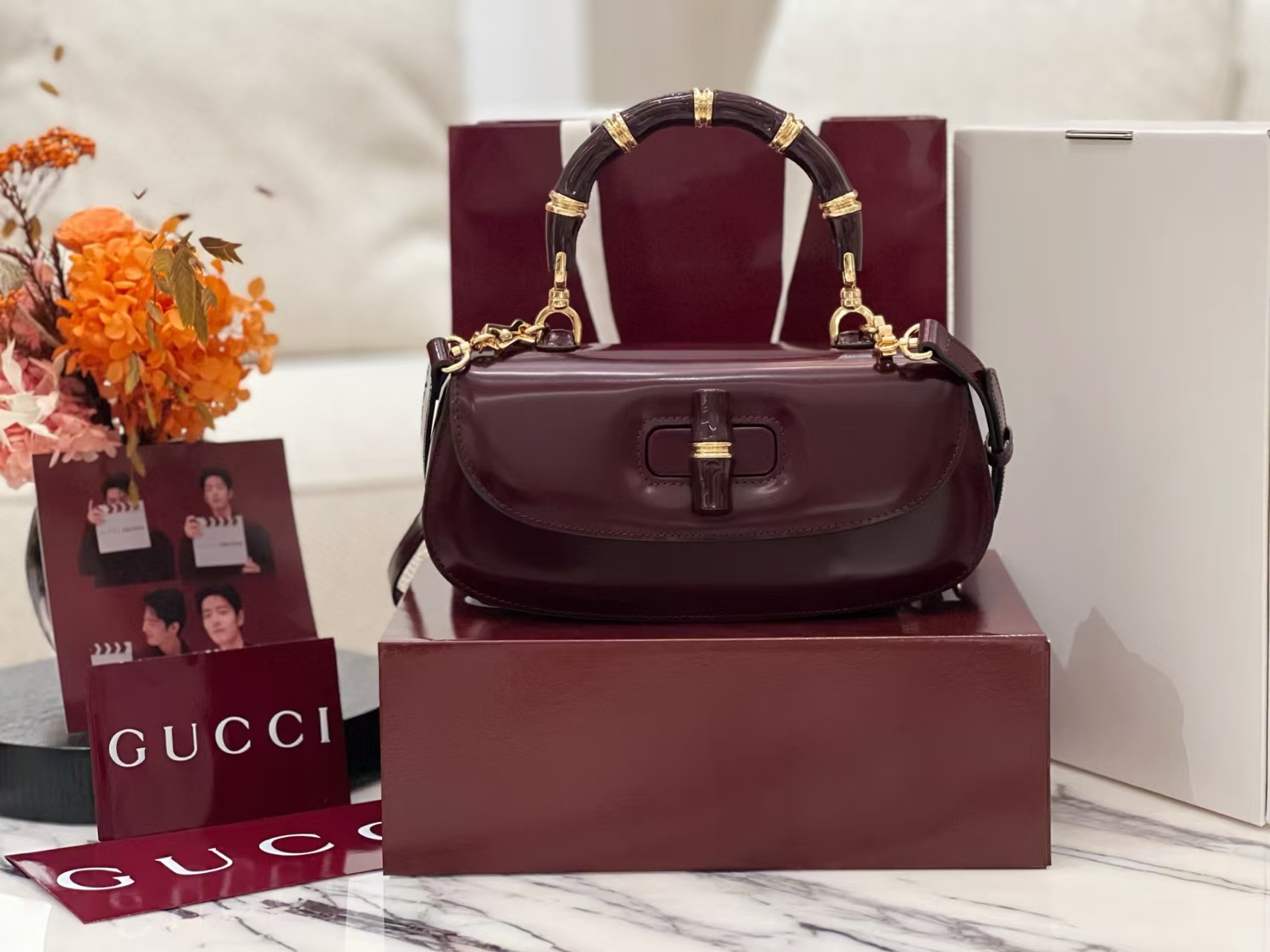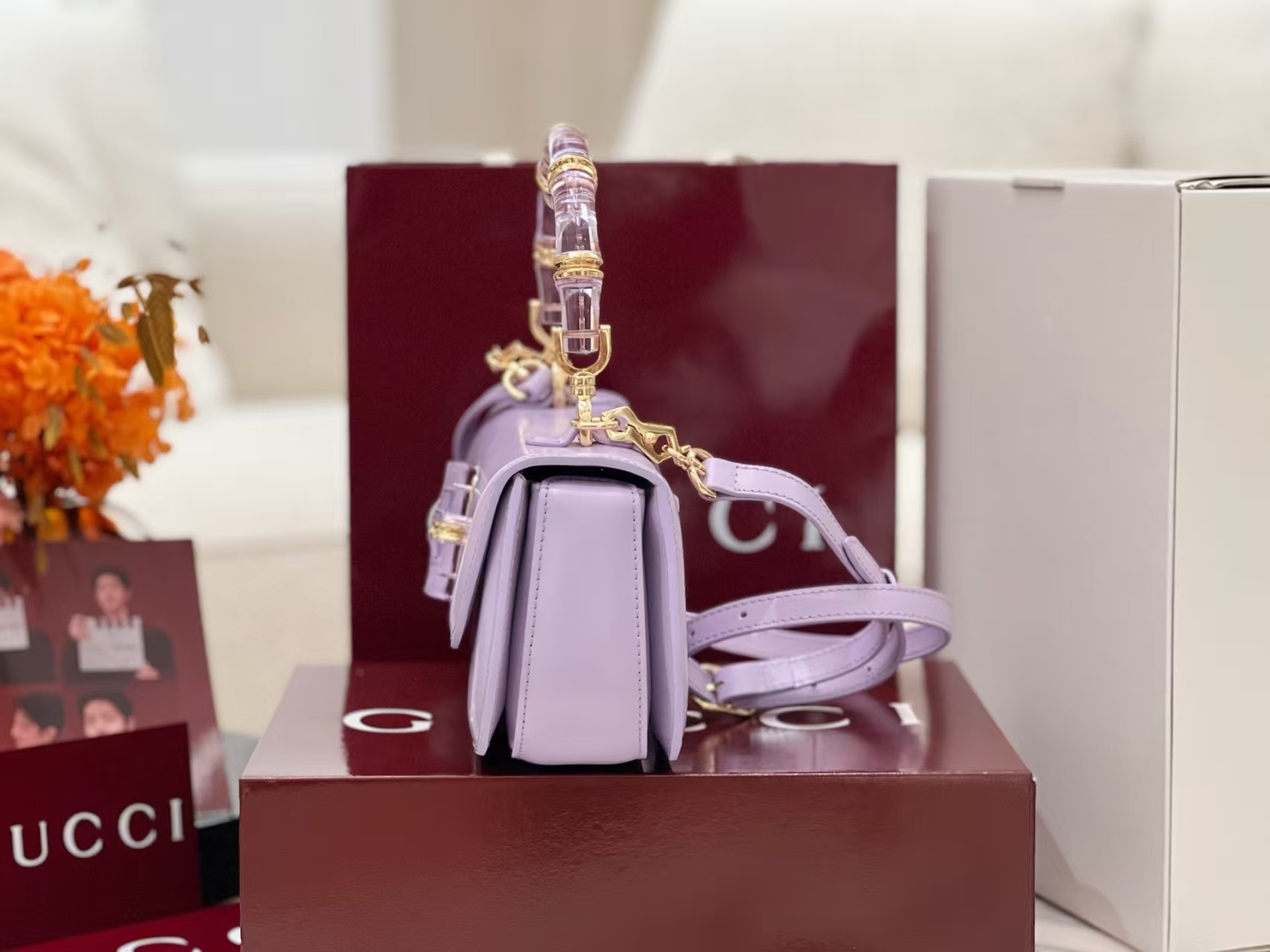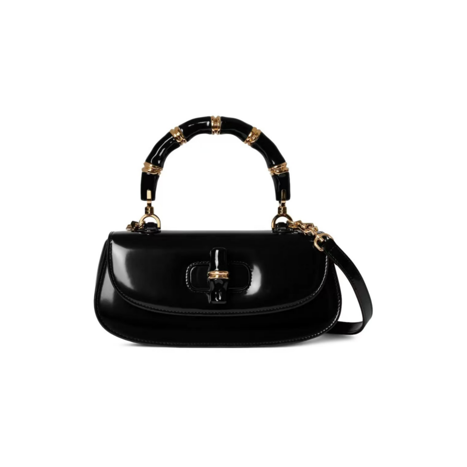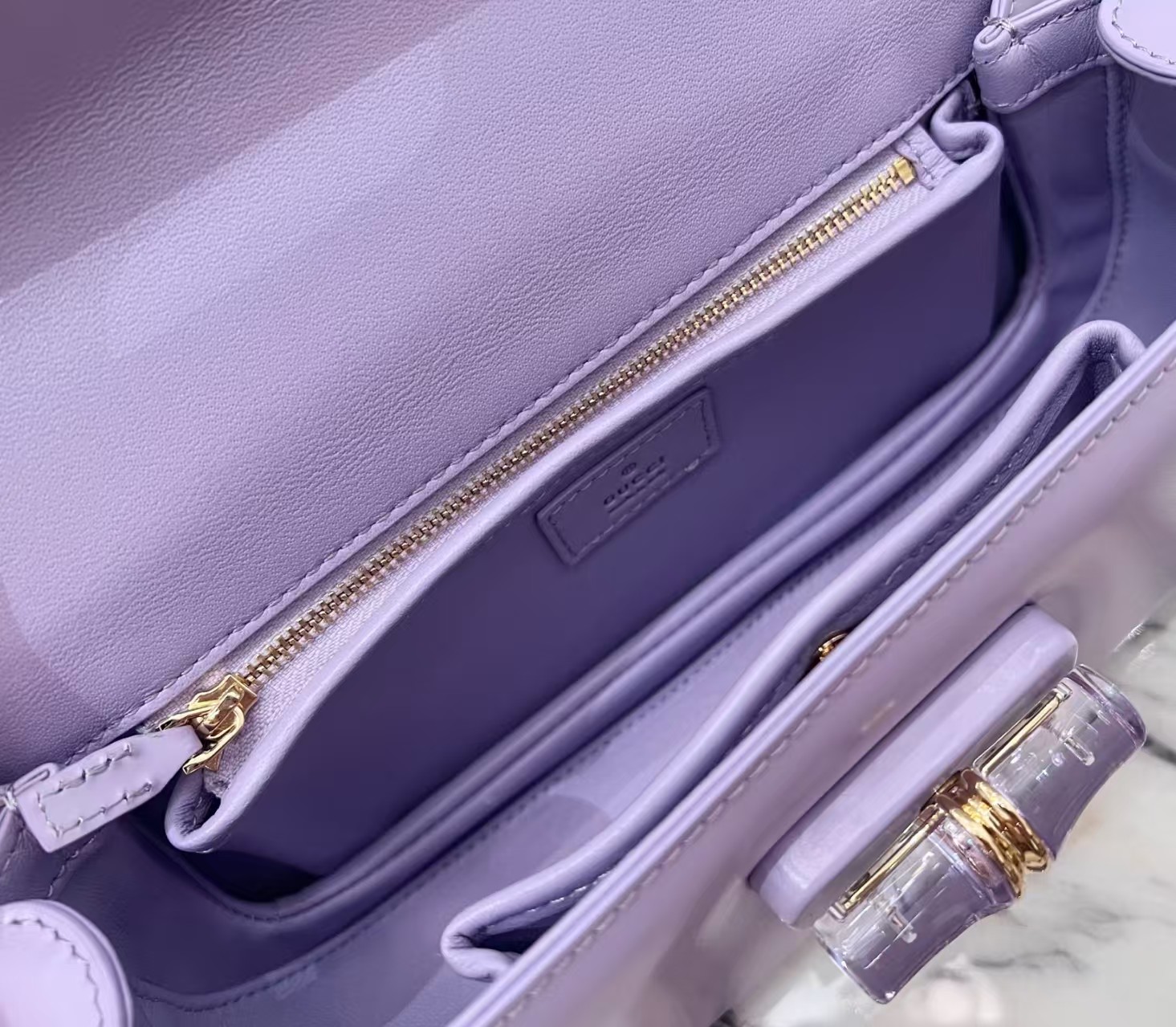 【介绍】 海外原单 这款小号手提包以树脂和黄铜细节焕新演绎标志性竹节造型配件,为2025春夏系列再添亮眼力作。Gucci Bamboo Diva手提包能为各种造型增添一抹亮色。
