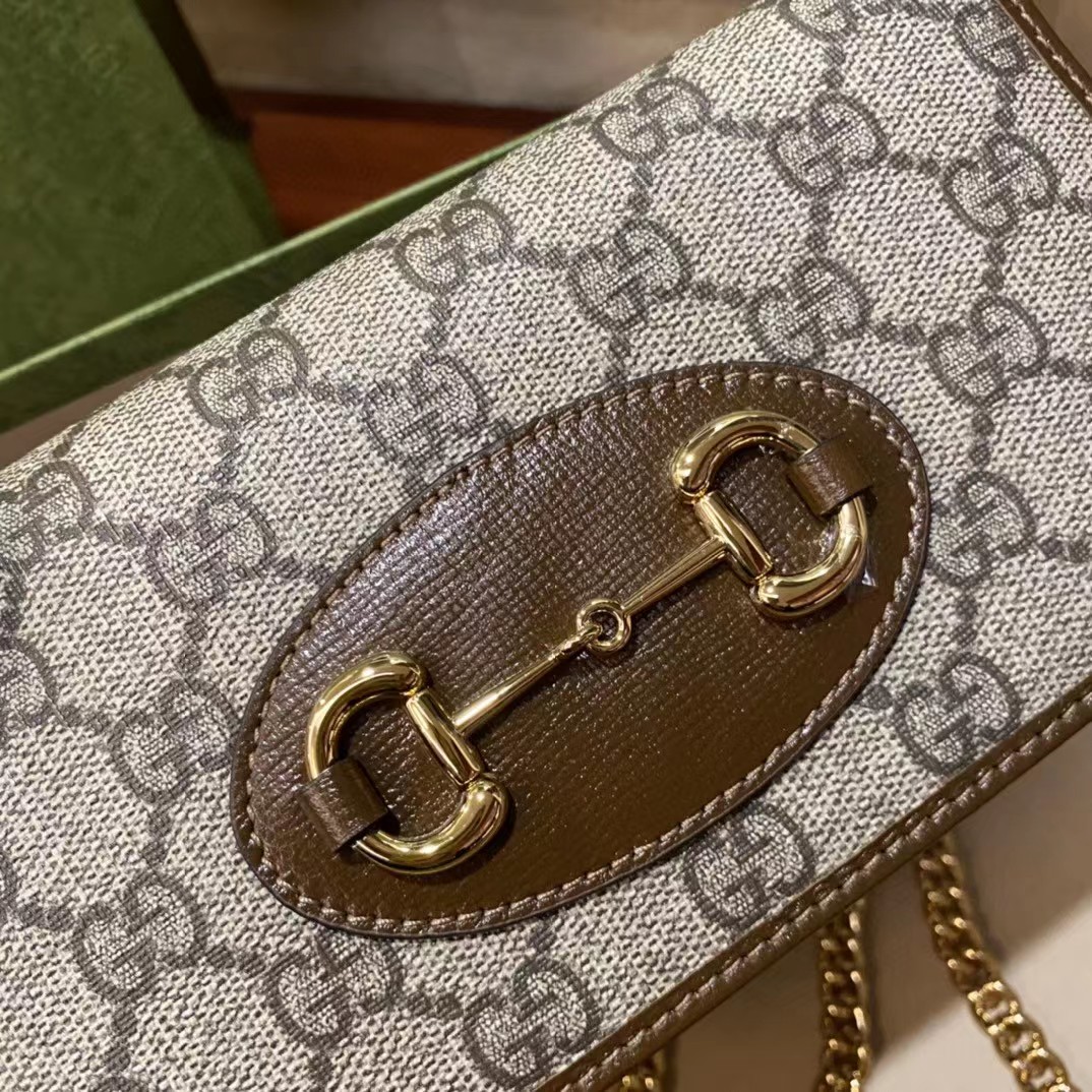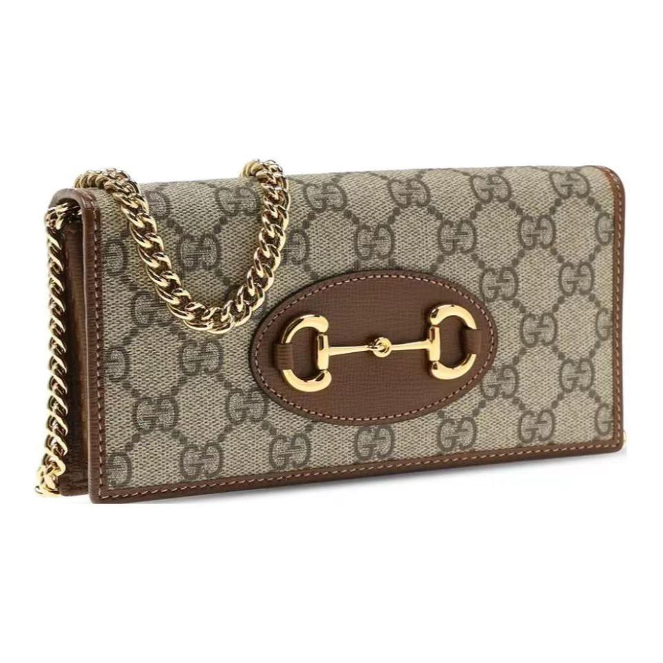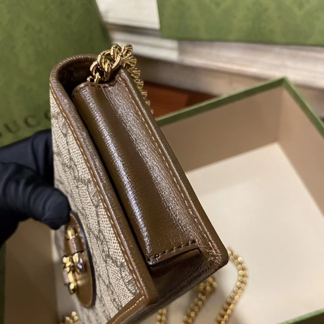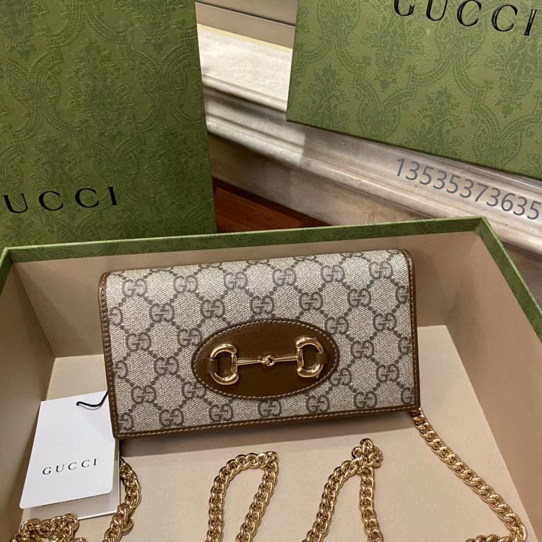 Gucci 古驰 原厂皮!1955马衔扣系列,链条包。采用GG Supreme高级人造革,配以云纹织物和麂皮衬里,海外五金,精制而成!尺寸: 长19~高10~宽4cm。 款号:621892 颜色:pVC啡色配棕色皮