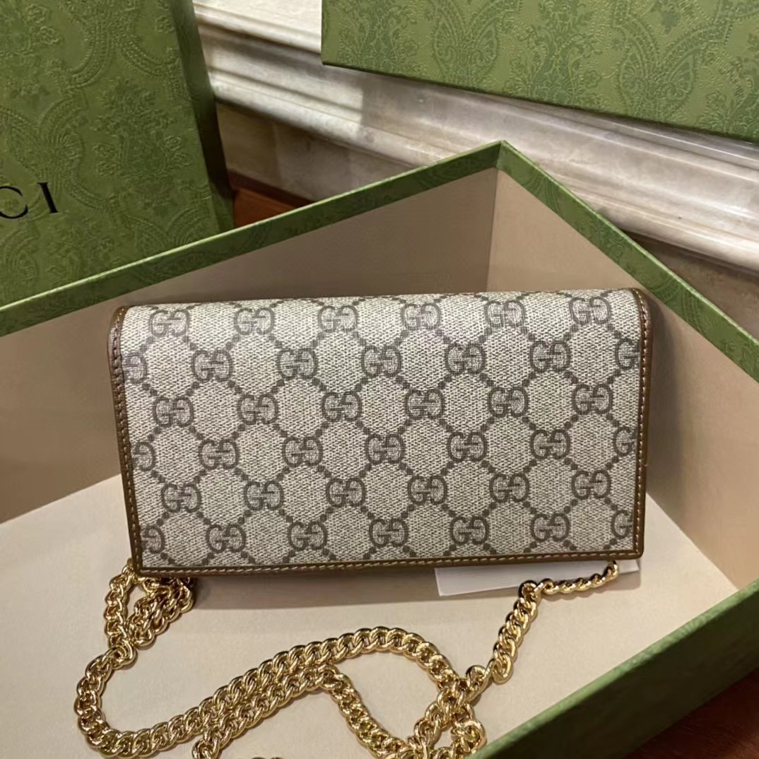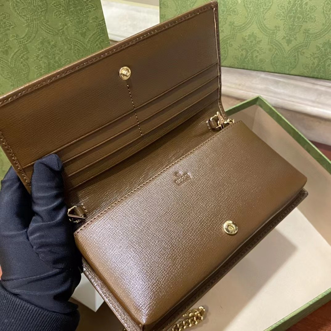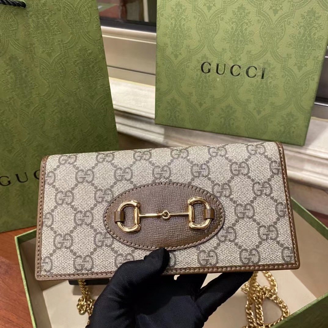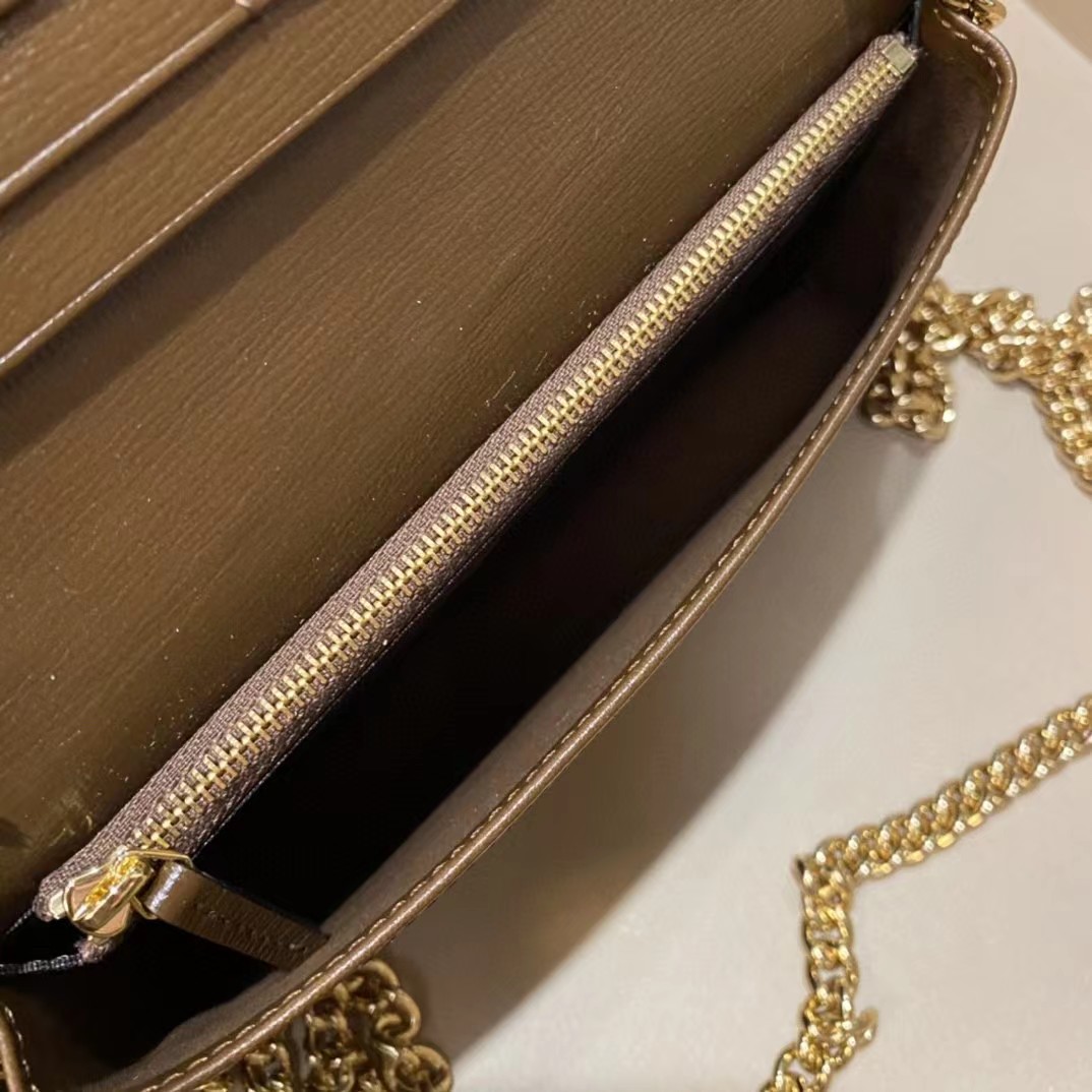 Gucci 古驰 原厂皮!1955马衔扣系列,链条包。采用GG Supreme高级人造革,配以云纹织物和麂皮衬里,海外五金,精制而成!尺寸: 长19~高10~宽4cm。 款号:621892 颜色:pVC啡色配棕色皮