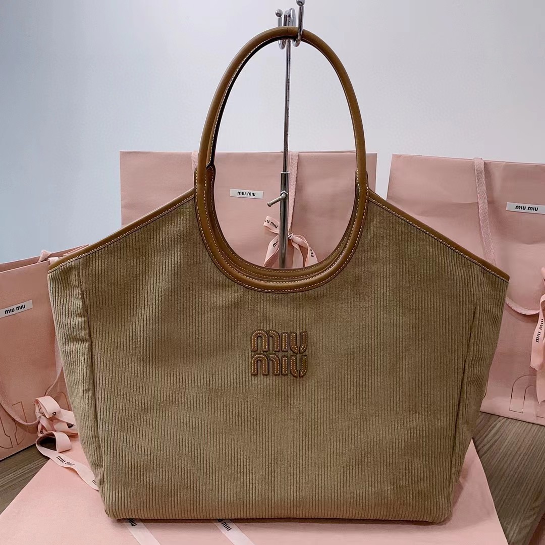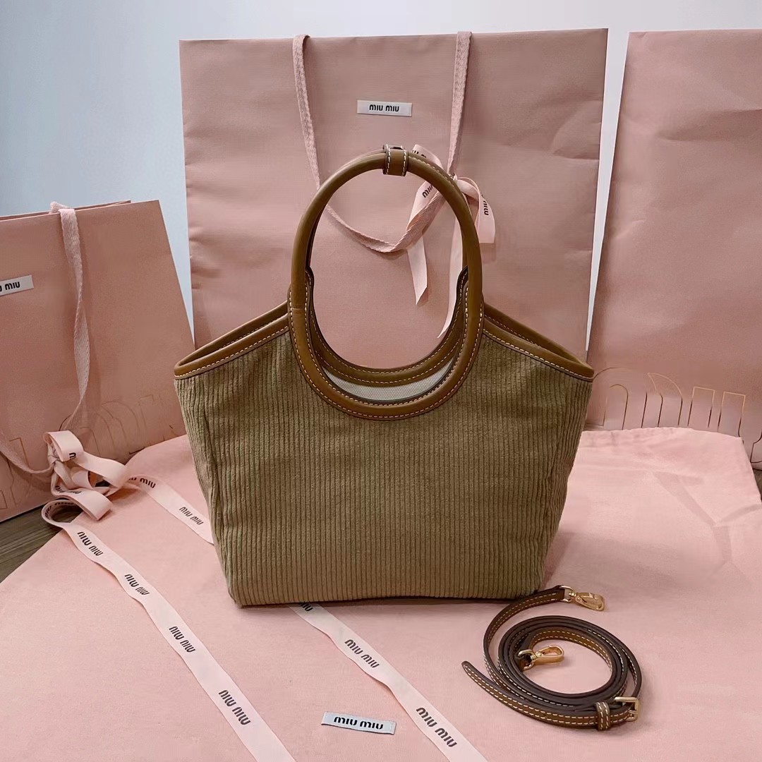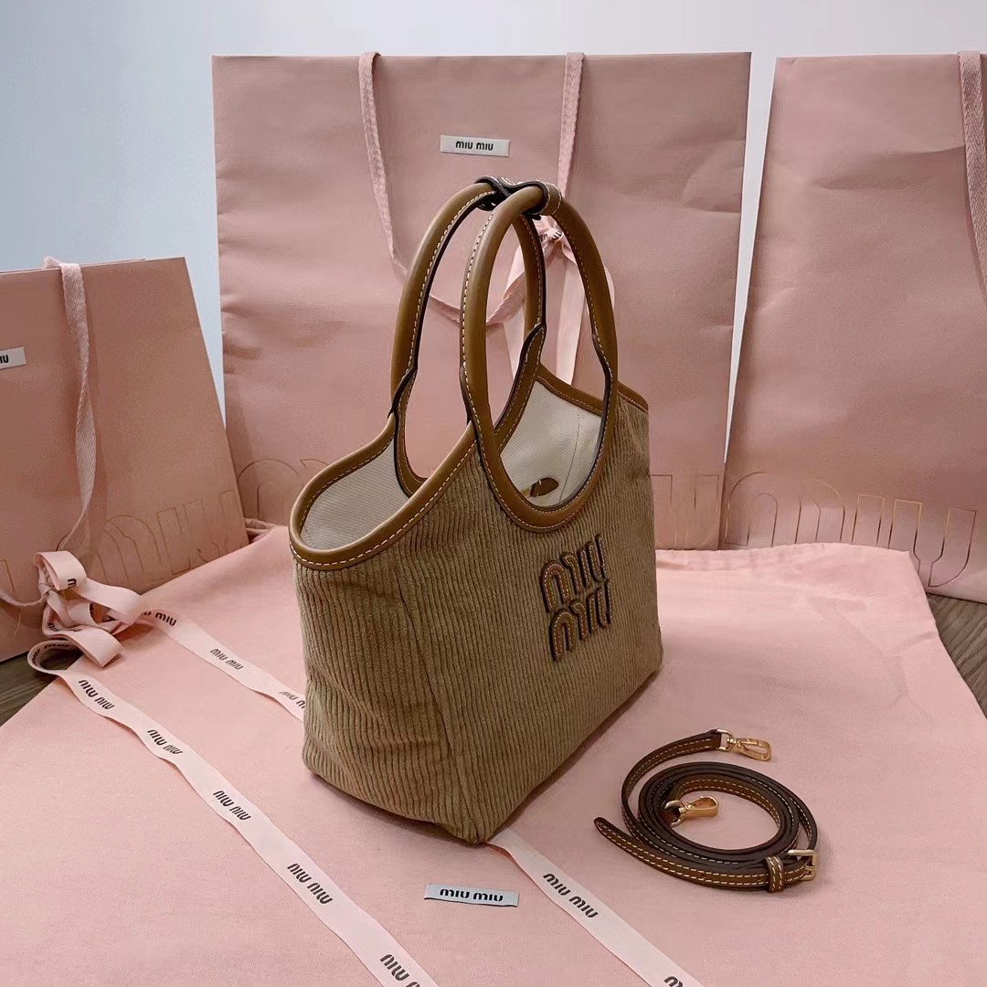 【MiuMiu缪缪】新款伊势丹限定托特包,今年绝对爆款式,全新限定版灯芯绒面料,搭配上乘的皮革质感高级,包身软而不塌,小尺寸设计更加精致,气质随性慵懒,日常出街背它回头率百分百,手工缝制皮面Logo标志,内里全新麻布里,配两个拉链式口袋,可调节皮革长肩带!