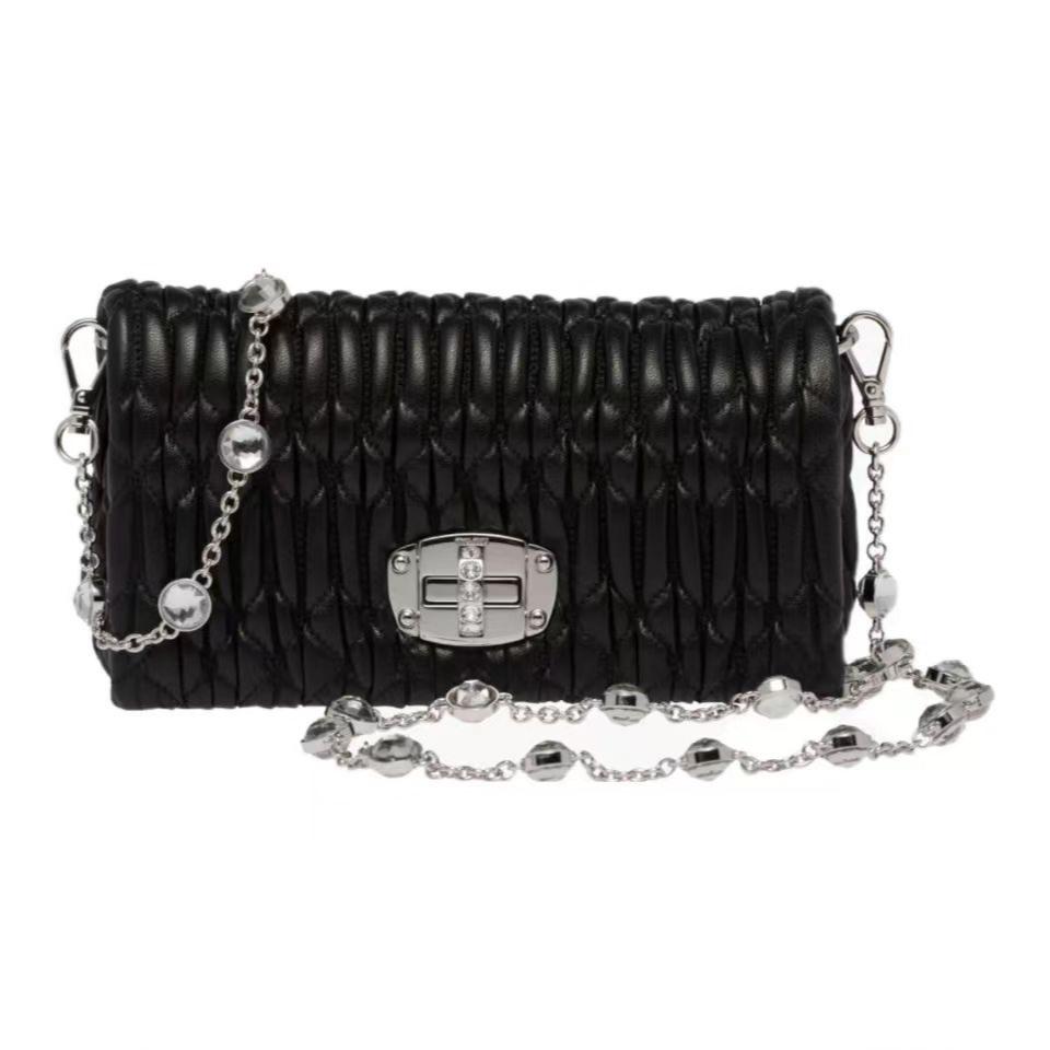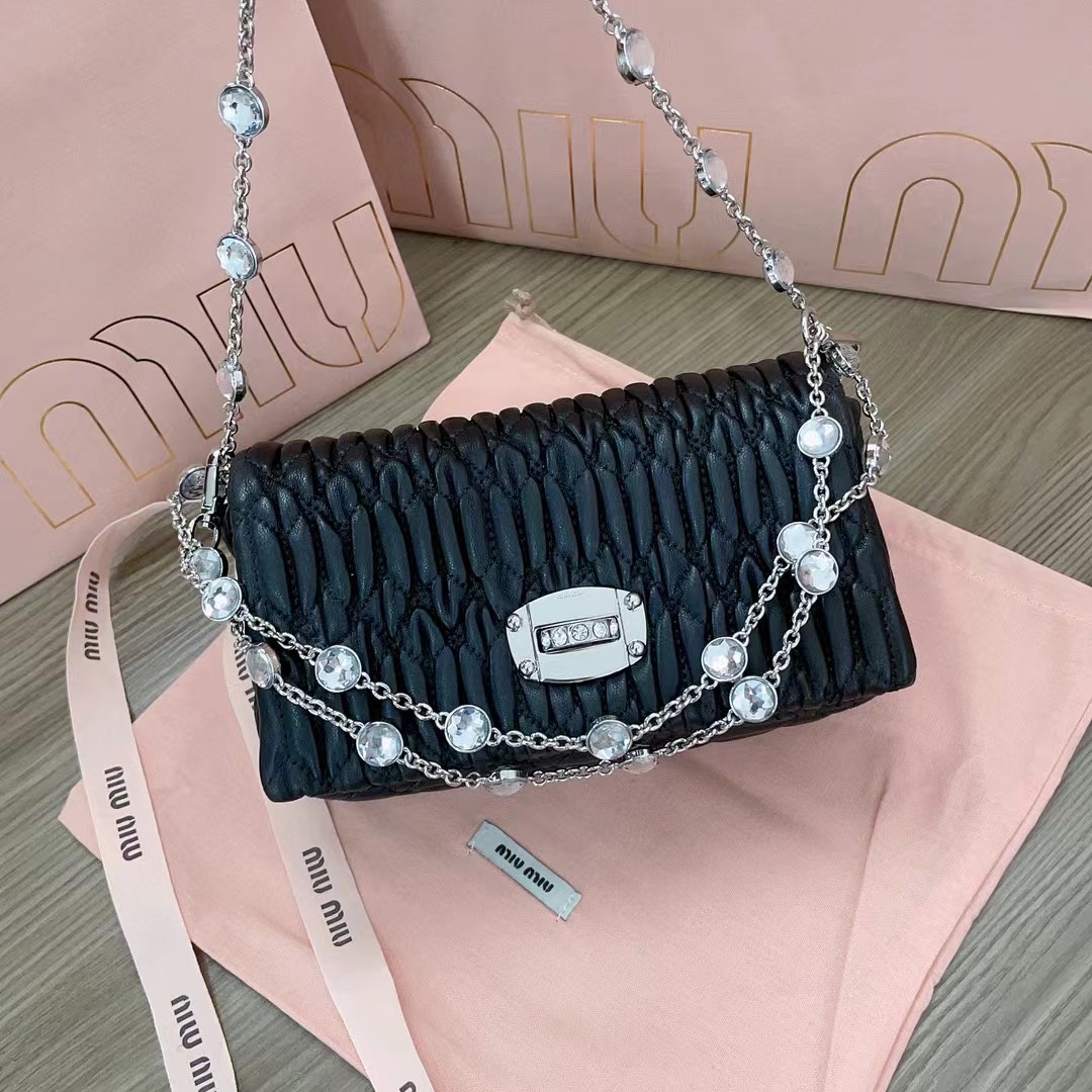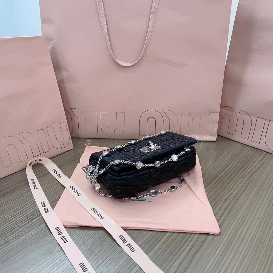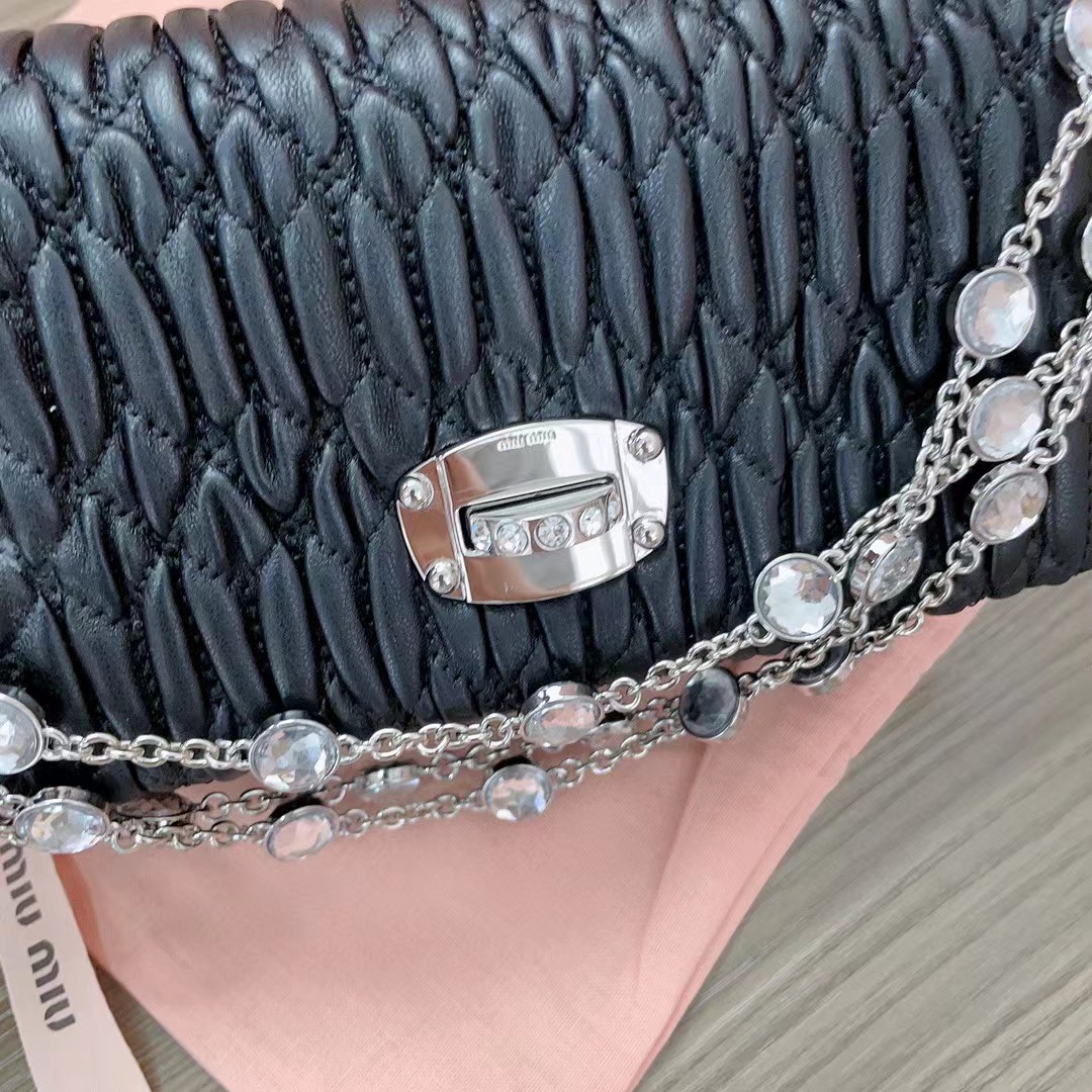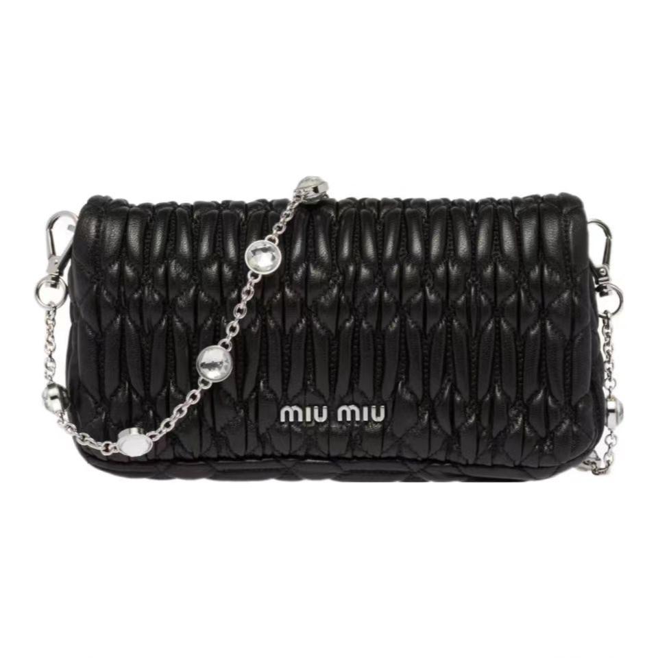 【MiuMiu缪缪】新品水晶链条包,小提花皱褶凸纹压花做法,Cloquet进口小羊皮,抛光纲质五金,全新旋转锁扣开合,棉缎衬里,双肩带设计,炫目水晶长肩带,可手拿肩背斜挎,造型百搭时尚!