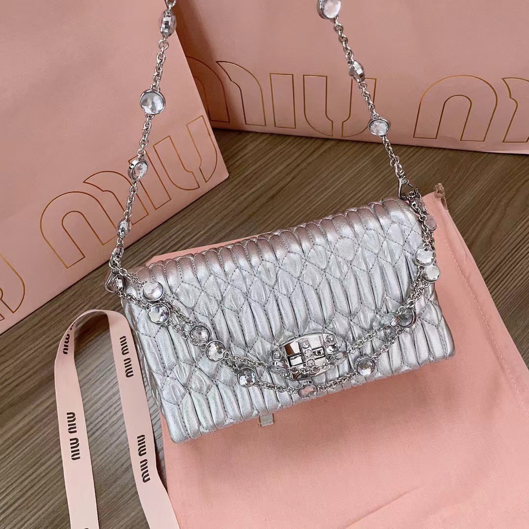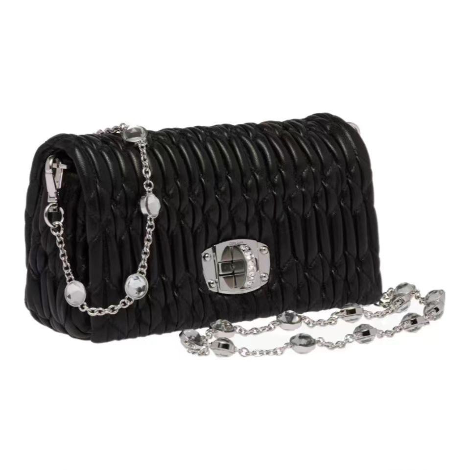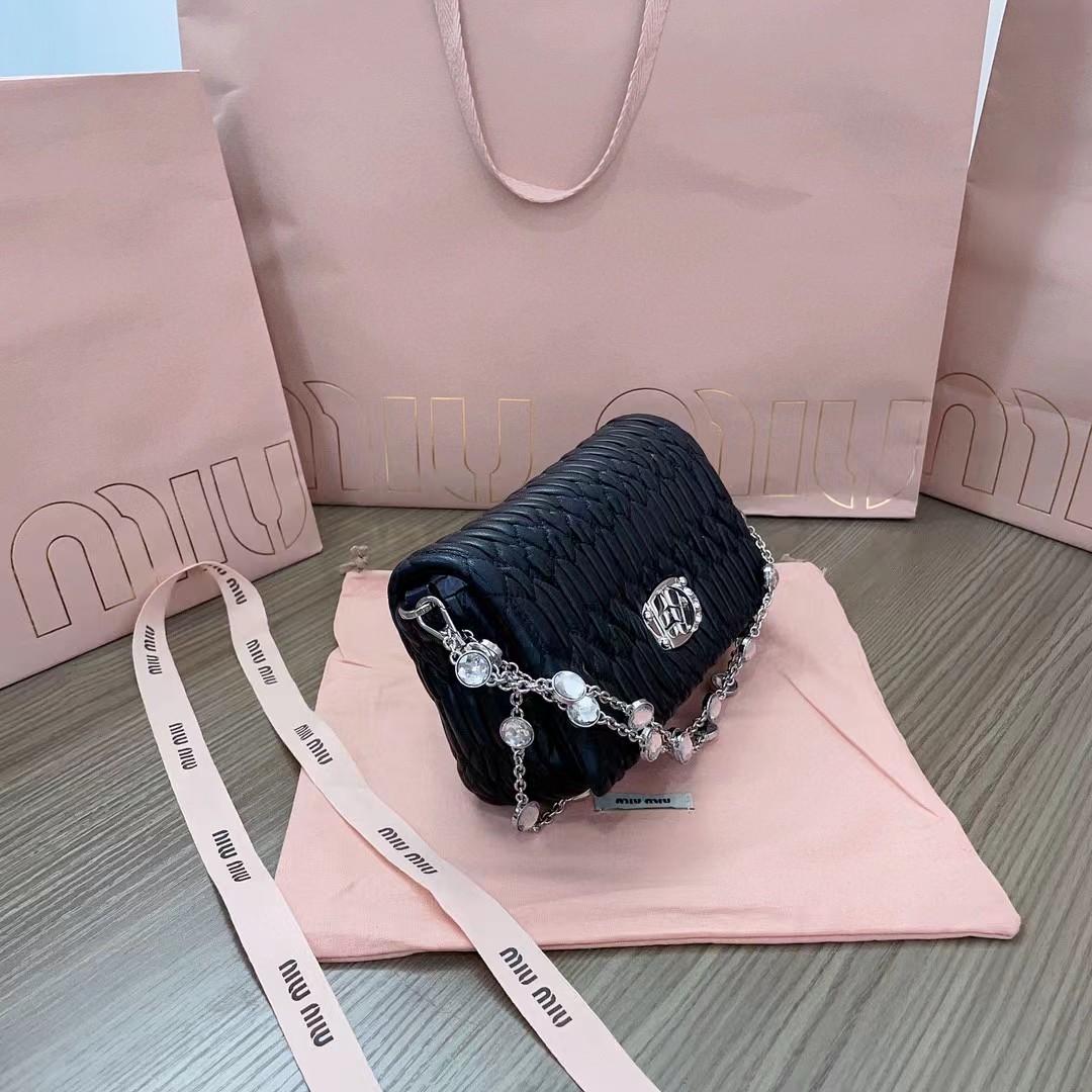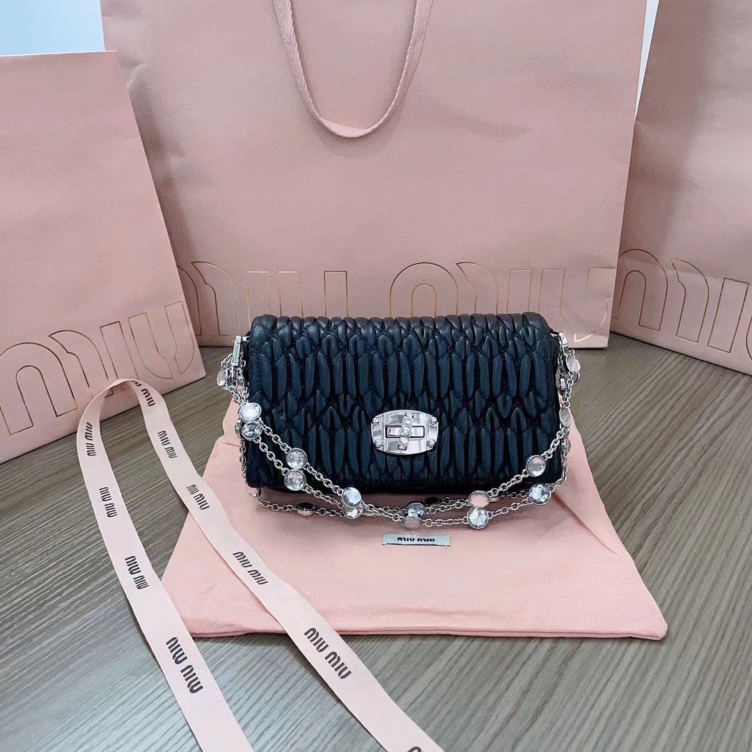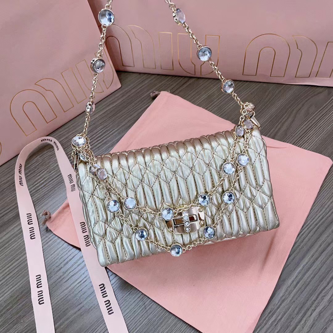 【MiuMiu缪缪】新品水晶链条包,小提花皱褶凸纹压花做法,Cloquet进口小羊皮,抛光纲质五金,全新旋转锁扣开合,棉缎衬里,双肩带设计,炫目水晶长肩带,可手拿肩背斜挎,造型百搭时尚!