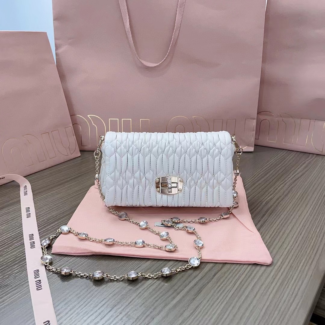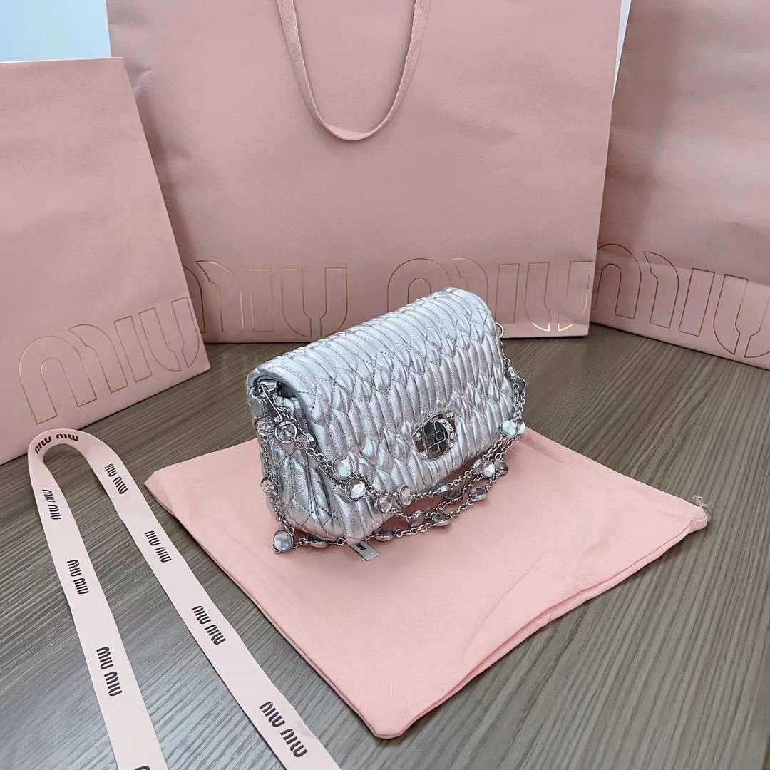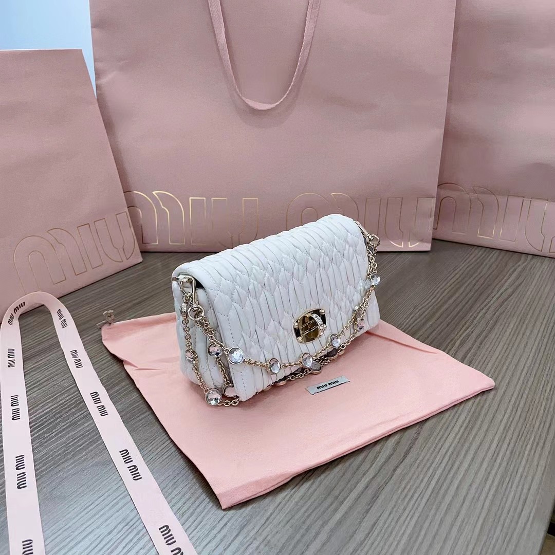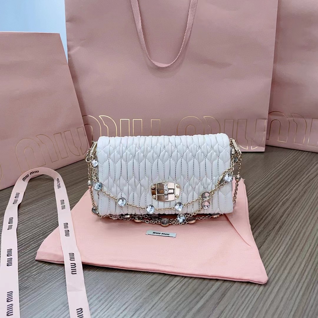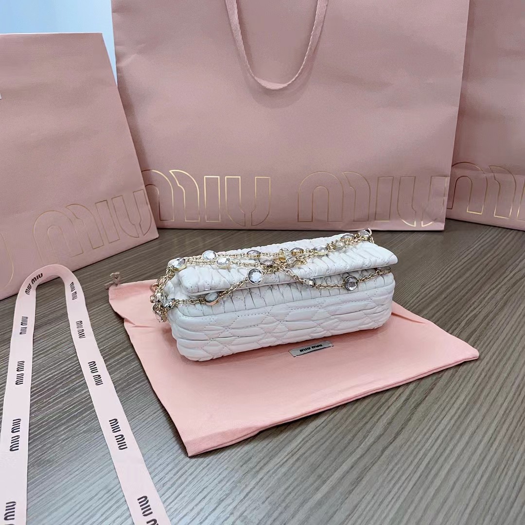 【MiuMiu缪缪】新品水晶链条包,小提花皱褶凸纹压花做法,Cloquet进口小羊皮,抛光纲质五金,全新旋转锁扣开合,棉缎衬里,双肩带设计,炫目水晶长肩带,可手拿肩背斜挎,造型百搭时尚!