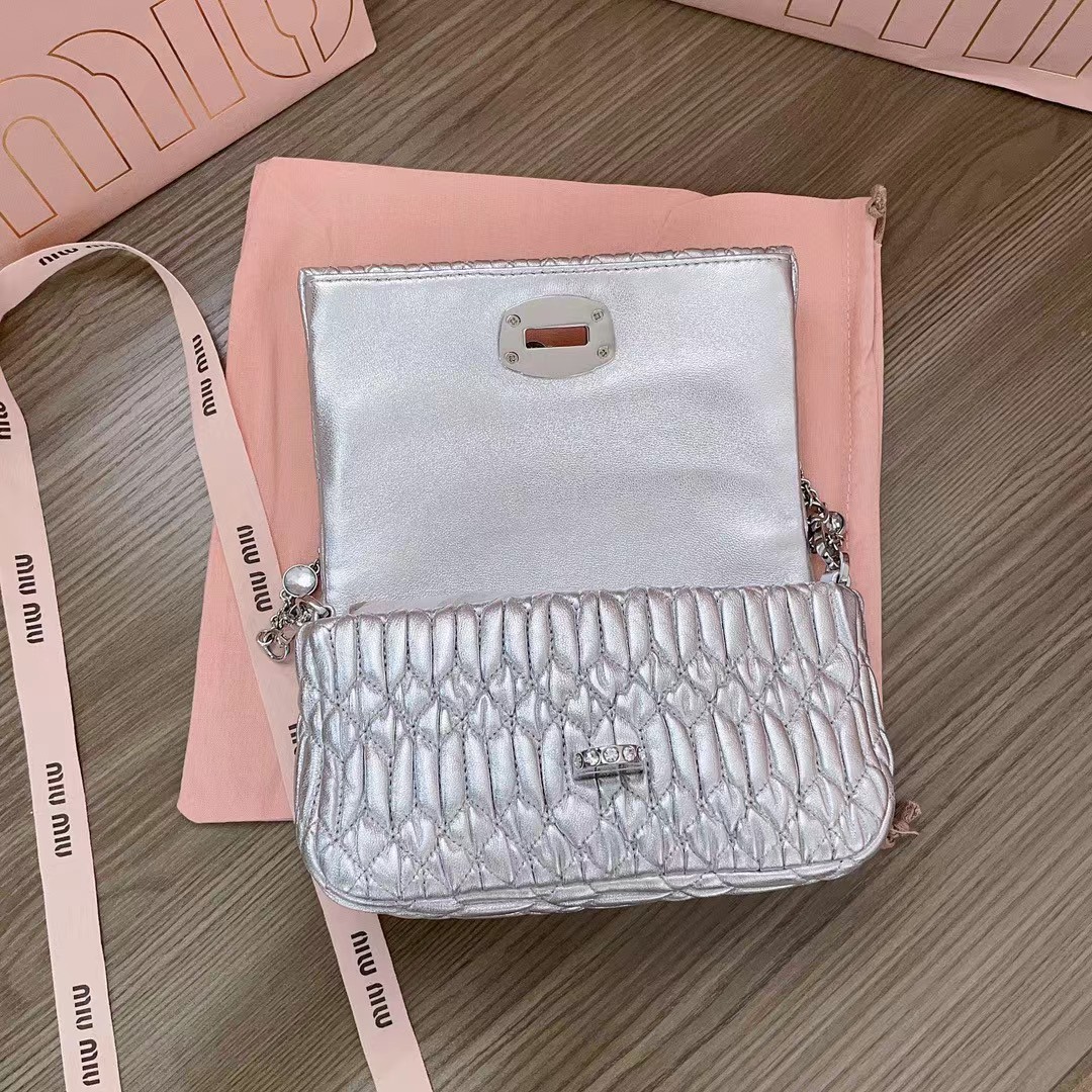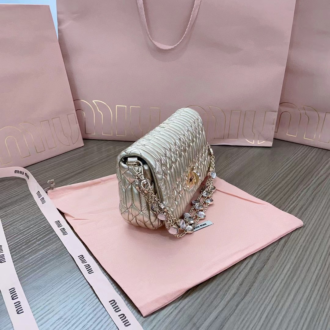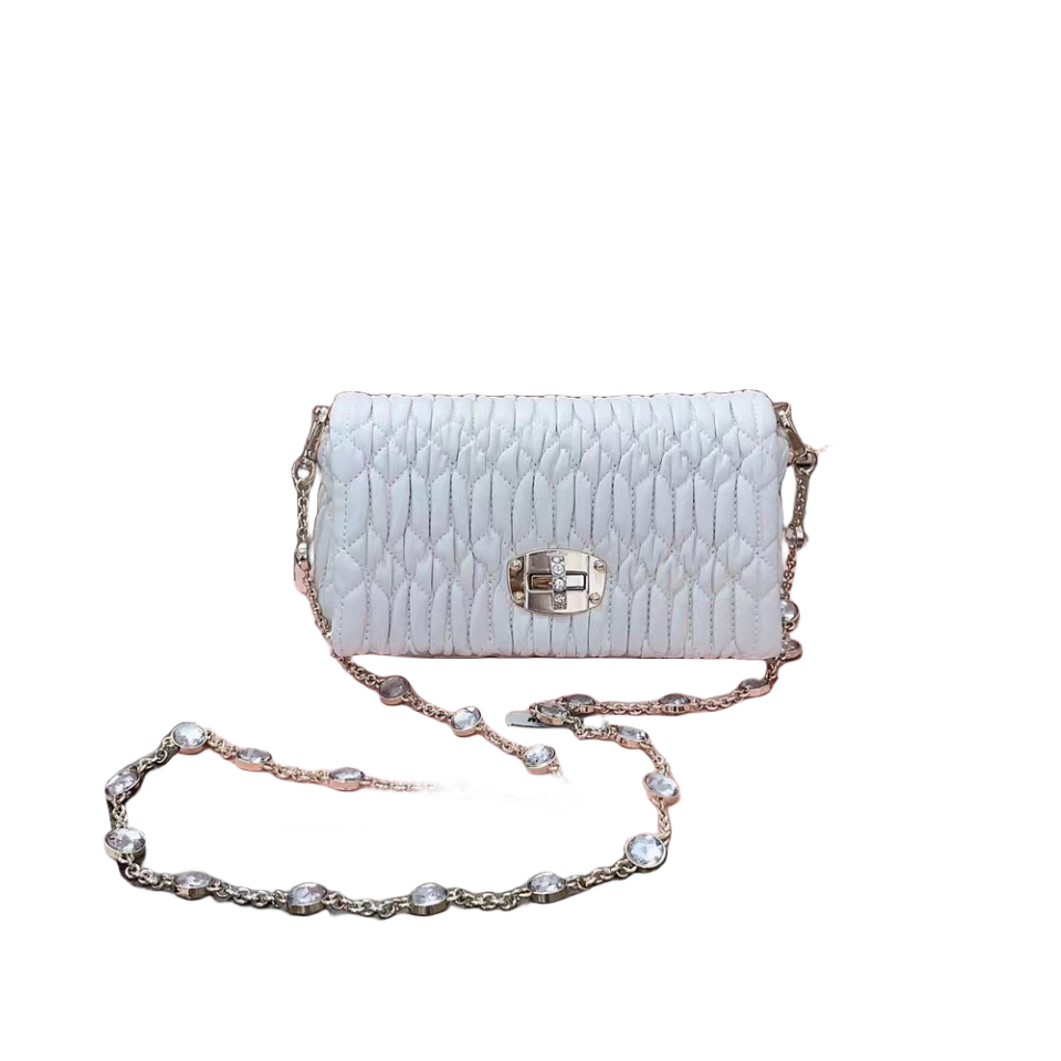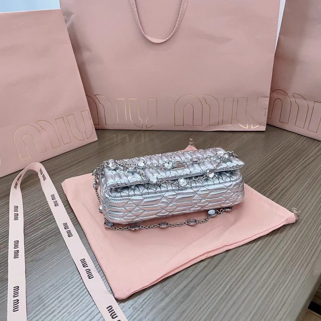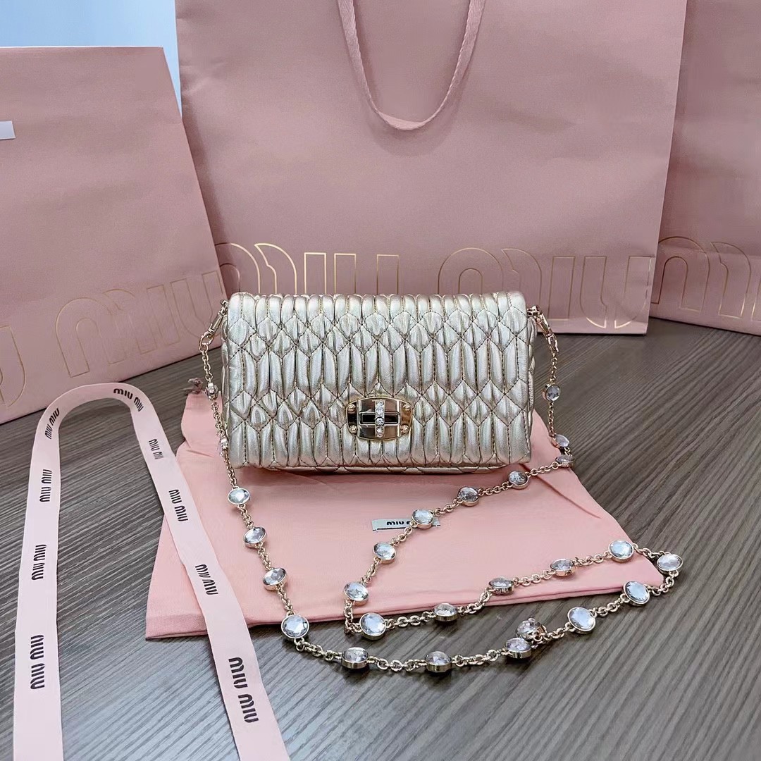 【MiuMiu缪缪】新品水晶链条包,小提花皱褶凸纹压花做法,Cloquet进口小羊皮,抛光纲质五金,全新旋转锁扣开合,棉缎衬里,双肩带设计,炫目水晶长肩带,可手拿肩背斜挎,造型百搭时尚!