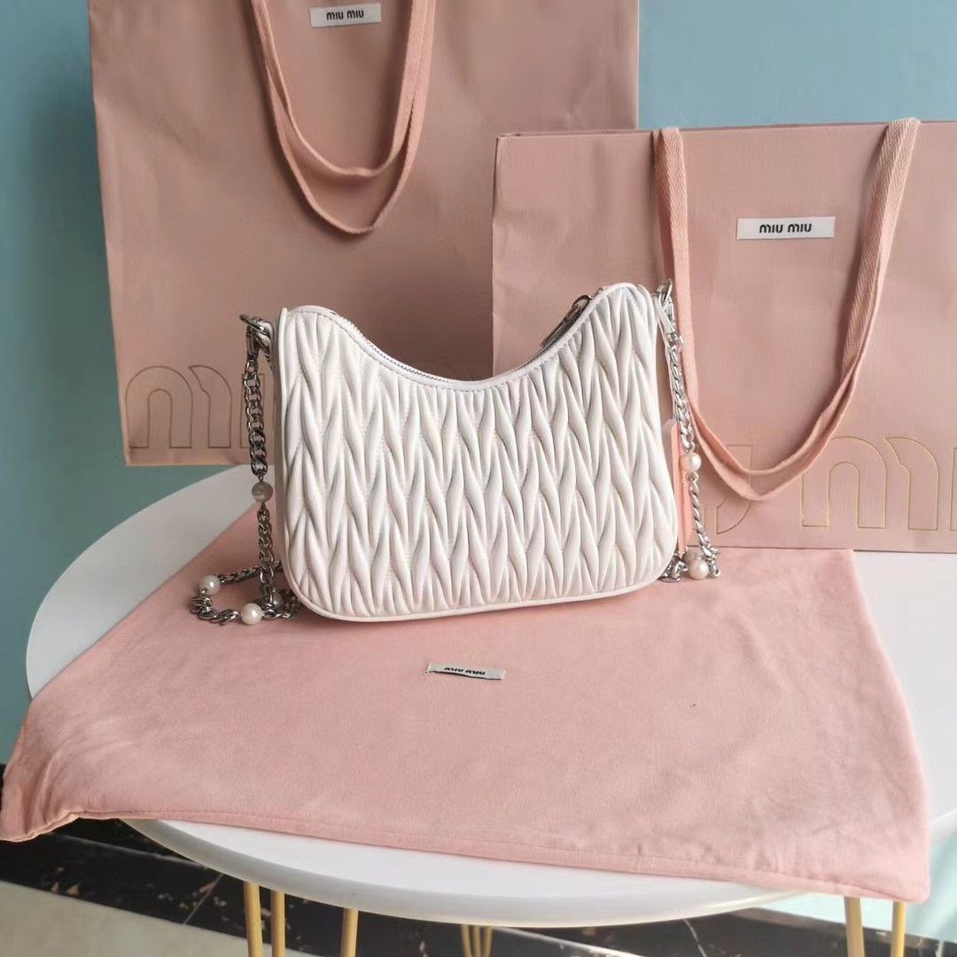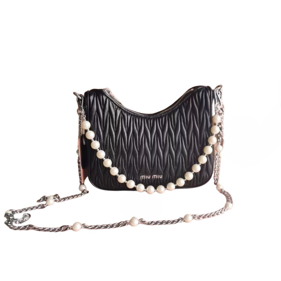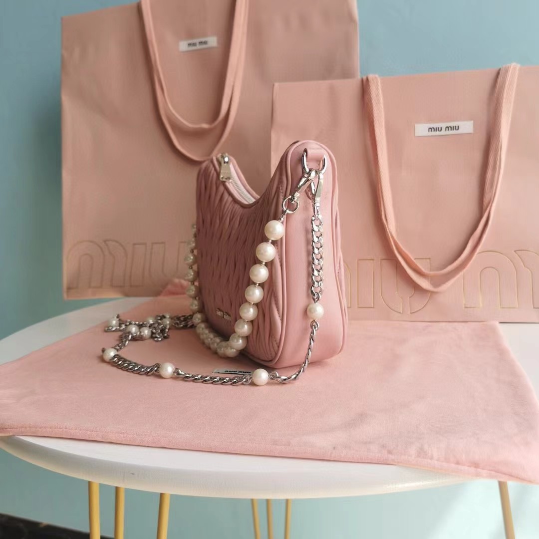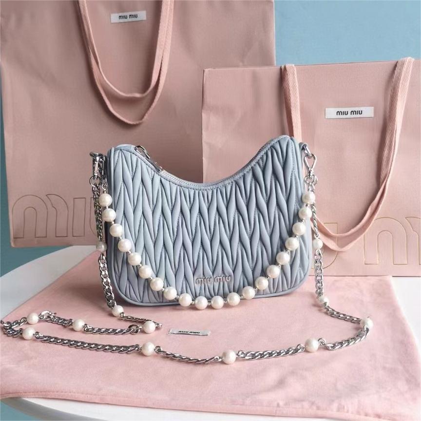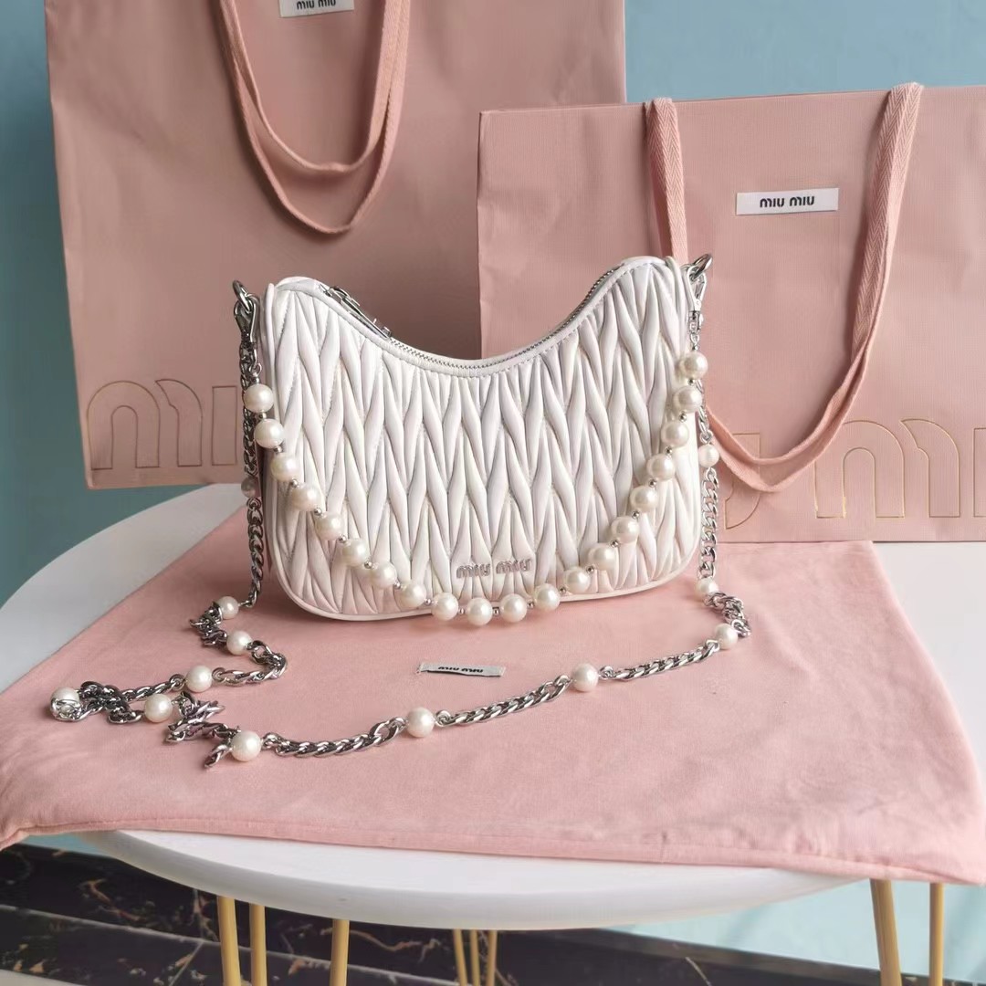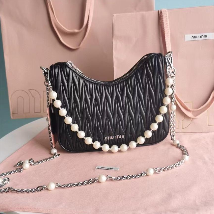 【MiuMiu缪缪】新一季Miu 配饰系列手袋,标志性Matelasse绣花小羊皮材质,Miu家独有设计,珍珠装饰的华美肩带彰显别具一格的特色,包身设计流露出精致优雅的格调,正面饰有金属刻字徽标,拉链拉合,缎面和软羊革口袋!