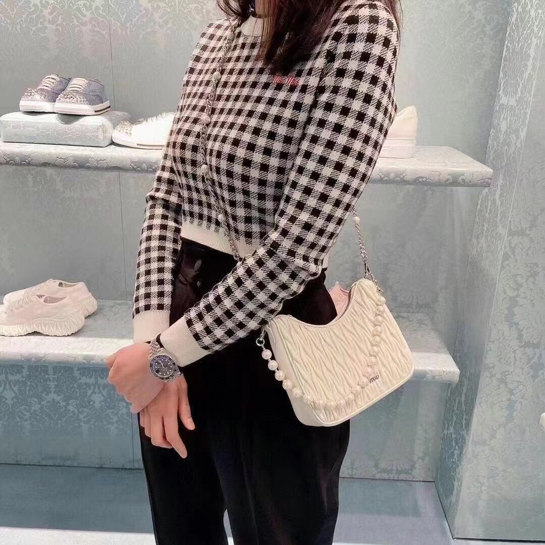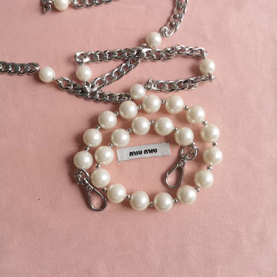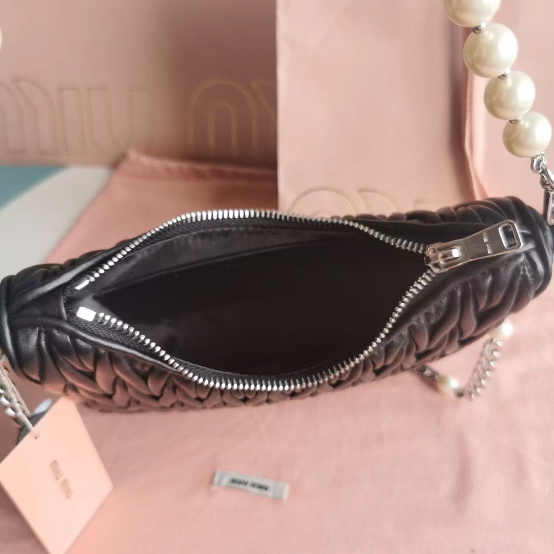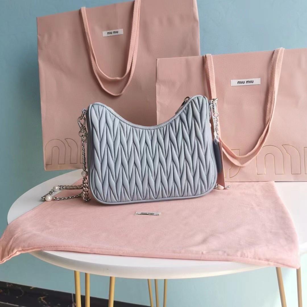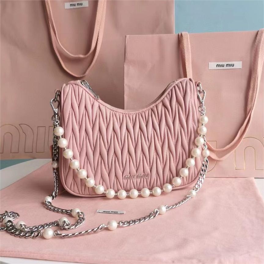 【MiuMiu缪缪】新一季Miu 配饰系列手袋,标志性Matelasse绣花小羊皮材质,Miu家独有设计,珍珠装饰的华美肩带彰显别具一格的特色,包身设计流露出精致优雅的格调,正面饰有金属刻字徽标,拉链拉合,缎面和软羊革口袋!