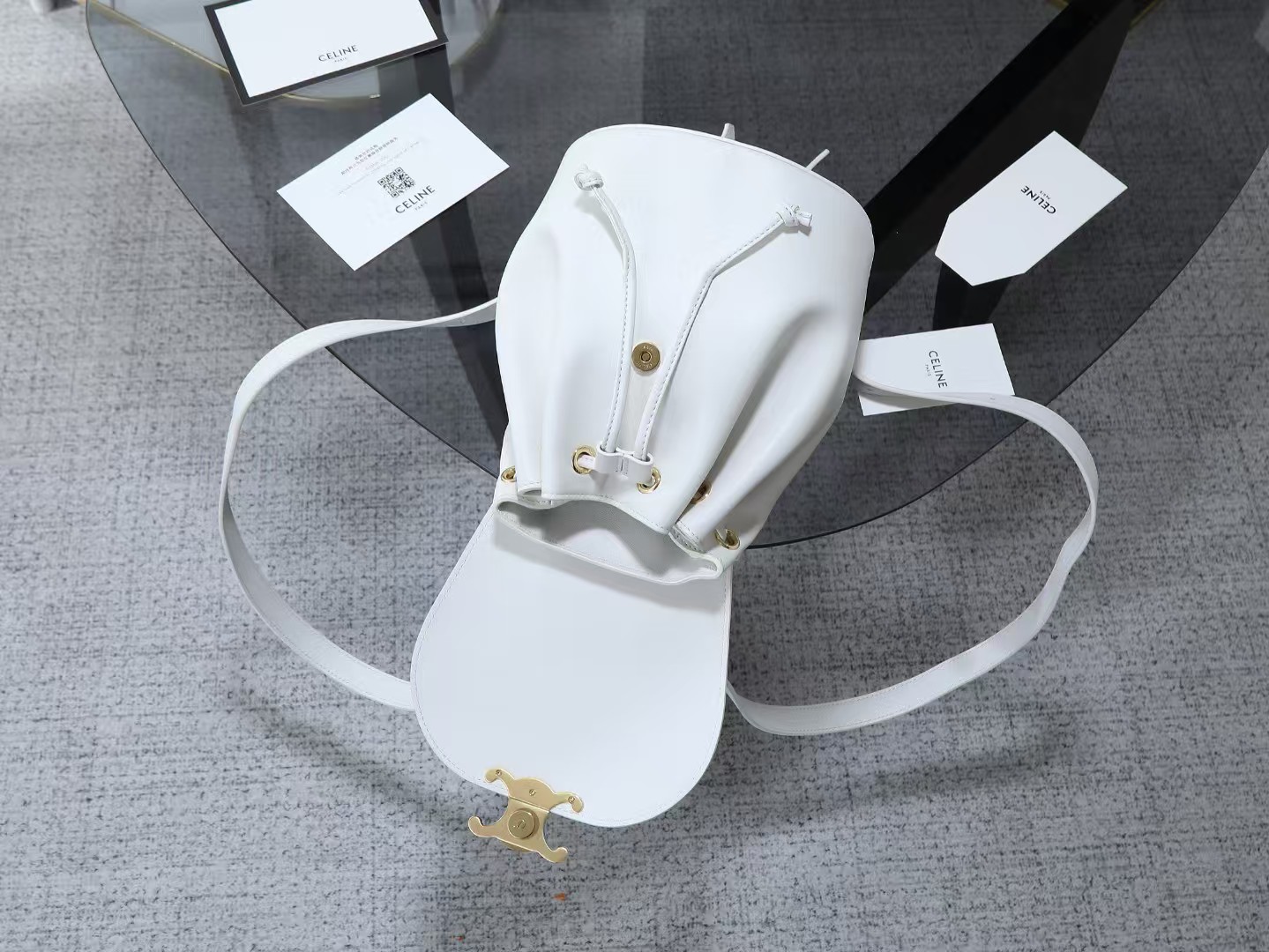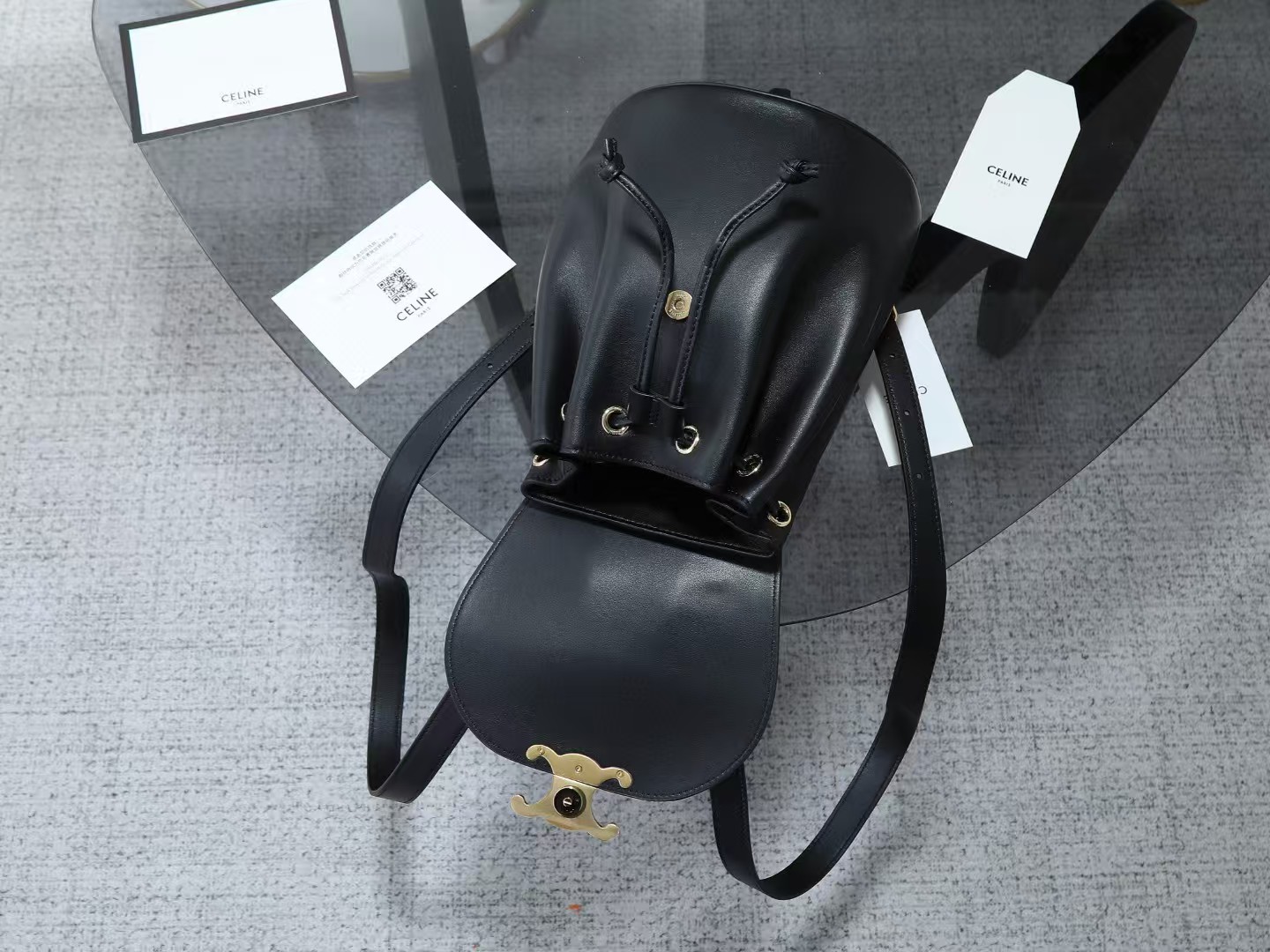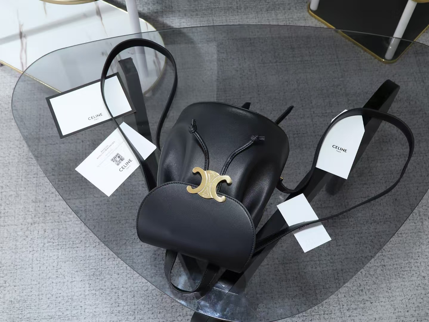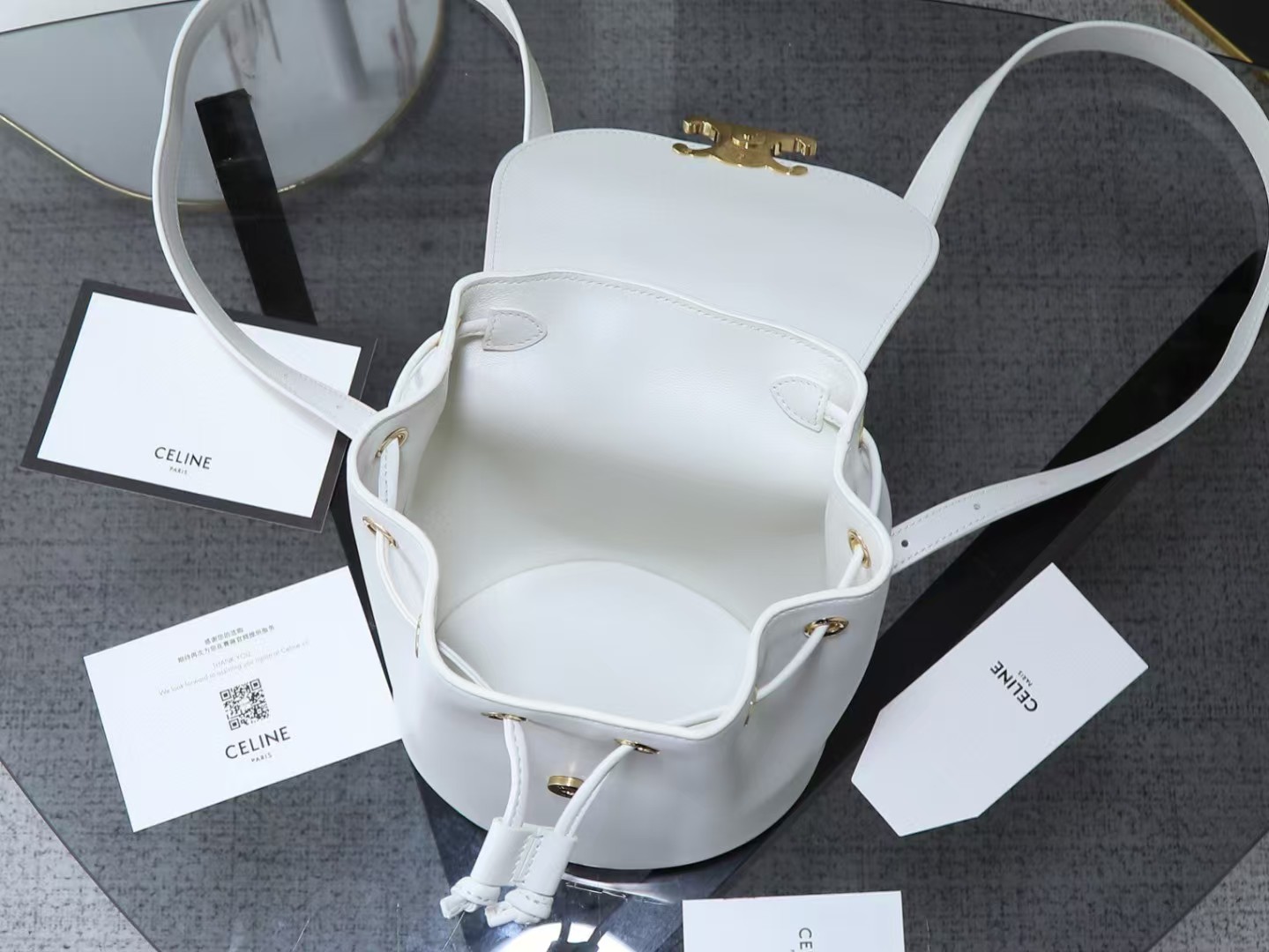【介绍】 CELINE BONNIE光滑牛皮革背包,羊皮革衬里,手提、双肩背和单肩背,TRIOMPHE磁扣,抽绳皮革系带,皮革提手 ,长度8cm,可调节肩带,最小长度34cm,最大长度45cm。