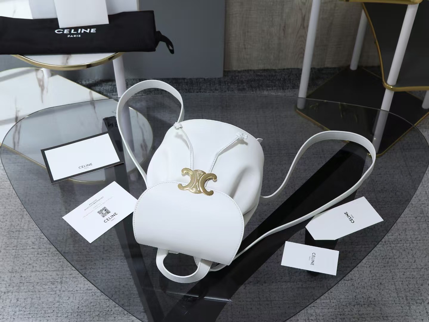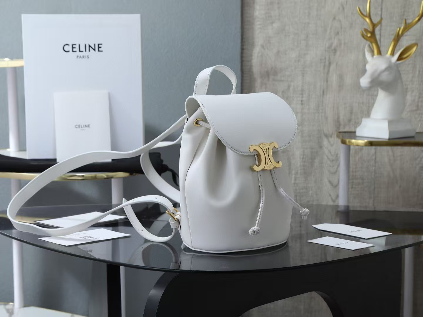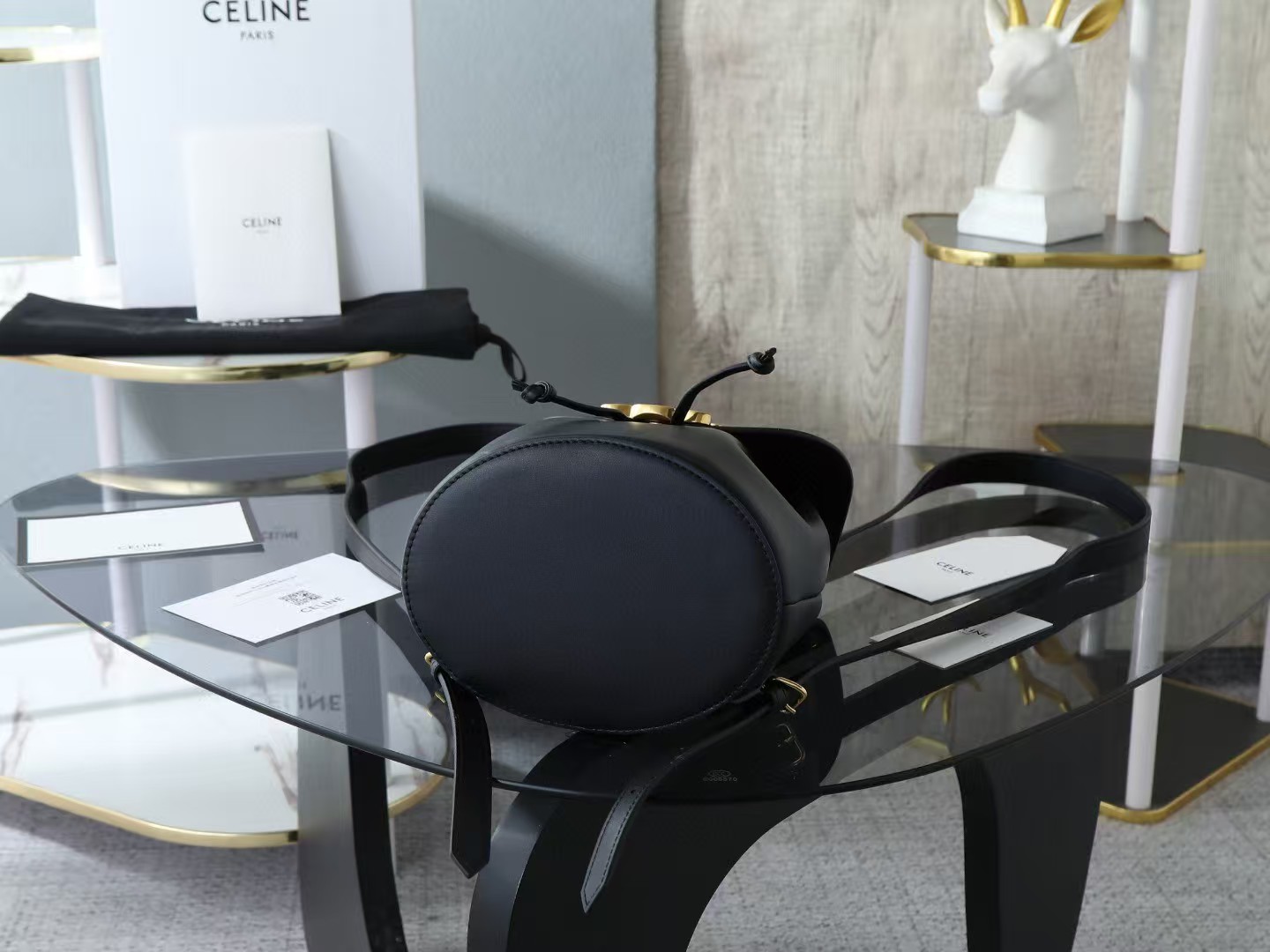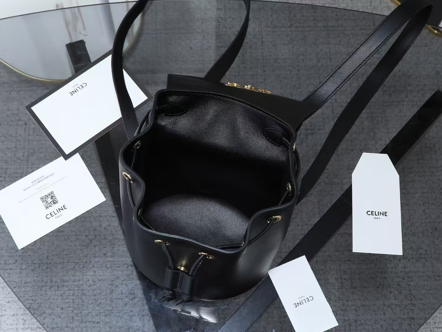 【介绍】 CELINE BONNIE光滑牛皮革背包,羊皮革衬里,手提、双肩背和单肩背,TRIOMPHE磁扣,抽绳皮革系带,皮革提手 ,长度8cm,可调节肩带,最小长度34cm,最大长度45cm。