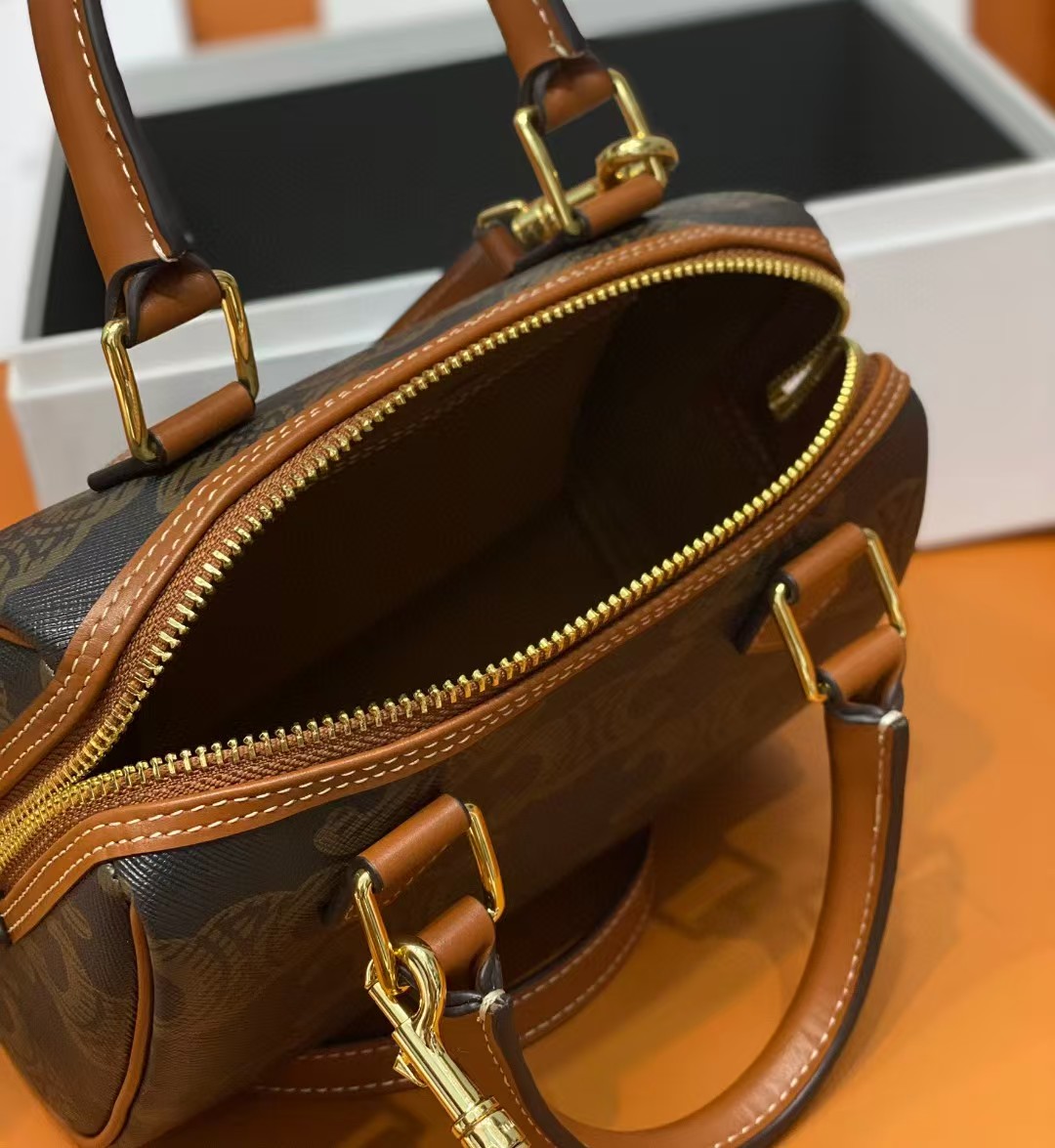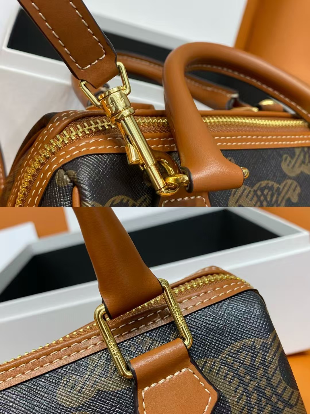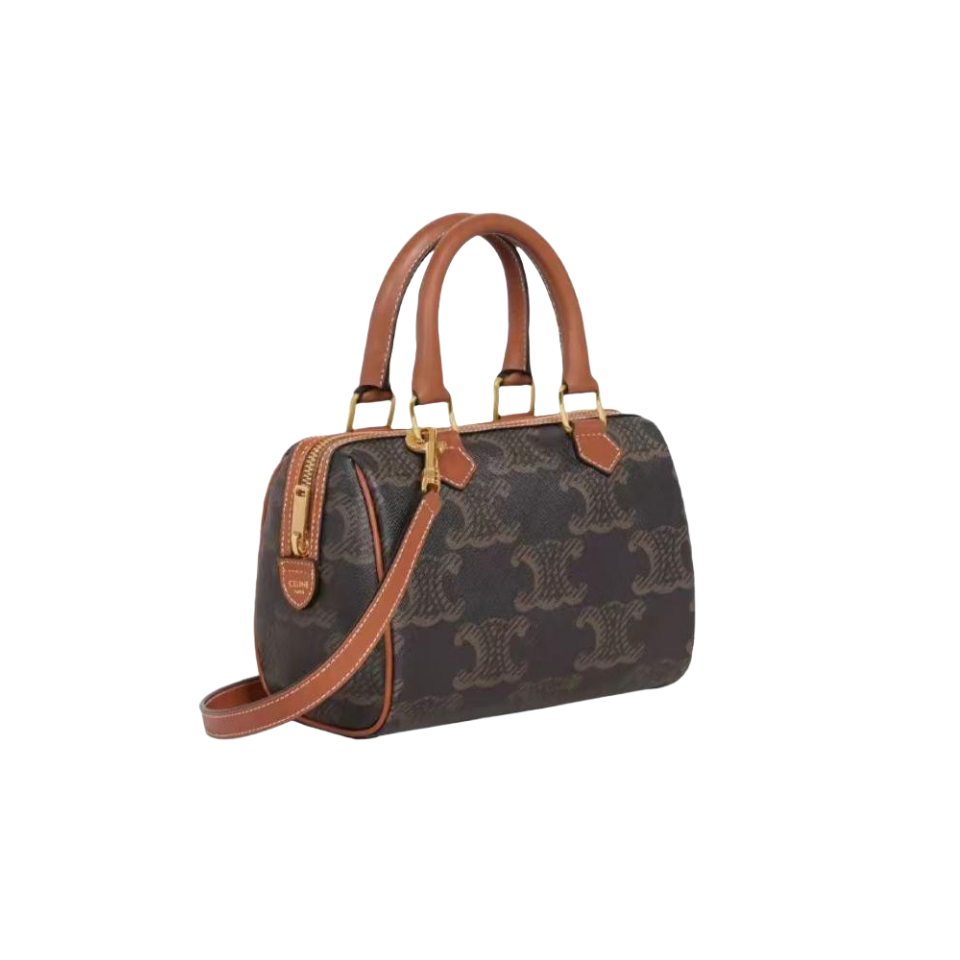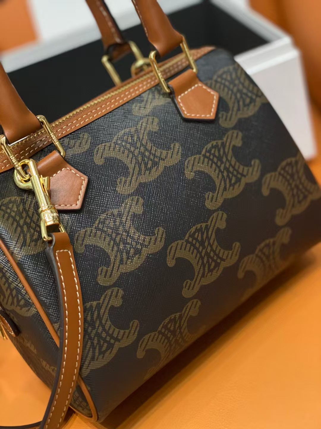 【介绍】 新品标志大印花牛皮革波士顿包,大花logo,TRIOMPHE CANVAS标志印花,牛皮革包边,织物面料衬里,拉链锁闭,1个主隔层,内侧拉链口袋。