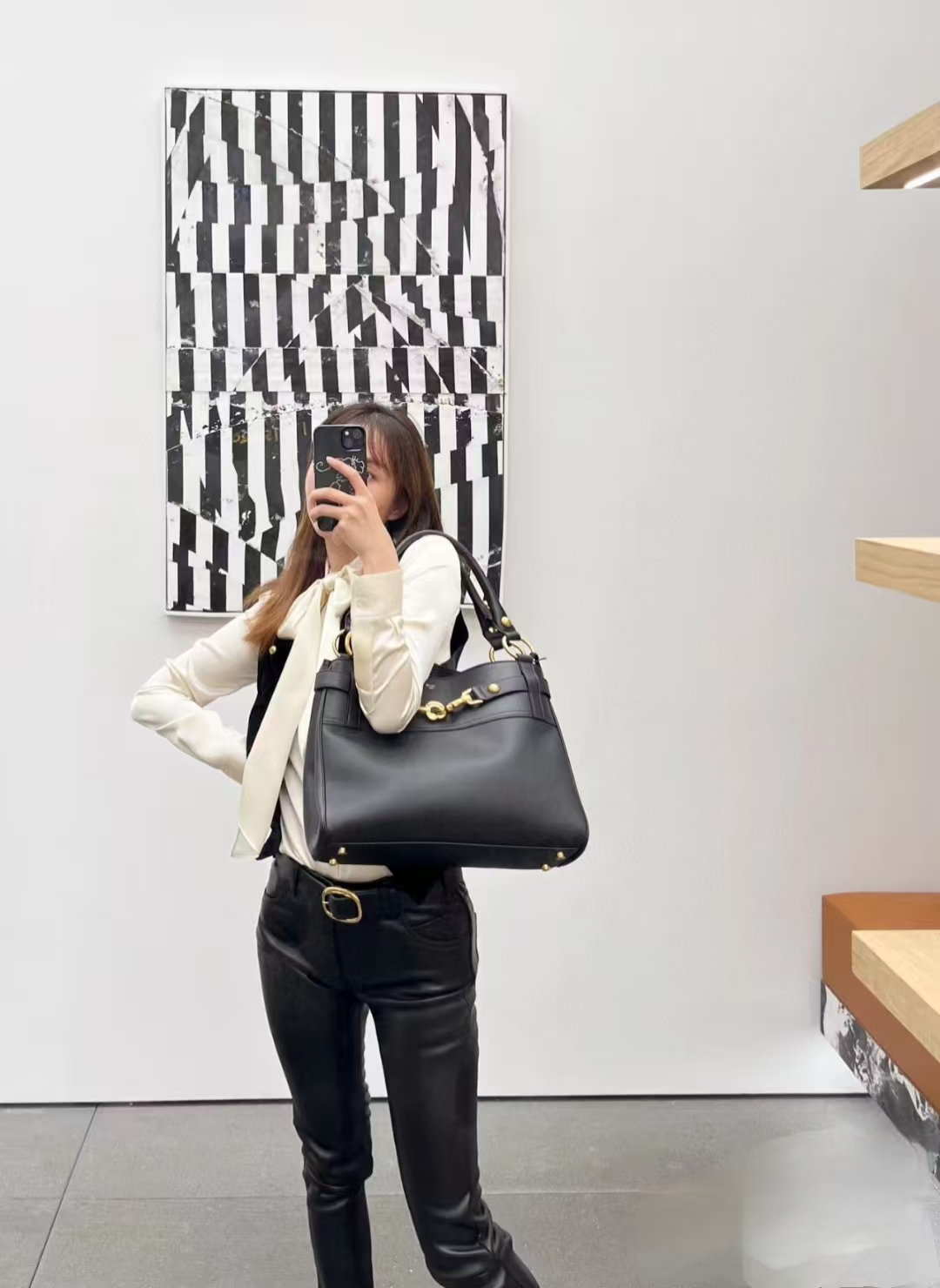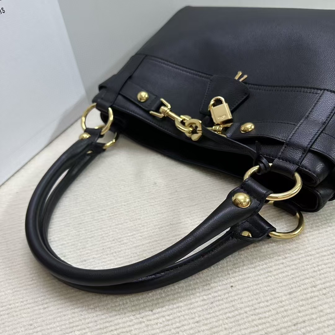 【介绍】 新品 23 ANNABEL 秋冬新款牛皮手袋 ,简约外形,搭配其流线型的圆弧设计,充满浓浓的高端气息,自带复古贵族名流风,贵气十足!包包牛皮➕羊皮里衬,可肩背可手拎 ,功能性皮革束带搭配金属钩扣和按扣,内设2个主隔层,1个内侧中央拉链口袋,1个内侧扁平口袋,配挂锁。