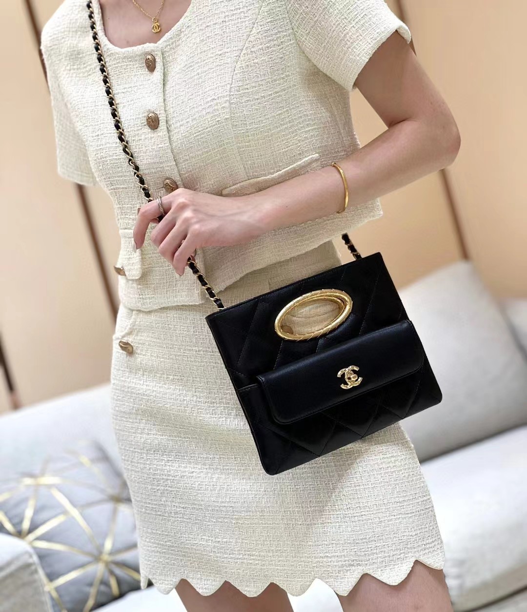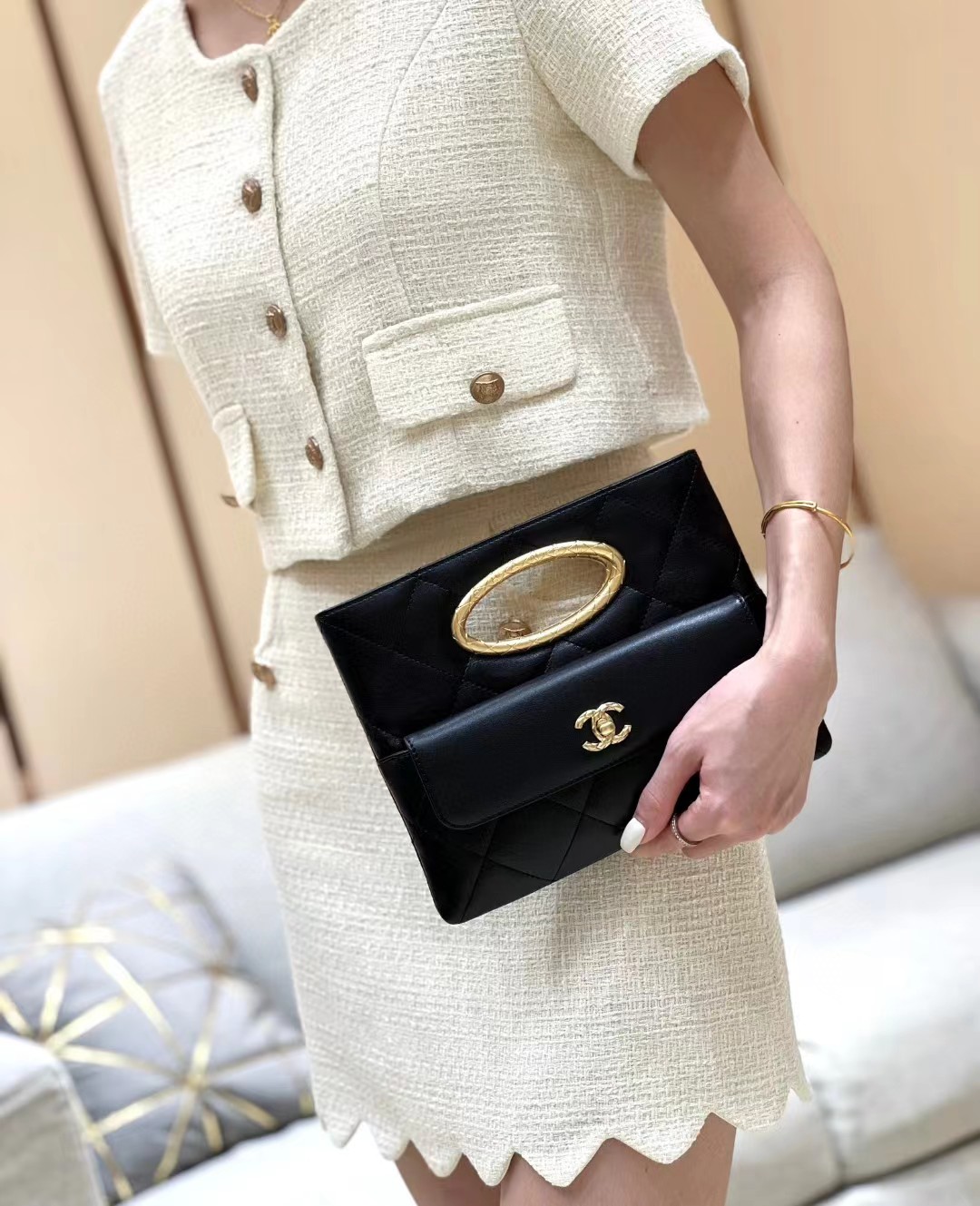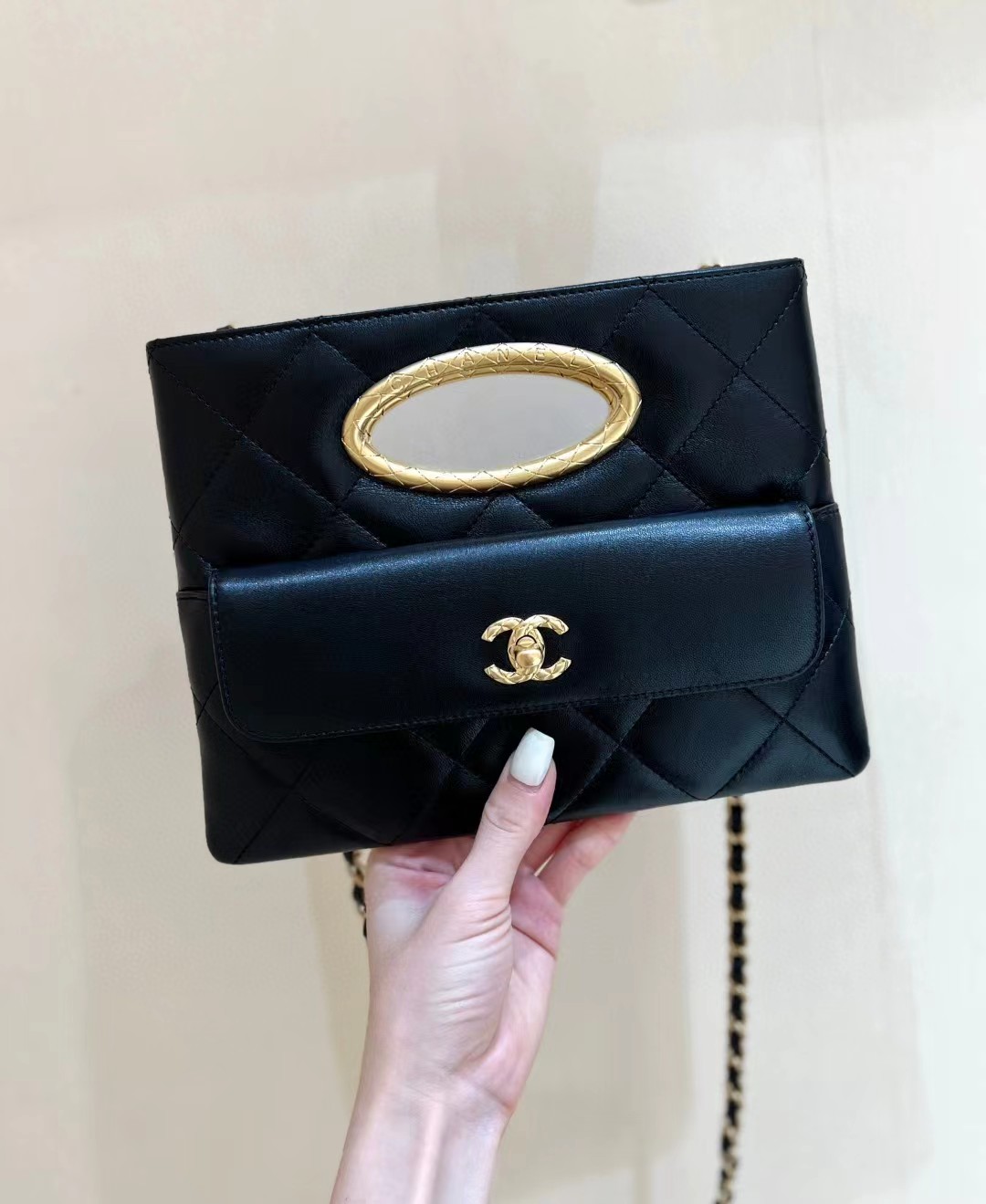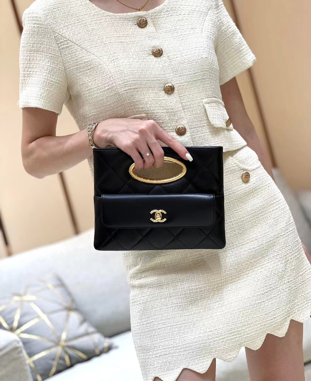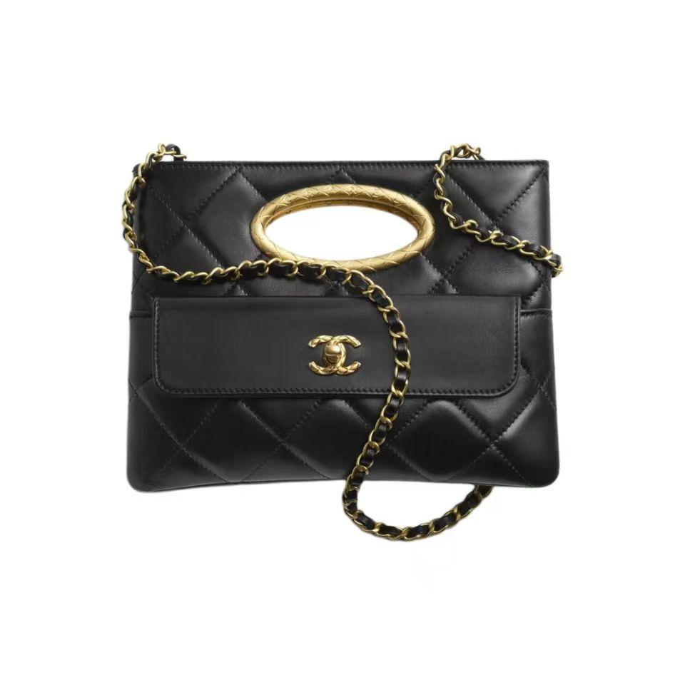 【介绍】 24B 秋冬系列。Chanel 24B包王,clutch小香黑金晚宴包,手柄的格纹像coco crush更古法的质感,非常特别的一只,精致的设计风格。