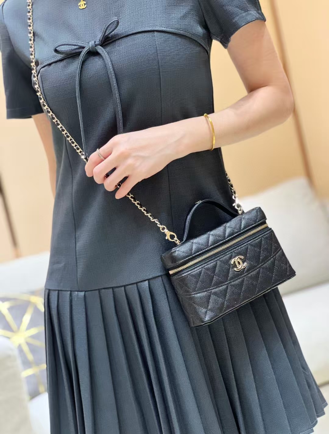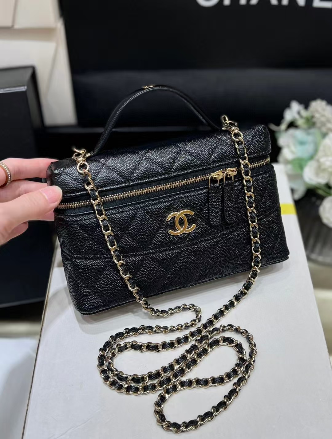 香奈儿这款我想买好久了,黑色经典百搭,配啥都好好看,包的质感我爱了,荔枝纹真的绝,有耐磨又能装!!