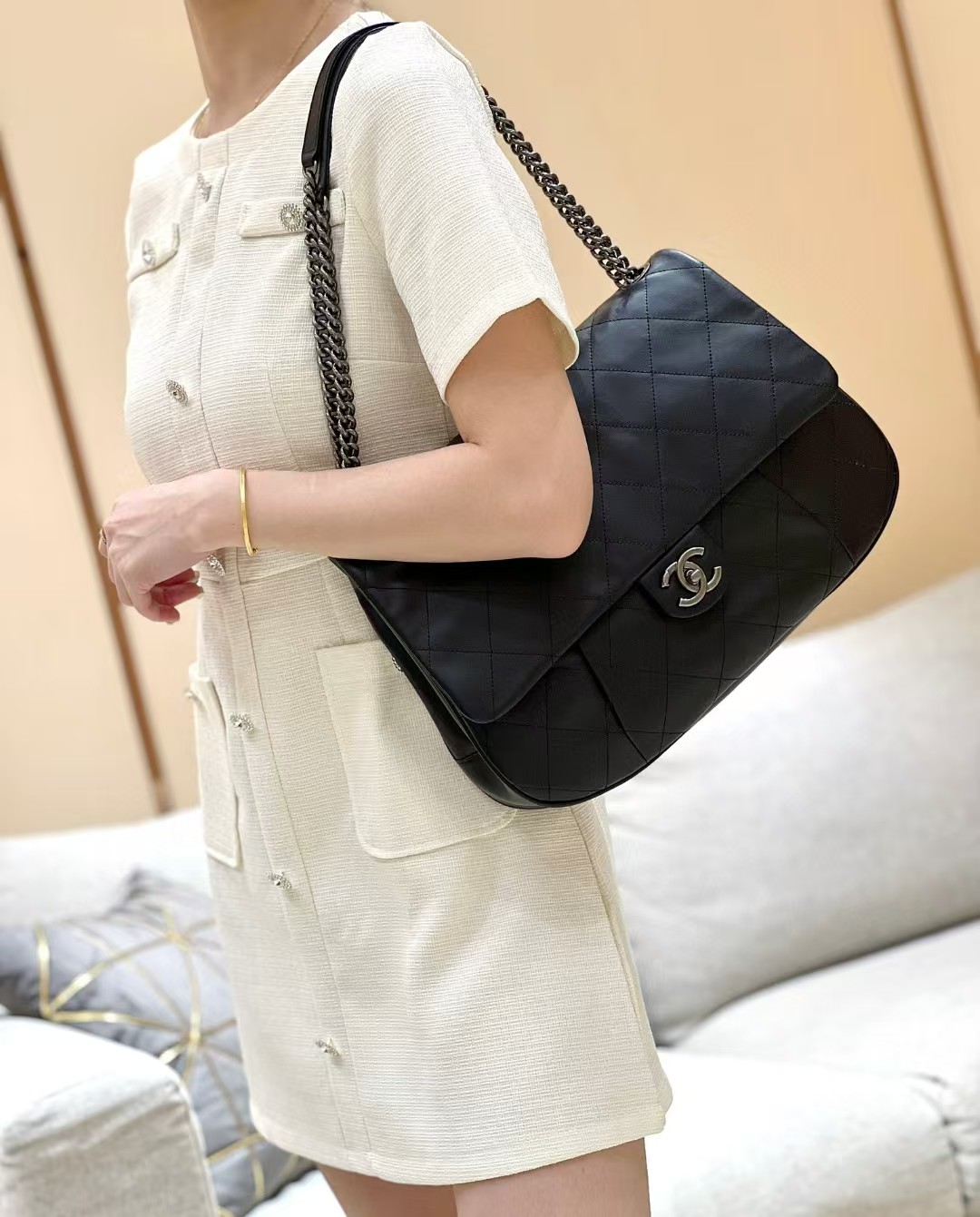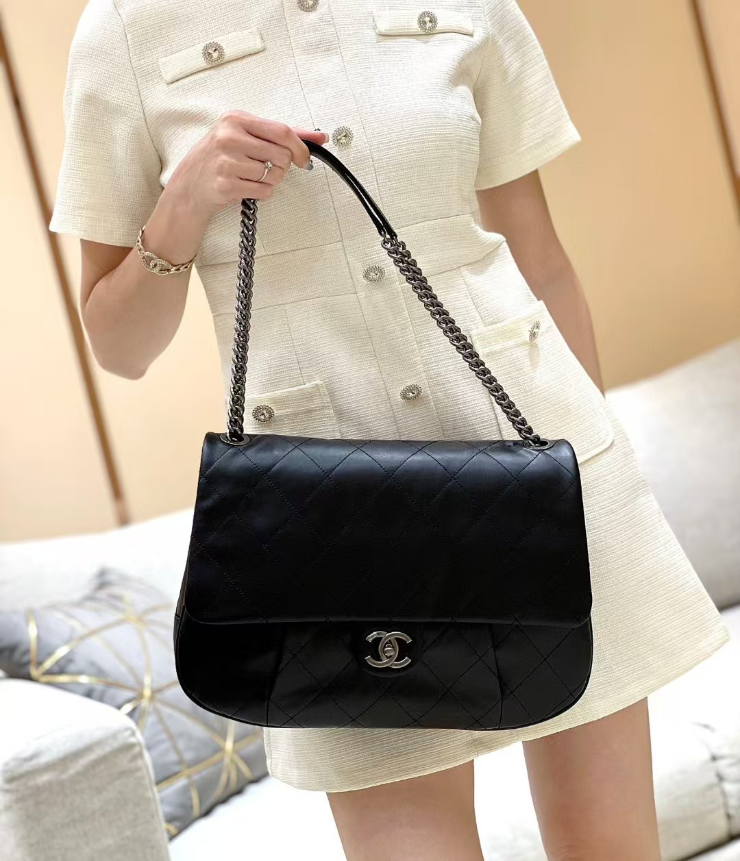 香奈儿这款我想买好久了,黑色经典百搭,配啥都好好看,包的质感我爱了,荔枝纹真的绝,有耐磨又能装!!