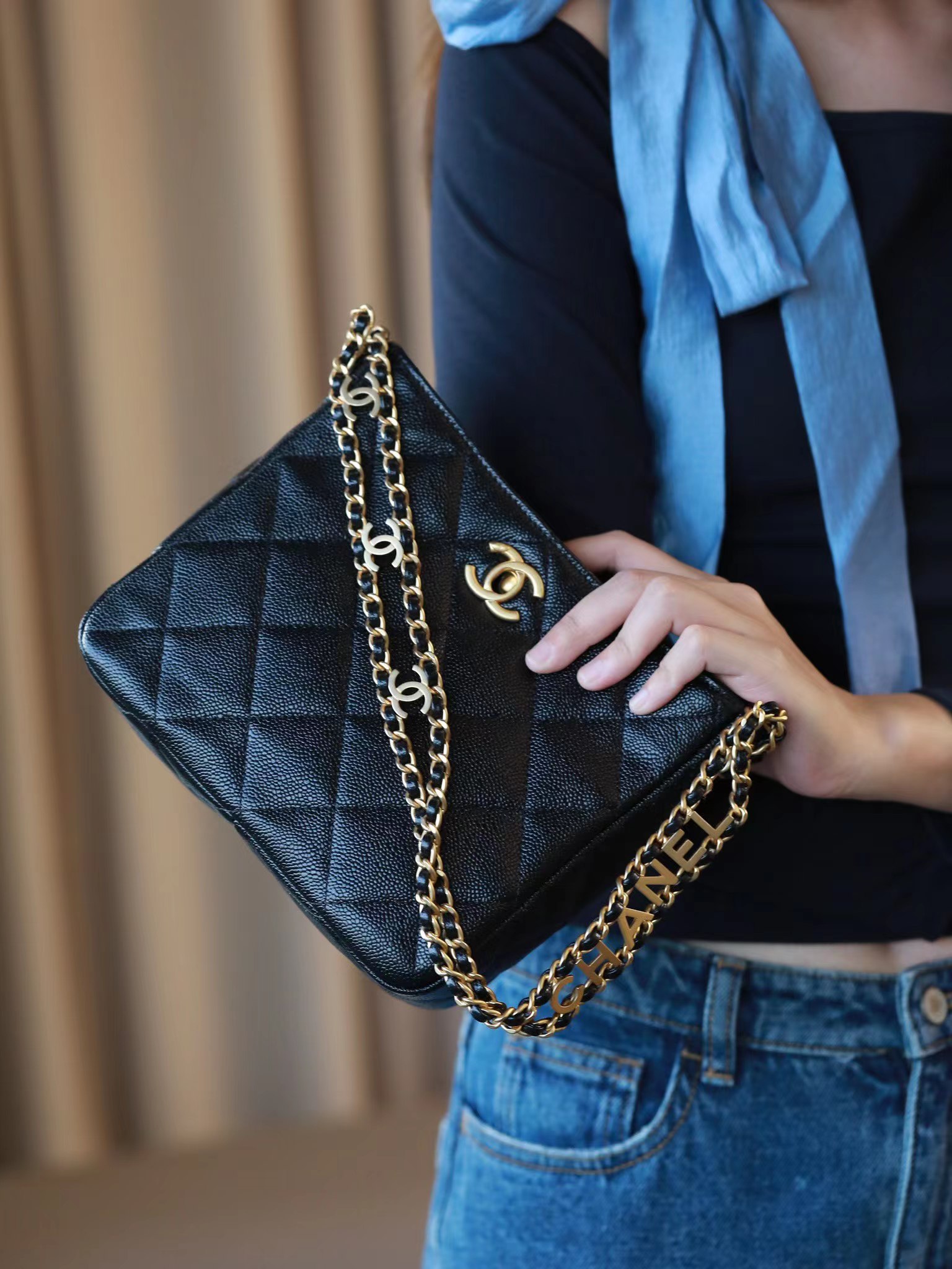 香奈儿这款我想买好久了,黑色经典百搭,配啥都好好看,包的质感我爱了,荔枝纹真的绝,有耐磨又能装!!