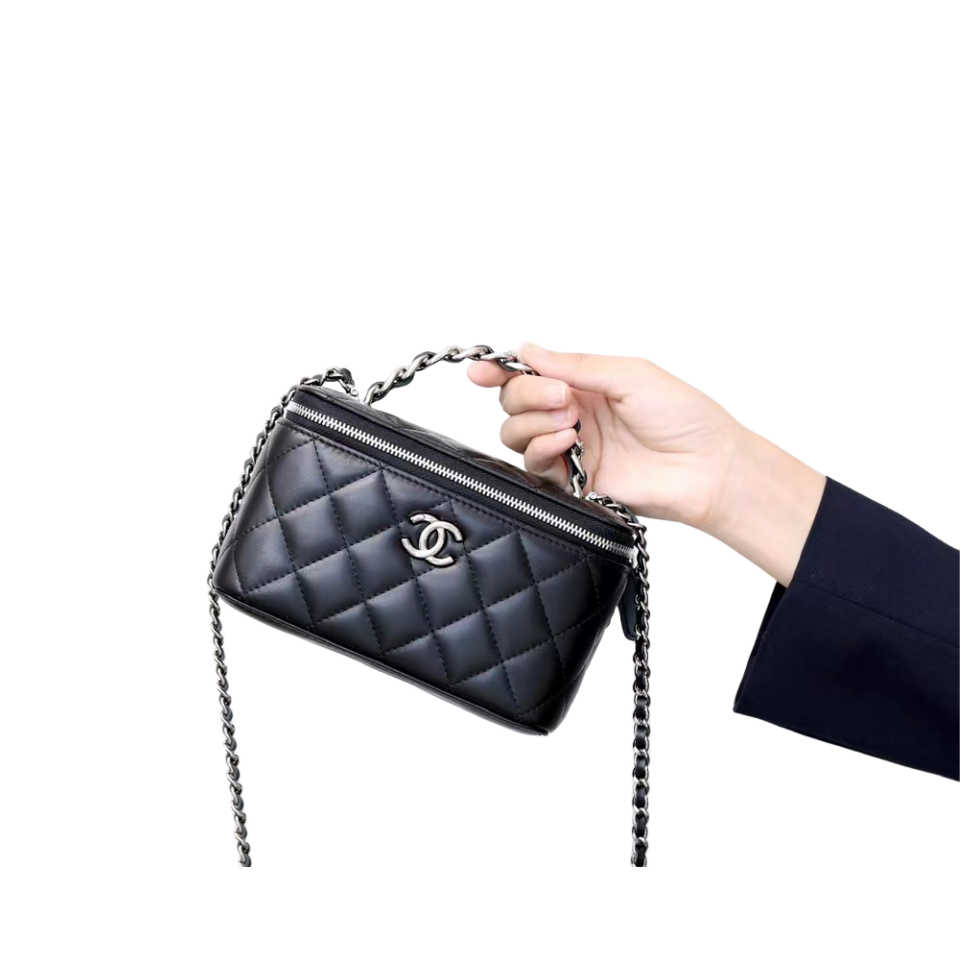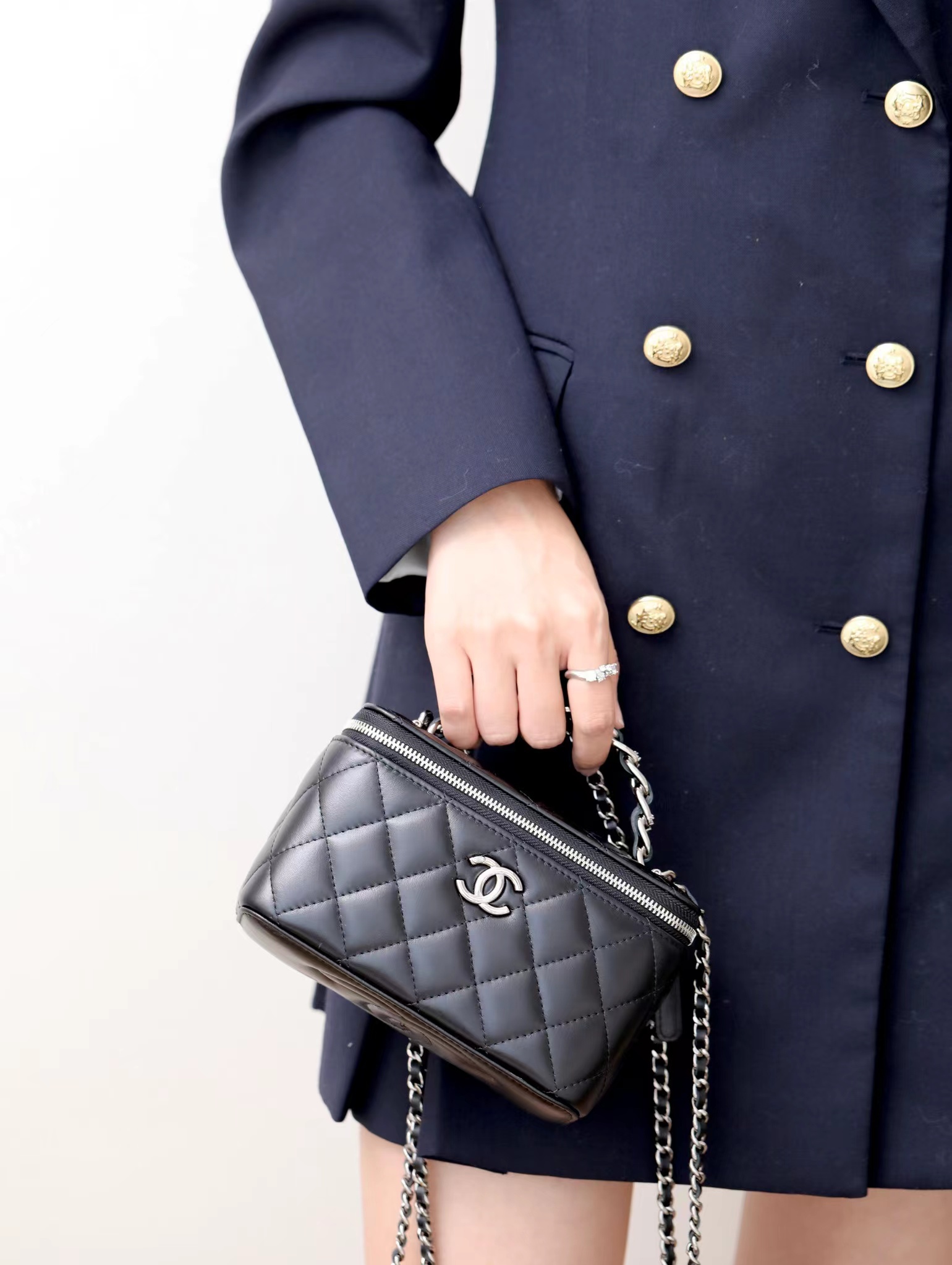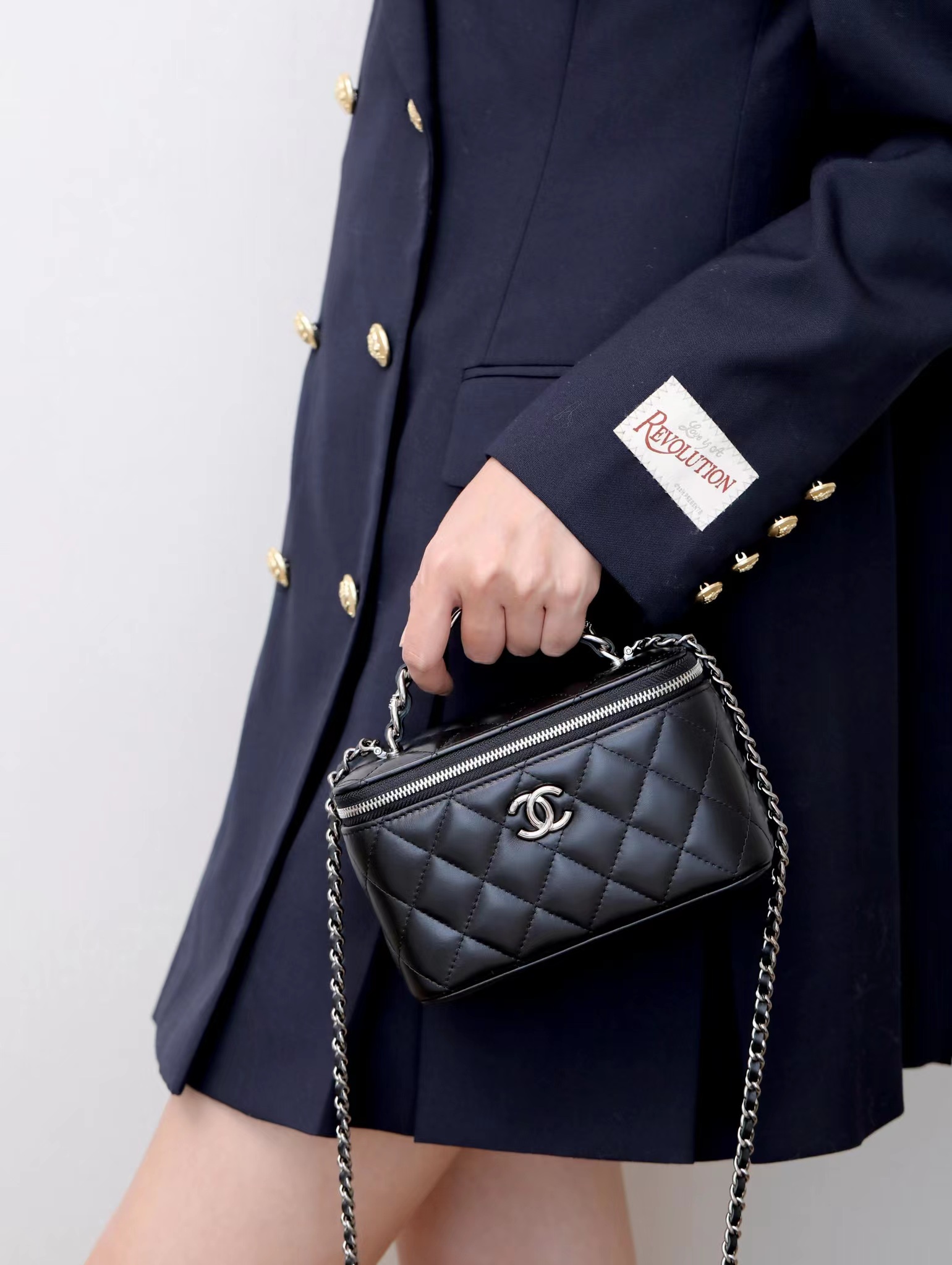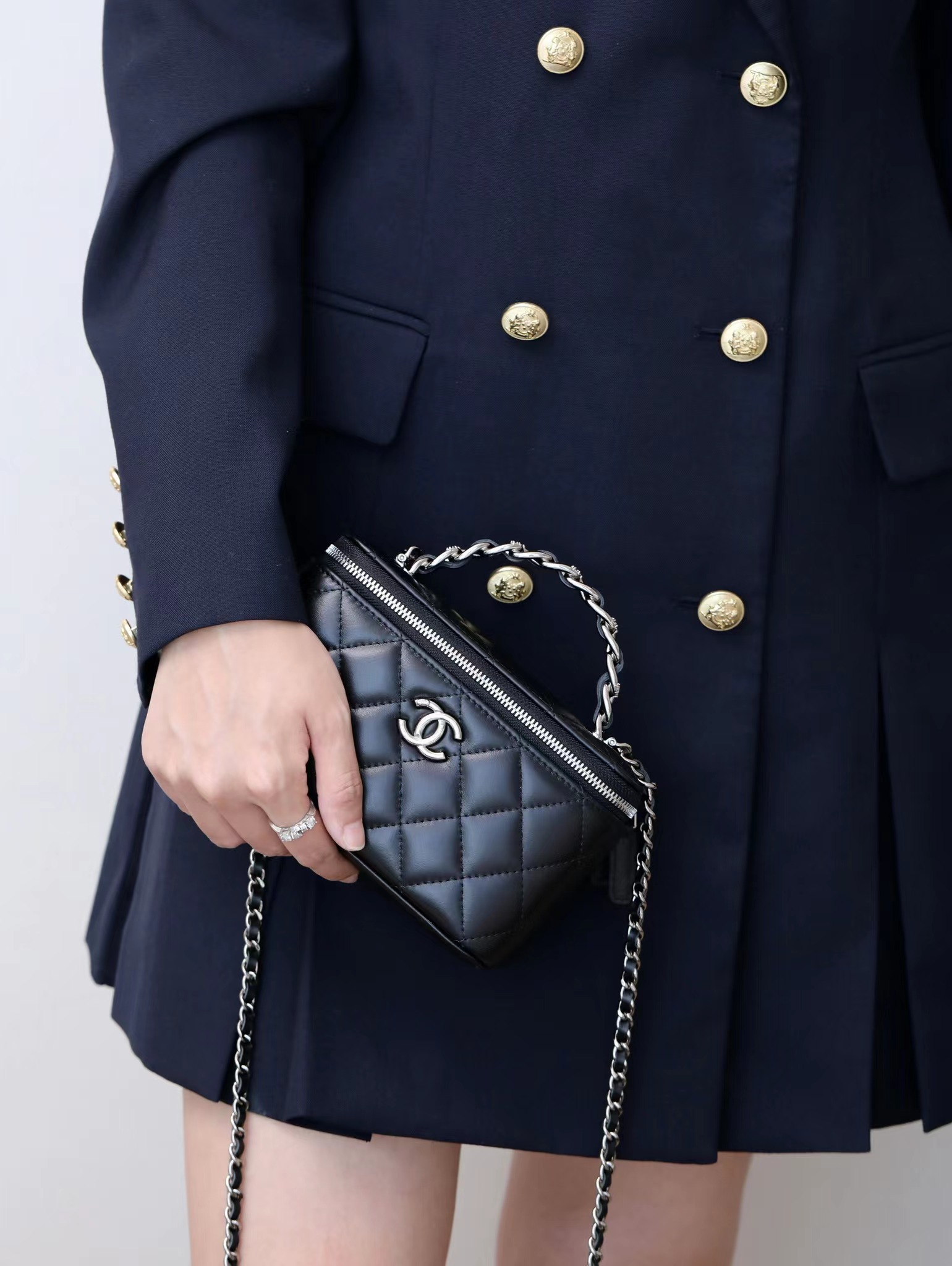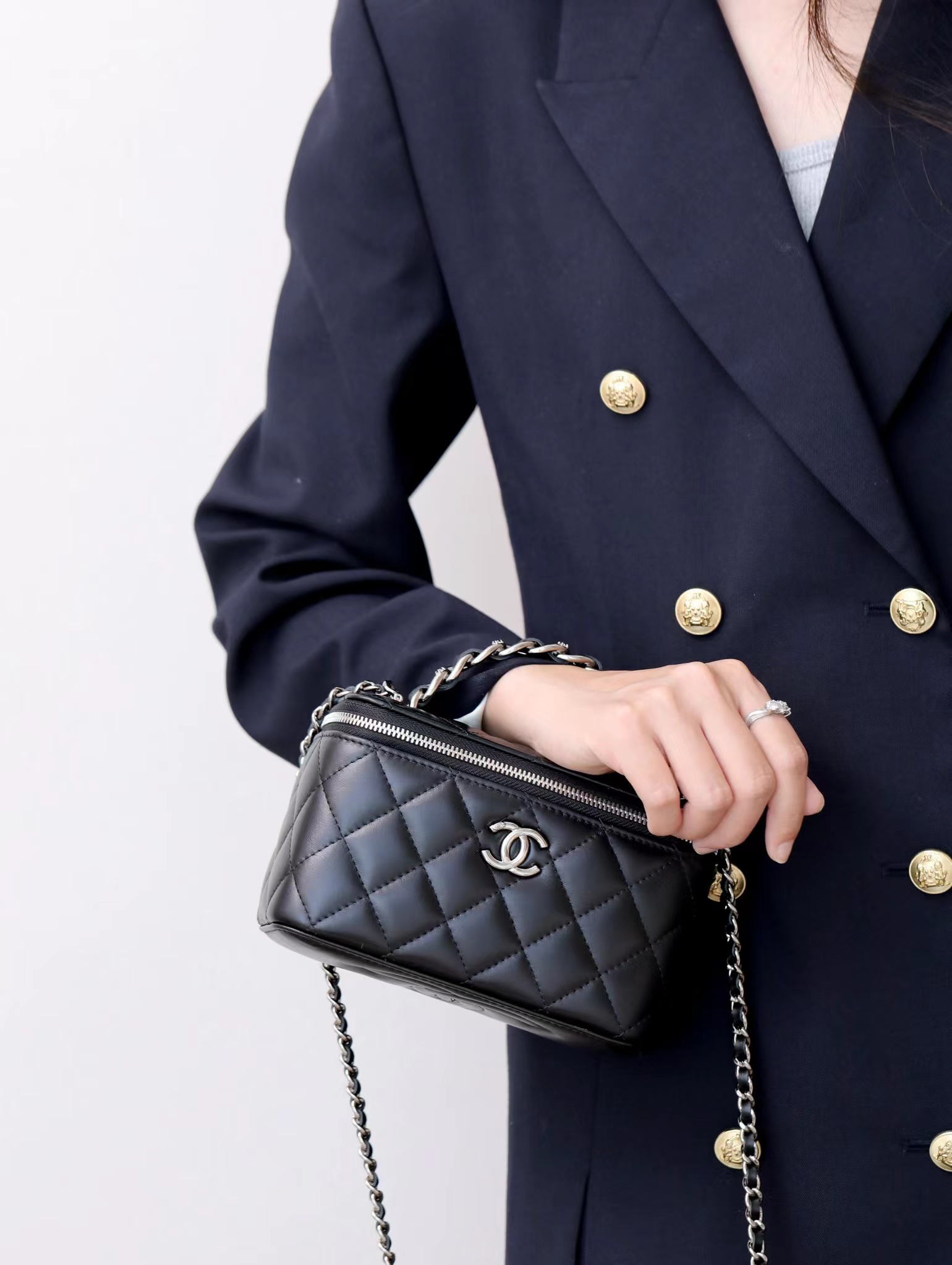 cha 金属手腕长盒子,小红书种草冠军 ,黑色搭配枪扣的手柄,方便手拎,链条的长度刚好斜挎 ,口红包如果是时尚达人必备的一款的话 ,那么这款长盒子也是必不可少的 ,主要能容下手机